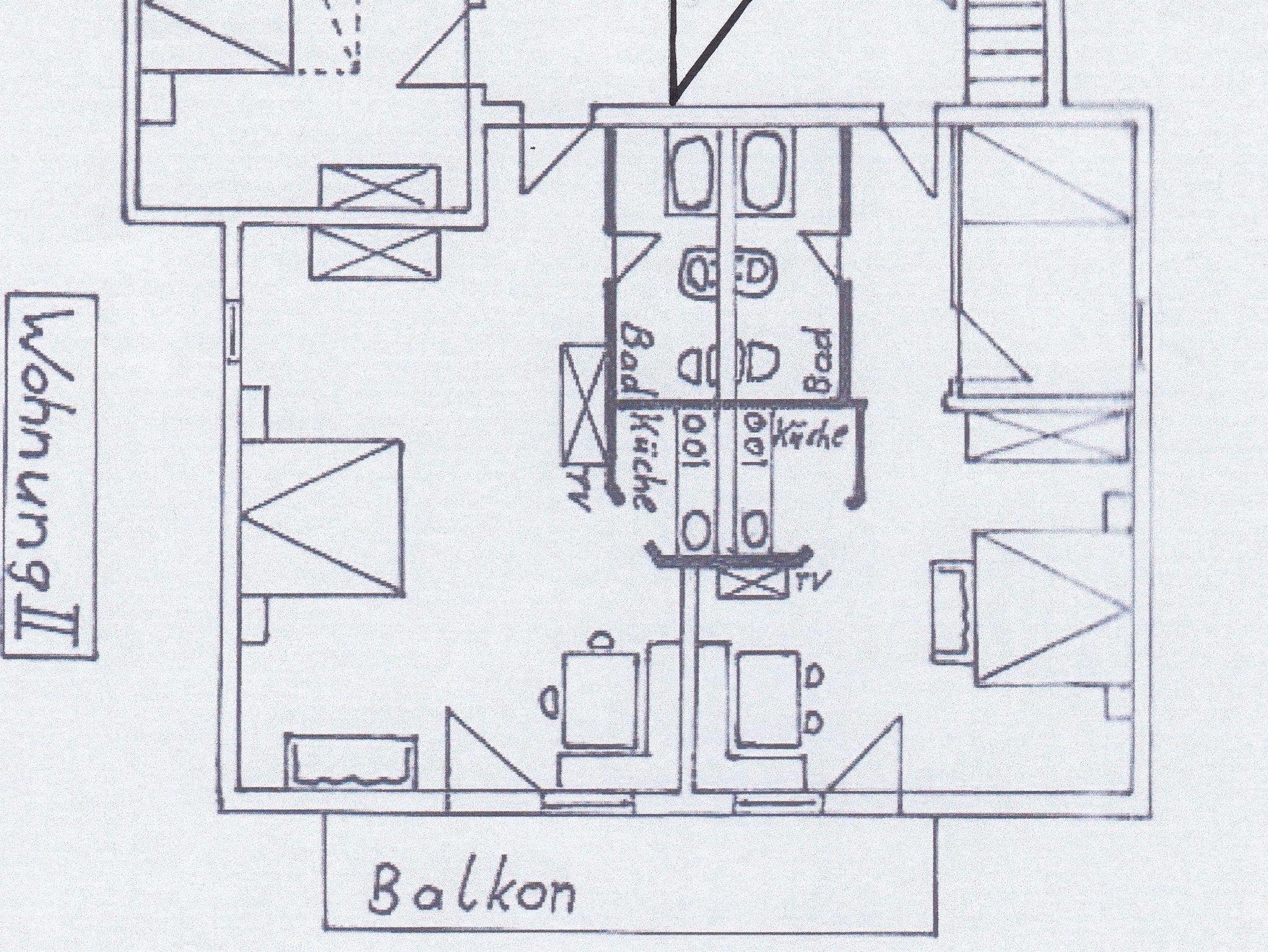 Wohnschlafraum (Sofa, Sitzbank, Tisch, Doppelbett und Schränke), Bad und Kochecke, ein Schlafzimmer extra mit Doppelbett.