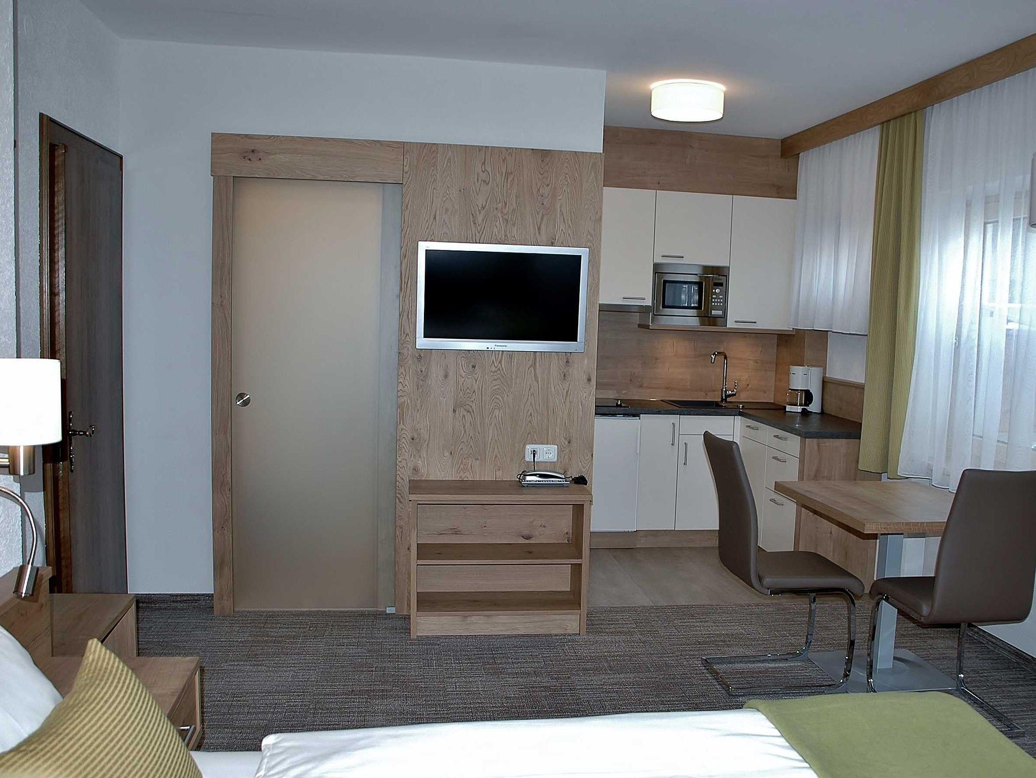 Helles Einraum-Appartement (ca. 30 m²) mit Morgensonne und Blick über Bach und Wiesen zum Neunerköpfle. Wohn-Schlafraum mit Doppelbetten, Sitz-und Essecke, Kochnische, Dusche/WC, Ostbalkon, TV/Radio, Telefon.