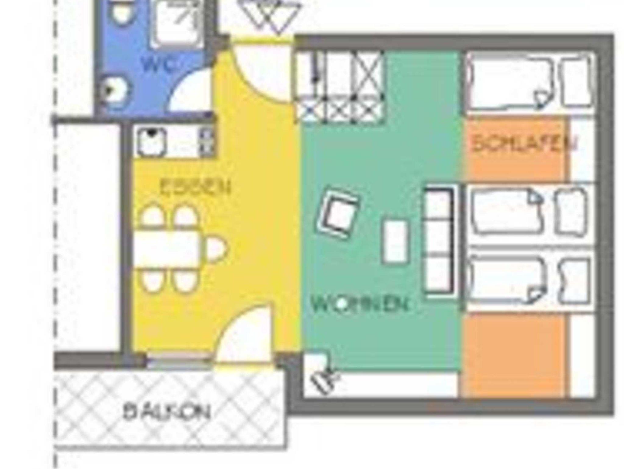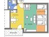 Kleine (35qm), gemütlich eingerichtete Wohnung mit Wohn-Schlafraum im 2. Stock mit optisch abgetrenntem Schlafbereich, Miniküche, DU/WC und Ostbalkon.