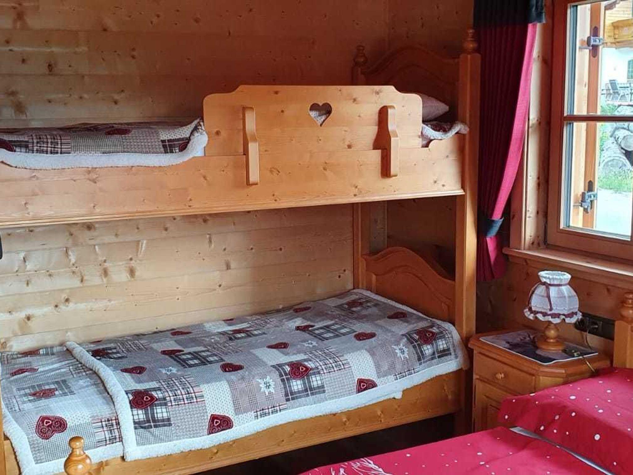 Geräumige Dusche in zeitgemäßer Ausführung mit Außenfenster, WC seperat mit Außenfenster. Hochwertige Einbauküche mit geräumigem Esszimmer. Wohnzimer mit direktem Ausgang zur Terrasse und Blick auf die Berge. Im Schlafzimmer befindet sich ein Doppelbett und ein Hochbett.