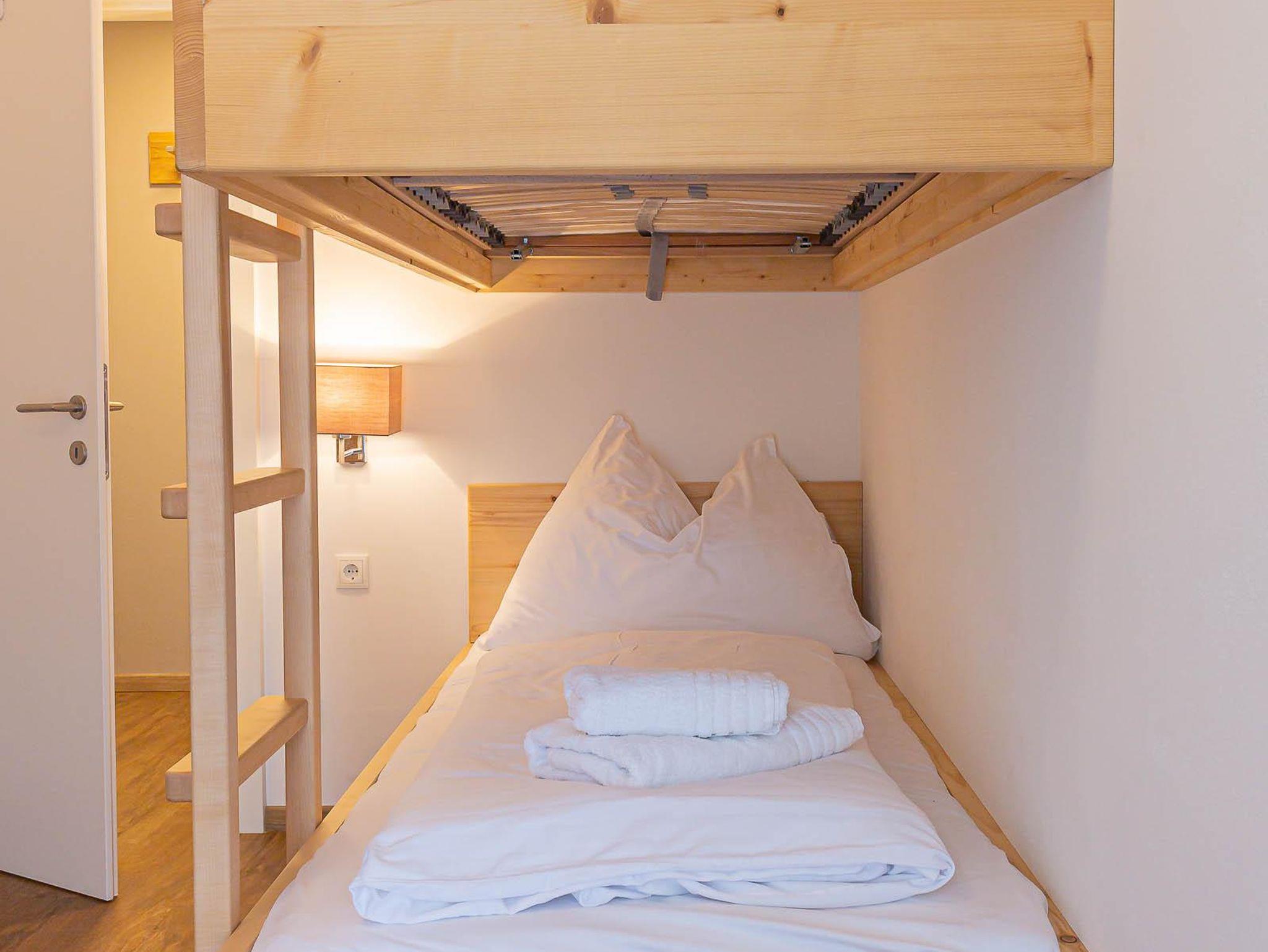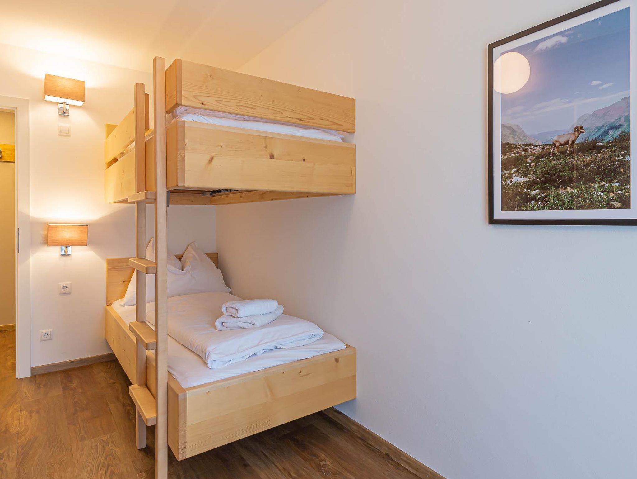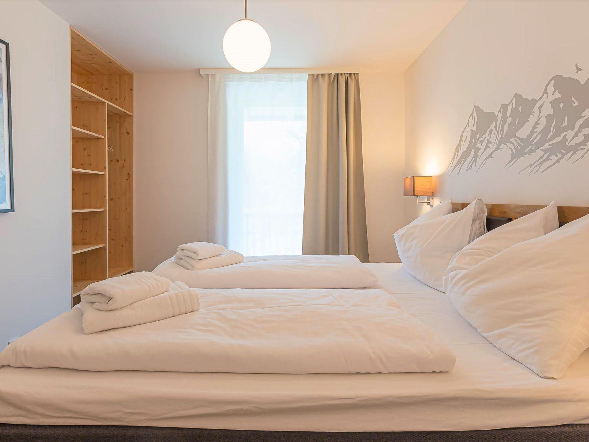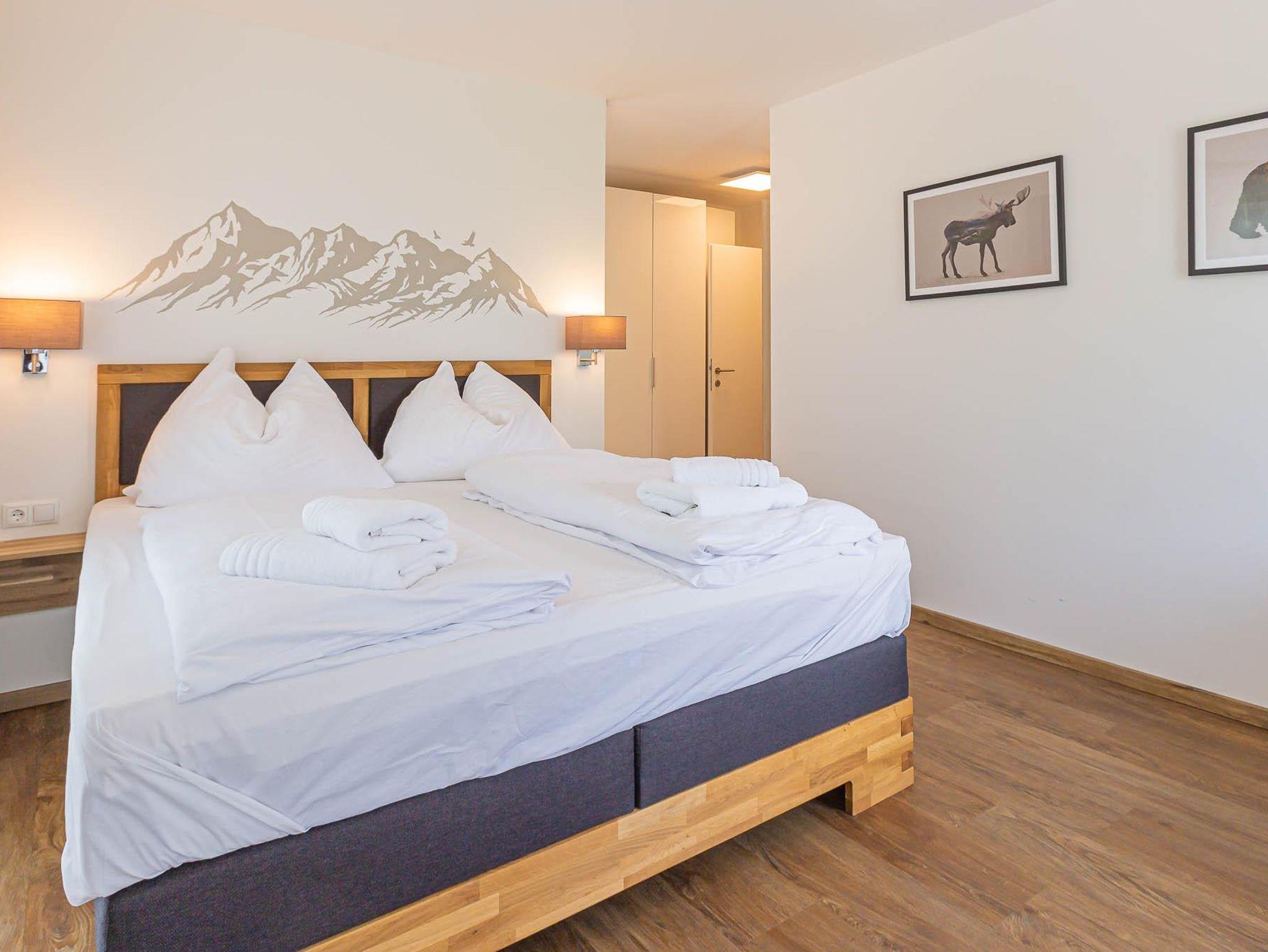 Willkommen in Ihrer Ferienwohnung! Die Wohnung bietet ein Schlafzimmer mit Etagenbett und Schrank, ein Schlafzimmer mit Doppelbett und Schrank sowie ein Schlafzimmer mit eigenem Duschbad (WC im angrenzenden Raum). Der großzügige Wohnbereich verfügt über ein bequemes Sofa und einen Fernseher. Die offene Küche ist voll ausgestattet mit Herd, Kochfeld, Ofen, Toaster, Kaffeemaschine und allen nötigen Utensilien. Der Essbereich fügt sich harmonisch in den Raum ein. Alle Zimmer teilen sich einen Balkon mit herrlichem Blick auf die Berge – perfekt für Ihren Aufenthalt!