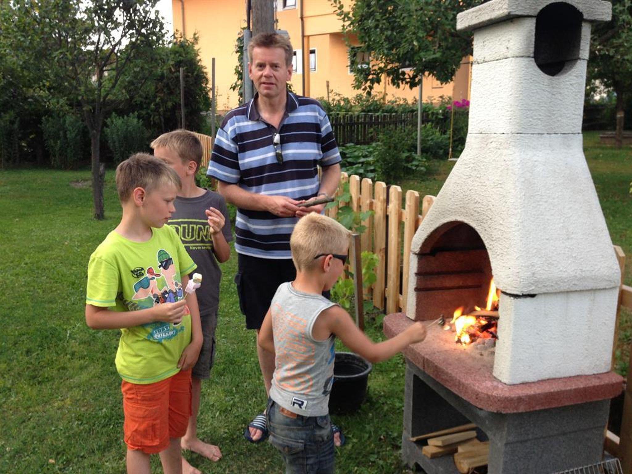 Südseitig gelegener Gästegarten mit überdachter Terrasse, gemütlichen Sitzmöglichkeiten, Liegestühlen, Griller, Tischtennis, Sonnenschirm, sowie Kinderspielplatz mit Schaukel, Trampolin und Sandkiste. Der Radweg führt direkt am Haus vorbei.