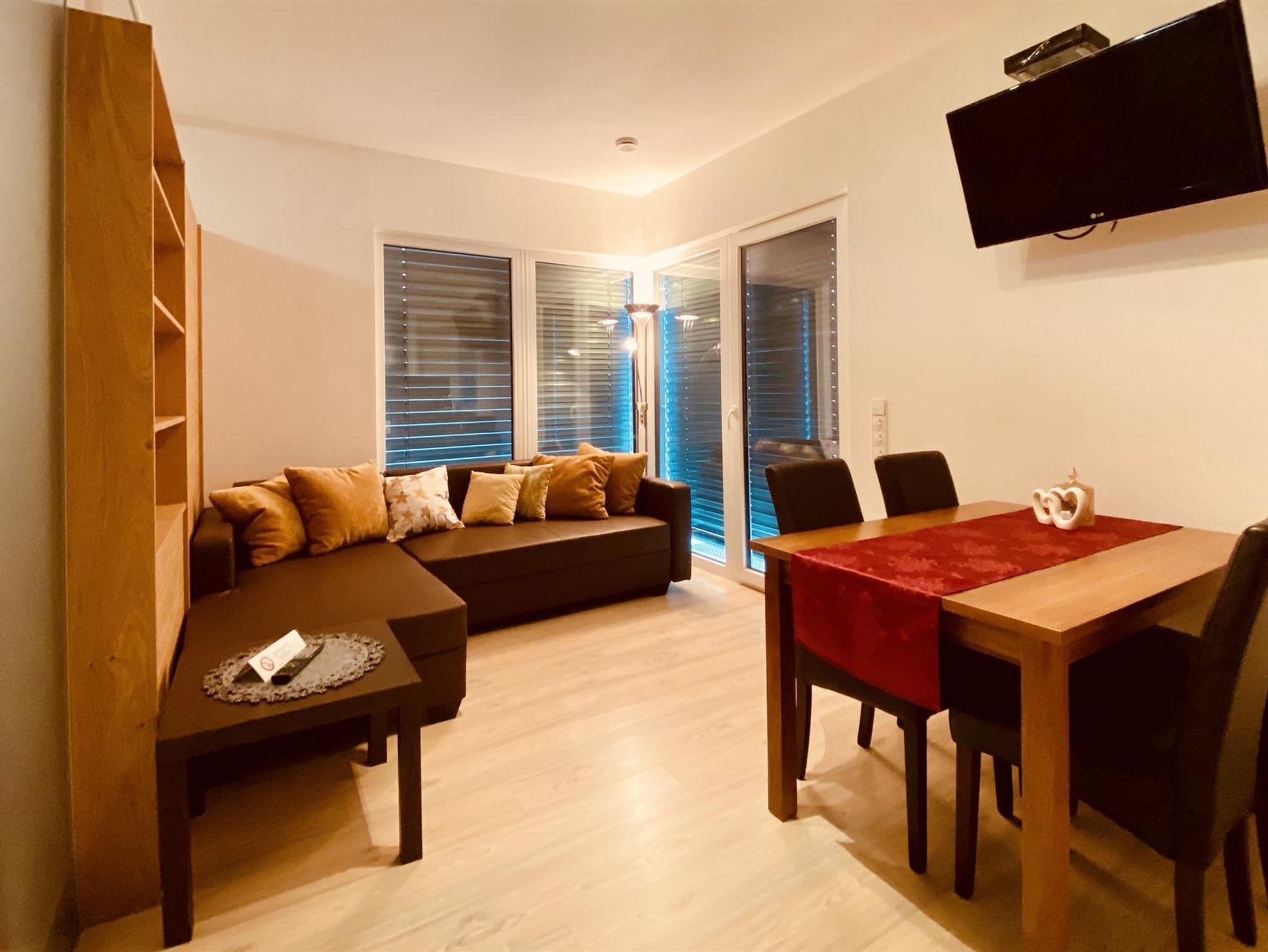 Modernes Apartment für 4 bis 6 Personen: 2 getr. Schlafzimmer, 1 gemütlicher Wohn-Schlafraum mit Sitzecke, Smart-TV, Esstisch und komplett ausgestattete Küche (Cerankochfeld, Kühl-/Gefrierschrank, Microwelle, Wasserkocher, Filterkaffee-/Kapselmaschine,...). Bad mit Dusche, WC getrennt. Erdgeschoß, Terrasse.