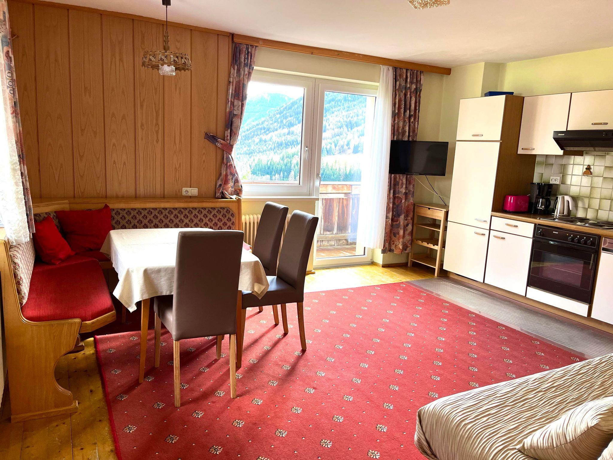 Das Appartement 2 Ost ist sehr sonnig und ruhig und verfügt über einen Balkon mit Blick auf das Tal. Die Wohnfläche beträgt 65m2 und ist mit zwei Zweibettzimmern mit zusätzlich jeweils einer Klappcouch, einer Wohnküche, einem Badezimmer mit Dusche und Waschmaschine sowie einem separaten WC ausgestattet. Die großzügige Wohnküche verfügt über eine Küchenzeile (Kühlschrank, 4-Platten Herd, Backrohr, Geschirrspüler, Spüle, Dunstabzug, Kaffeemaschine, Wasserkocher, Toaster, Geschirr und Besteck), eine Sitzecke, ein Sofa und SAT-TV.