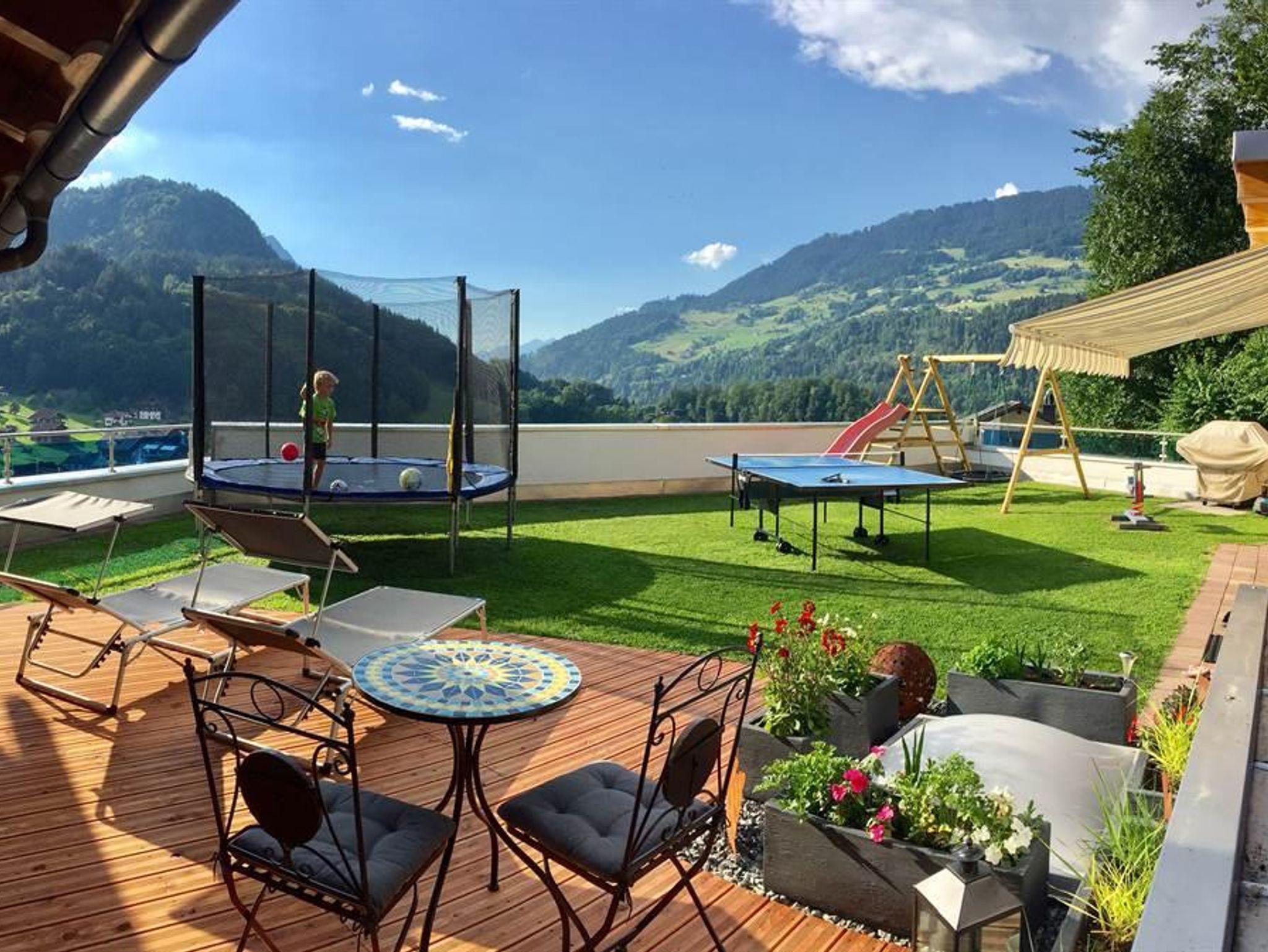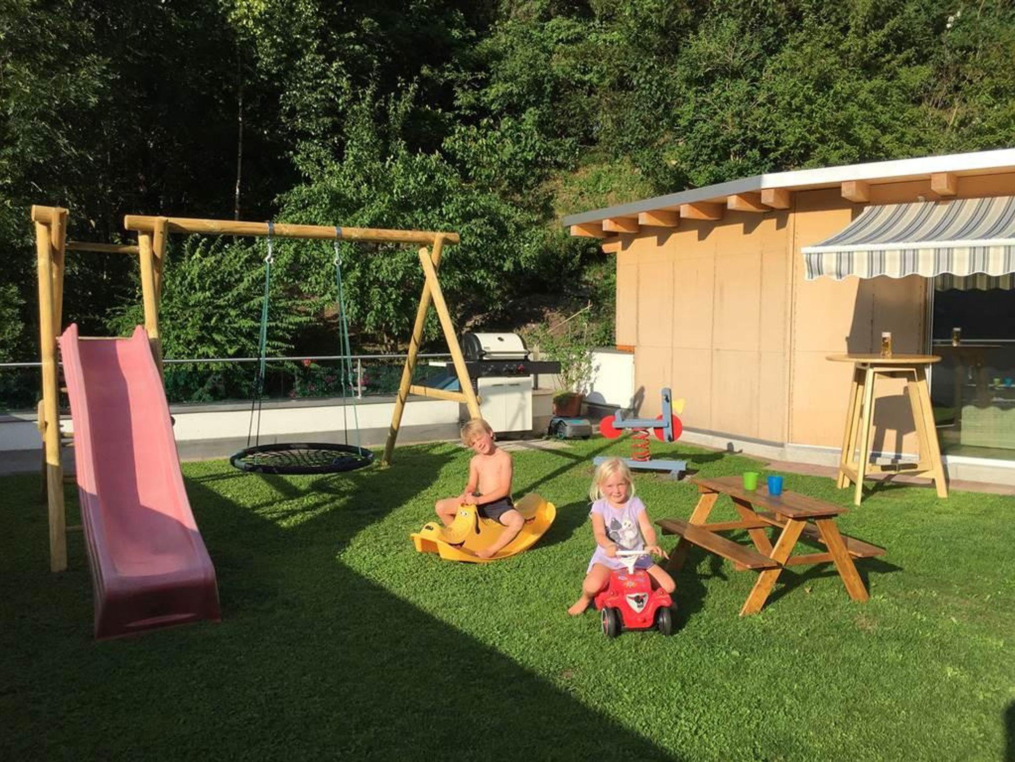 mit Schaukel, Rutsche, Trampolin, Tischtennis und sonstigen Spielgeräten zur Verfügung.