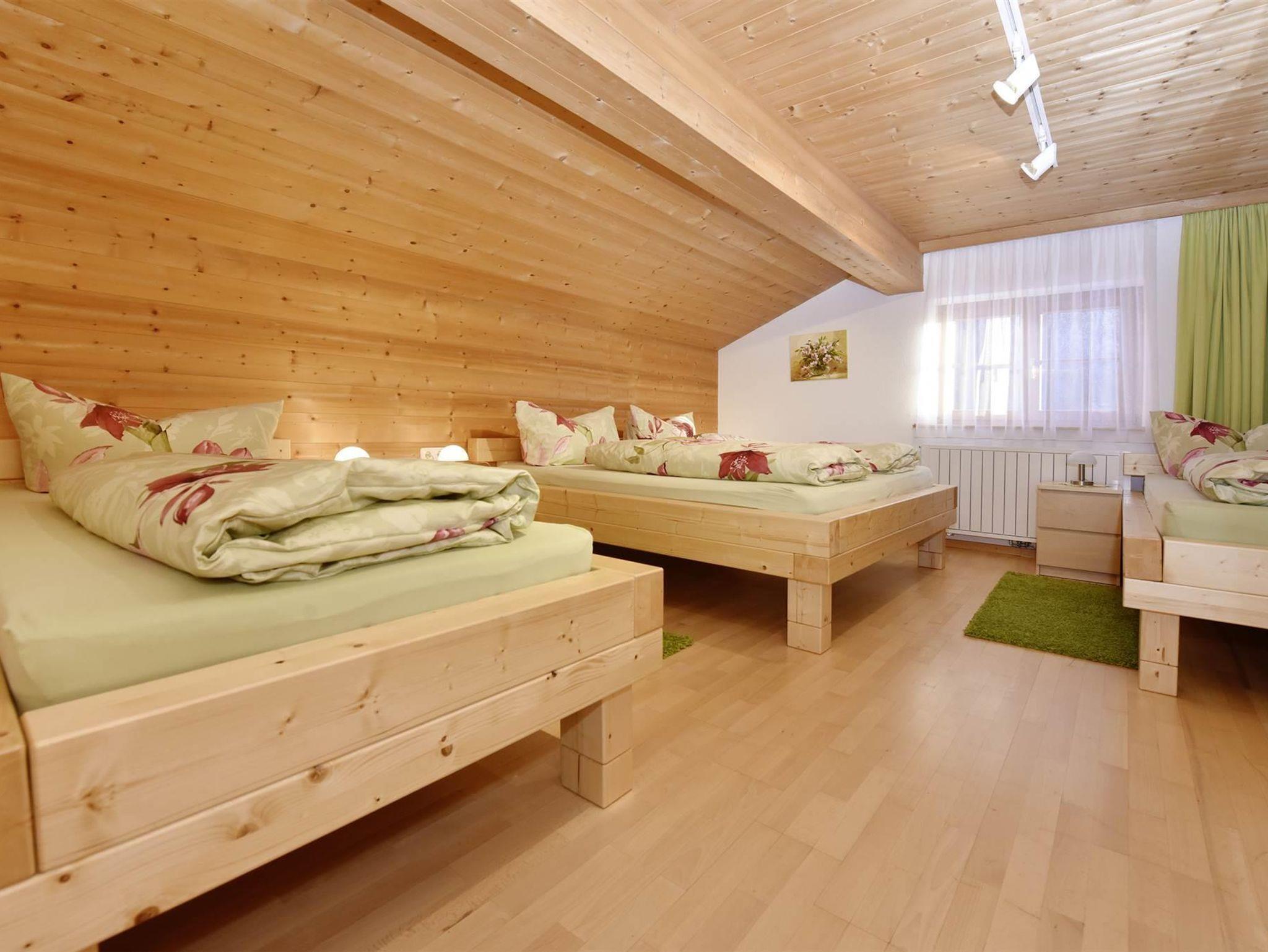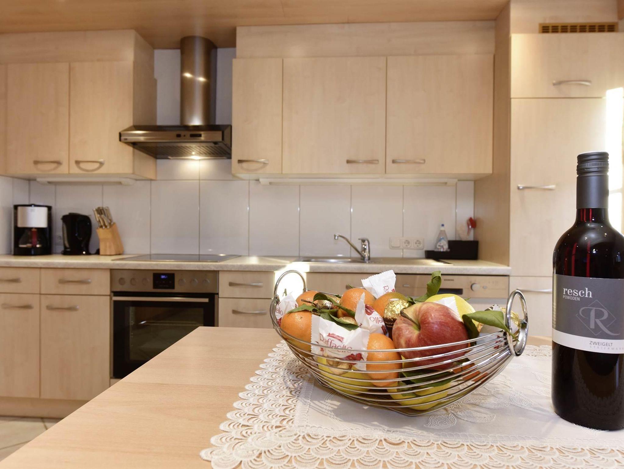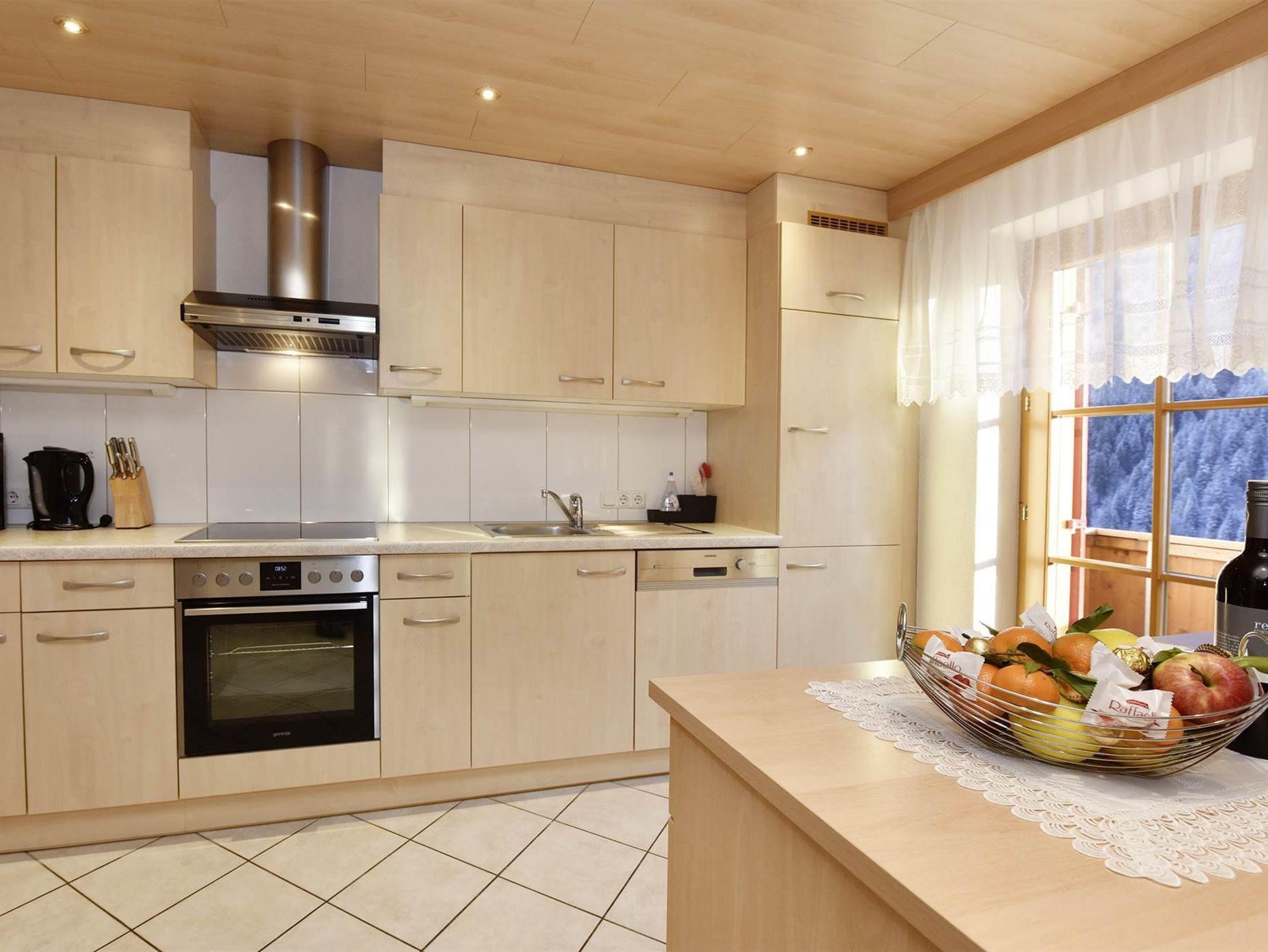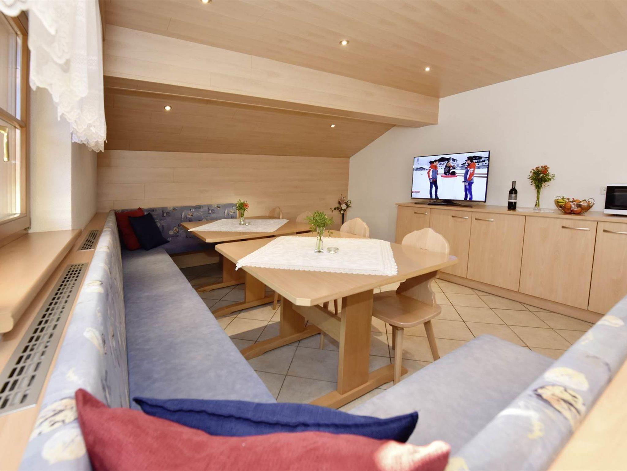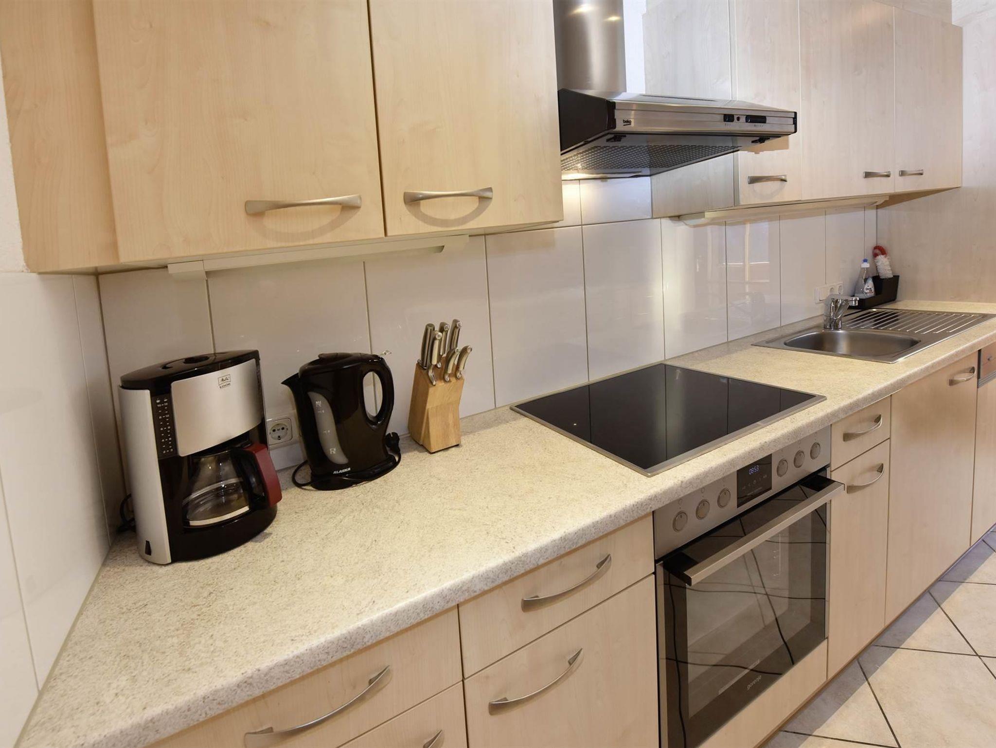 Die Wohnung verfügt über 2 Schlafzimmer, 1 Doppelzimmer und ein Vierbettzimmer mit einem Doppelbett und zwei Einzelbetten. Die Wohnküche ist eingerichtet mit einer Sitzecke, Küchenzeile mit Vierplattenherd und Backofen, Wasserkocher, Toaster, Filterkaffeemaschine und Mikrowelle. Das Badezimmer ist ausgestattet mit einem Waschbecken, Dusche und Badewanne. Das sep. WC befindet sich auf dem Gang.