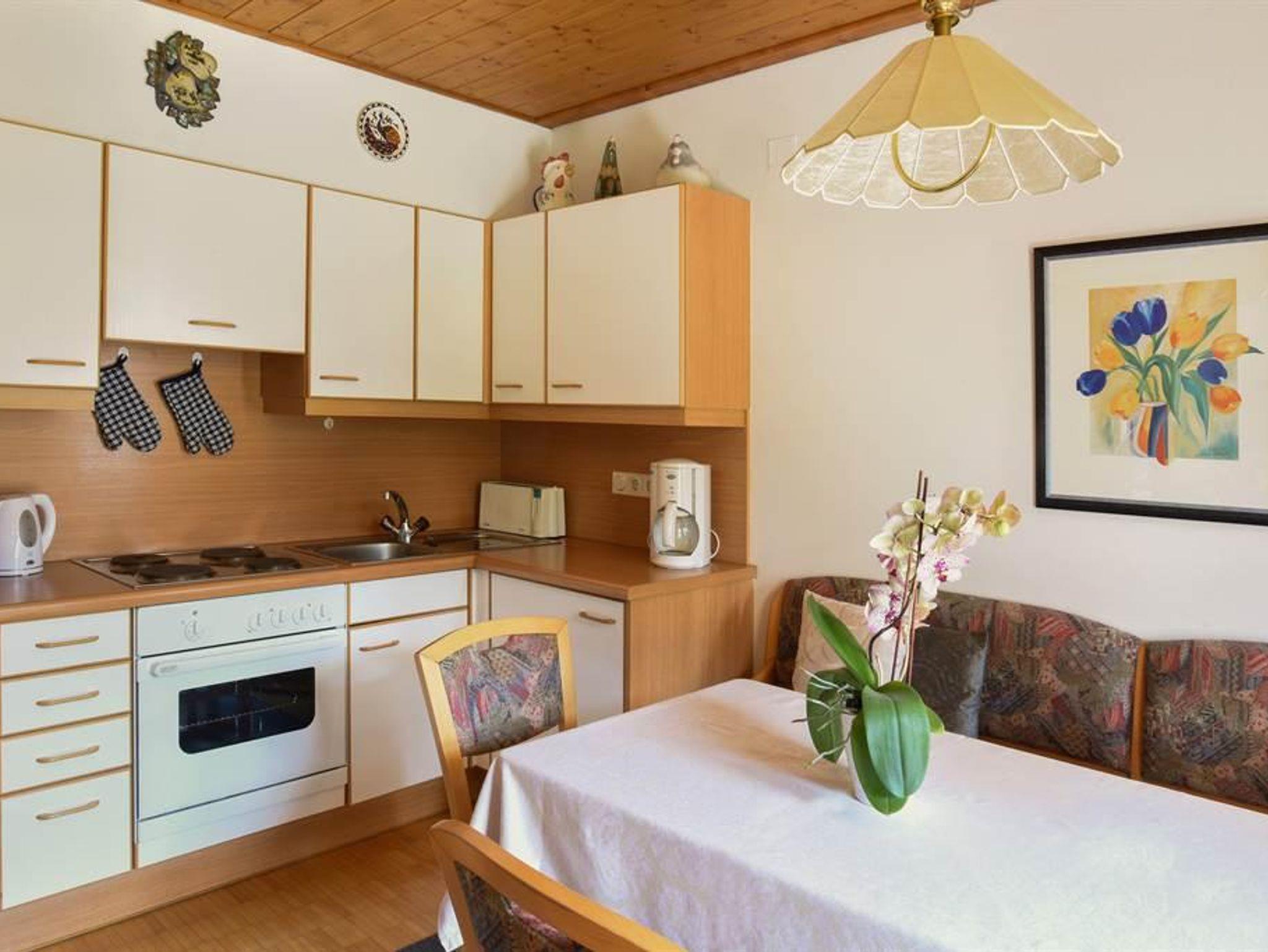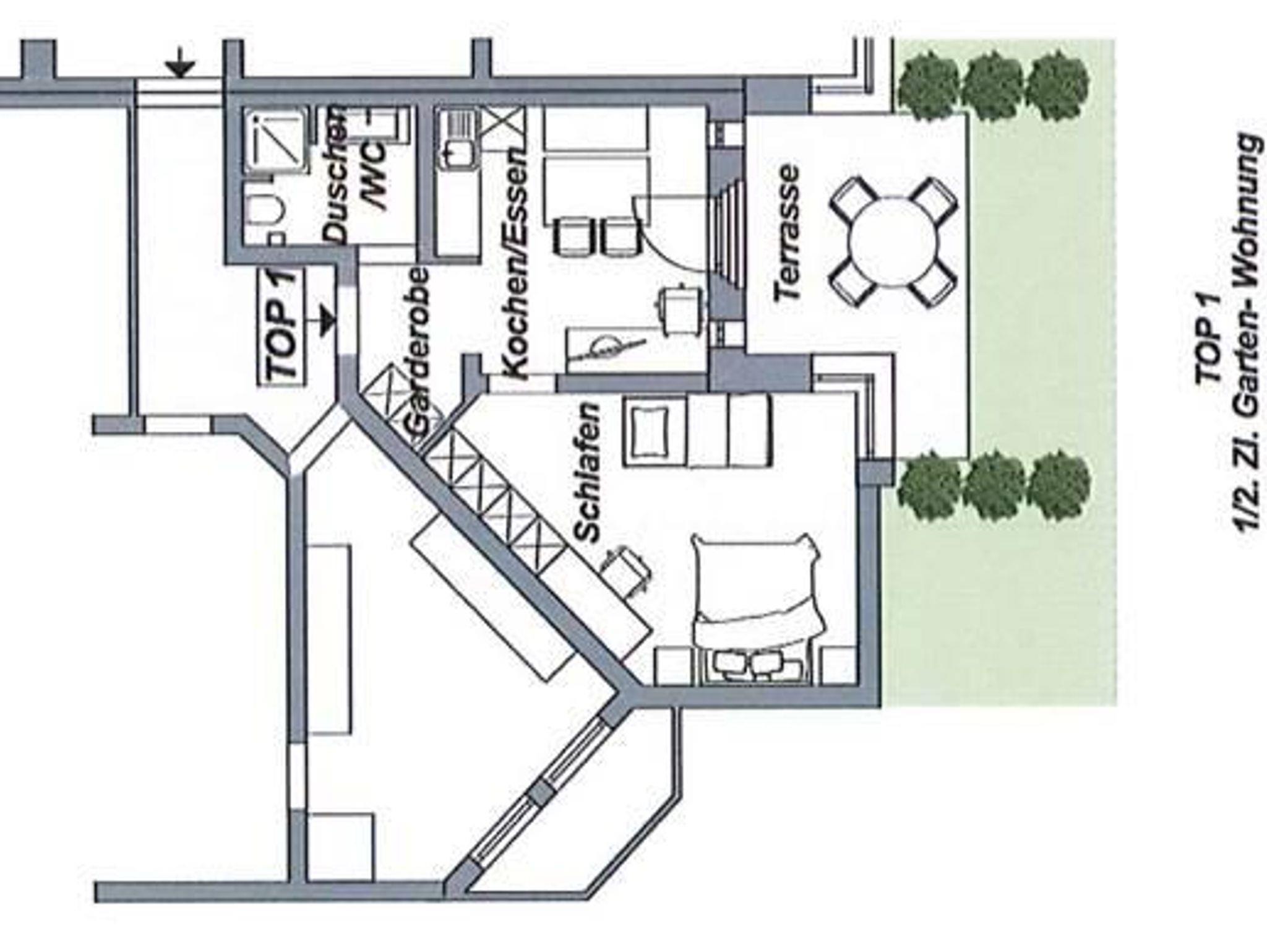 mit seperatem Schlafzimmer für 2-3 Personen, Wohnküche, Vorraum, Garderobe, Dusche mit WC, TV mit Radio, W-Lan, Tresor. Direkt von der Wohnung erreichen Sie Ihre schöne Gartenterrasse und Liegewiese. Gartemöbel stehen zur Verfügung.