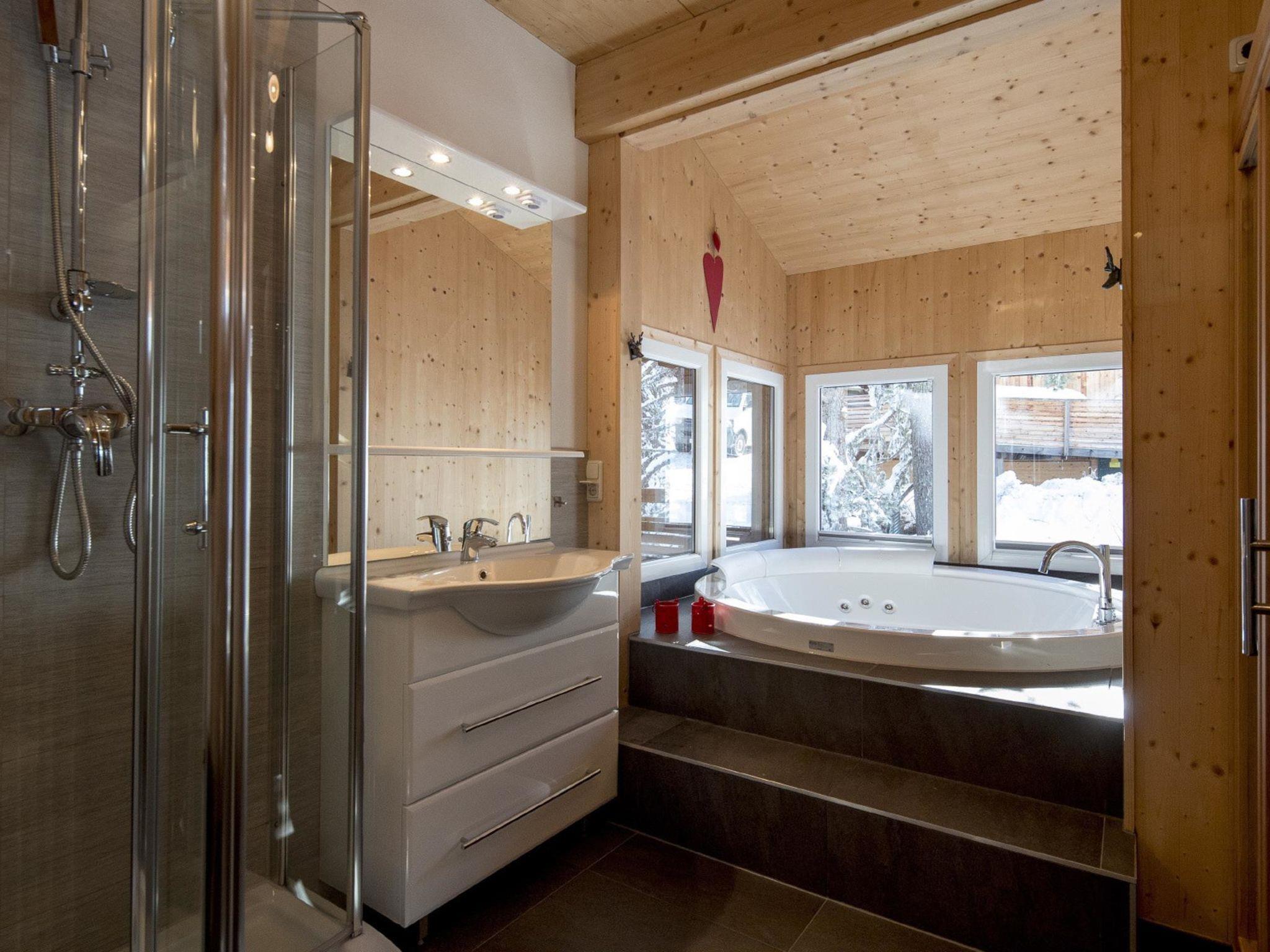 " 30 mit IR-Sauna & Sprudelbad innen", 5-room chalet 120 m2 on 2 levels. Luxurious and tasteful furnishings: living/dining room with dining nook and satellite TV (flat screen). Open kitchen (oven, dishwasher, 4 ceramic glass hob hotplates, toaster, kettle, microwave, electric coffee machine). Shower/WC. Upper floor: 3 double bedrooms. 1 room with 1 x 2 bunk beds. Bath/WC, shower/WC, hydro massage bath, Sauna. Balcony. Balcony furniture. Beautiful view of the mountains. Facilities: Internet (WiFi, free). Please note: non-smokers only. The sauna in the wellness pool is an infrared sauna.