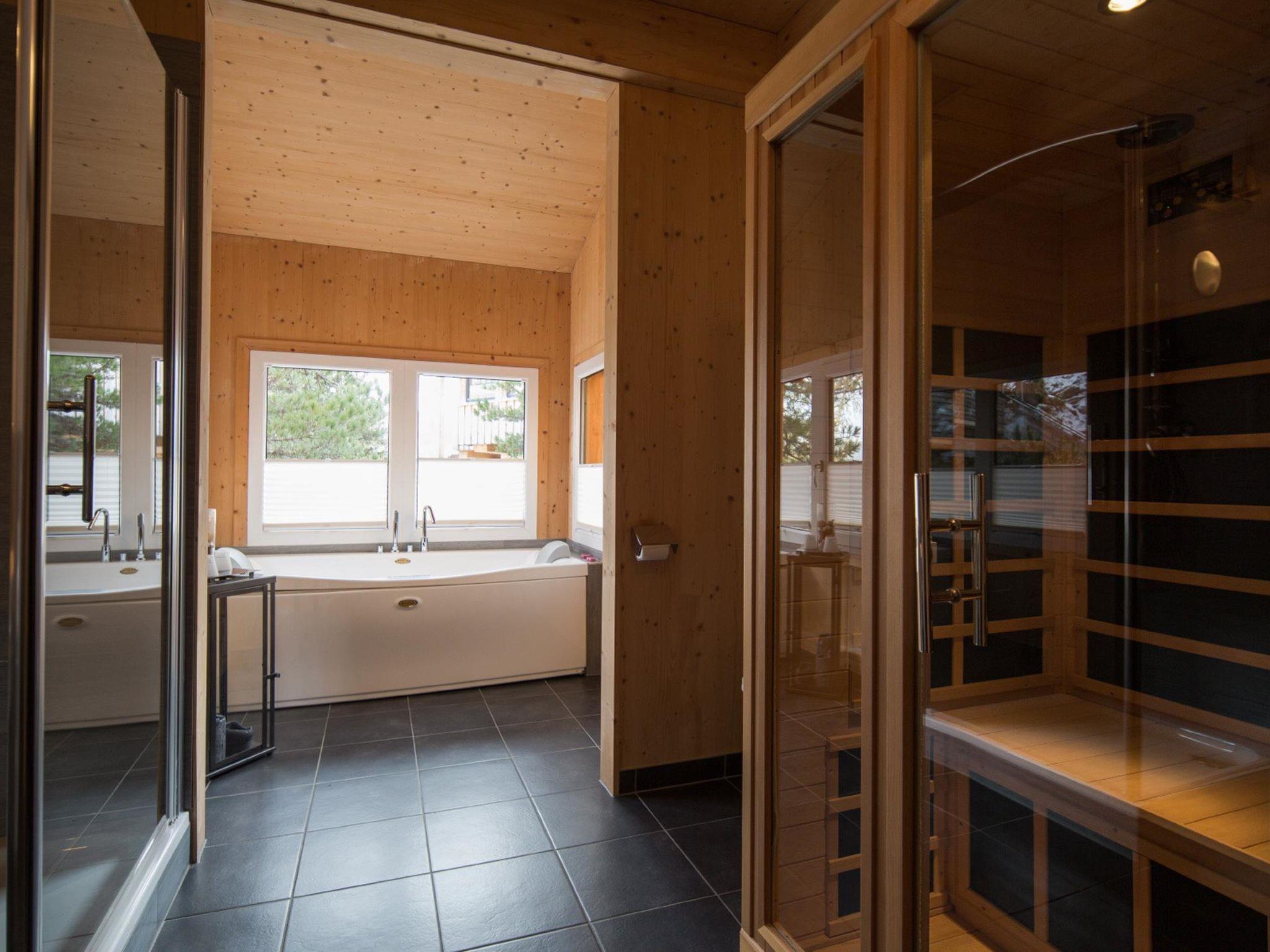 " 5 mit IR-Sauna&Sprudelbad innen", 5-room chalet 120 m2 on 2 levels. Luxurious and tasteful furnishings: living/dining room with dining nook and satellite TV (flat screen). Open kitchen (oven, dishwasher, 4 ceramic glass hob hotplates, toaster, kettle, microwave, electric coffee machine). Shower/WC. Upper floor: 2 double bedrooms. 1 room with 1 bed and 1 double bed. 1 room with 2 x 2 bunk beds. Bath/WC, shower/WC, hydro massage bath, Sauna. Balcony. Balcony furniture. Beautiful view of the mountains. Facilities: Internet (WiFi, free). Please note: non-smokers only. The sauna is an infrared cabin.