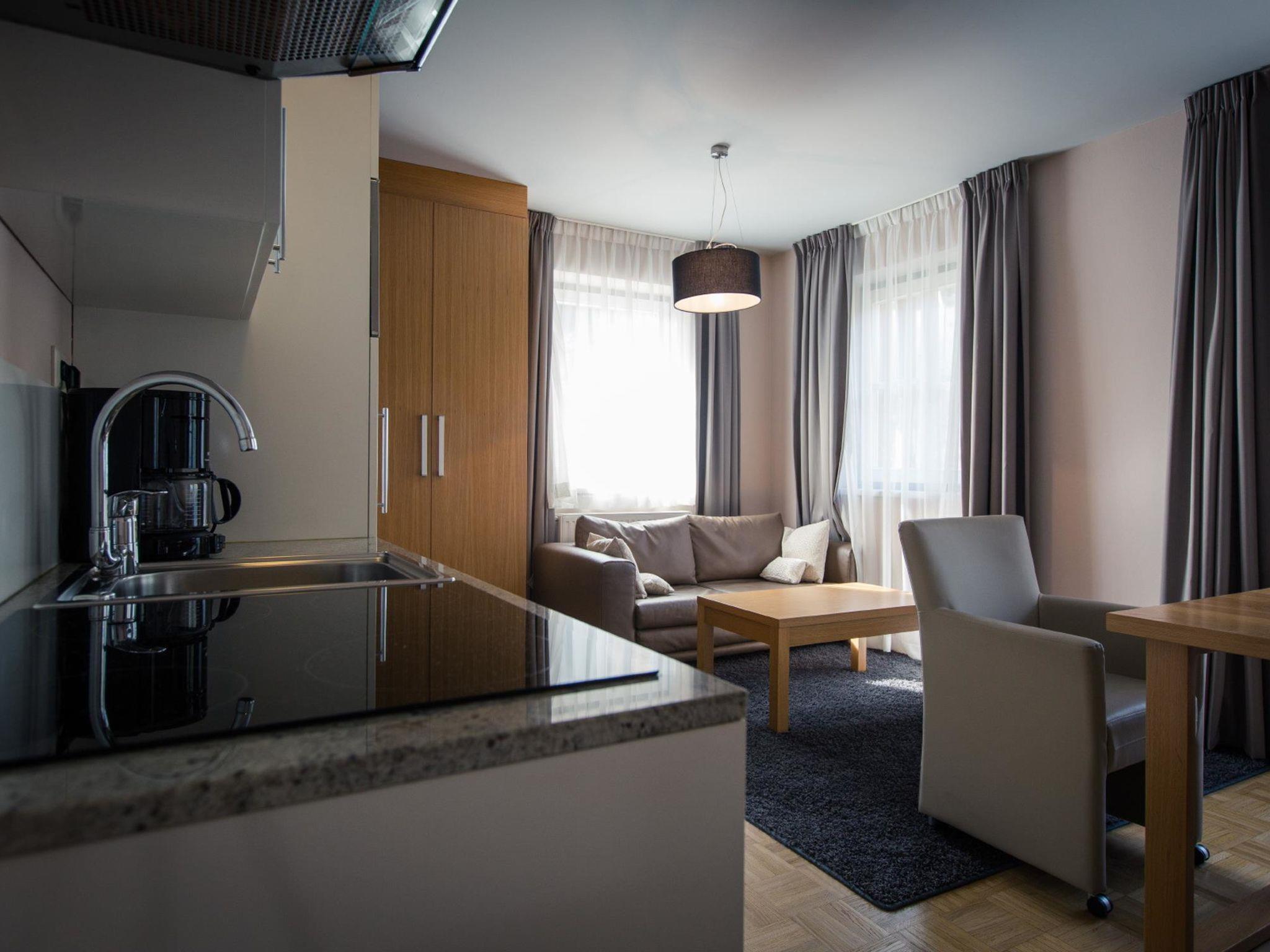 "Studio 4 mit Balkon", 1-room apartment 25 m2. Modern and cosy furnishings: living/sleeping room with 1 double bed, dining nook and satellite TV (flat screen). Kitchenette (dishwasher, 4 ceramic glass hob hotplates, toaster, kettle, microwave, electric coffee machine). Shower/WC. Balcony. Balcony furniture. Beautiful view of the mountains and the countryside. Facilities: Internet (WiFi, free). Please note: non-smokers only.
