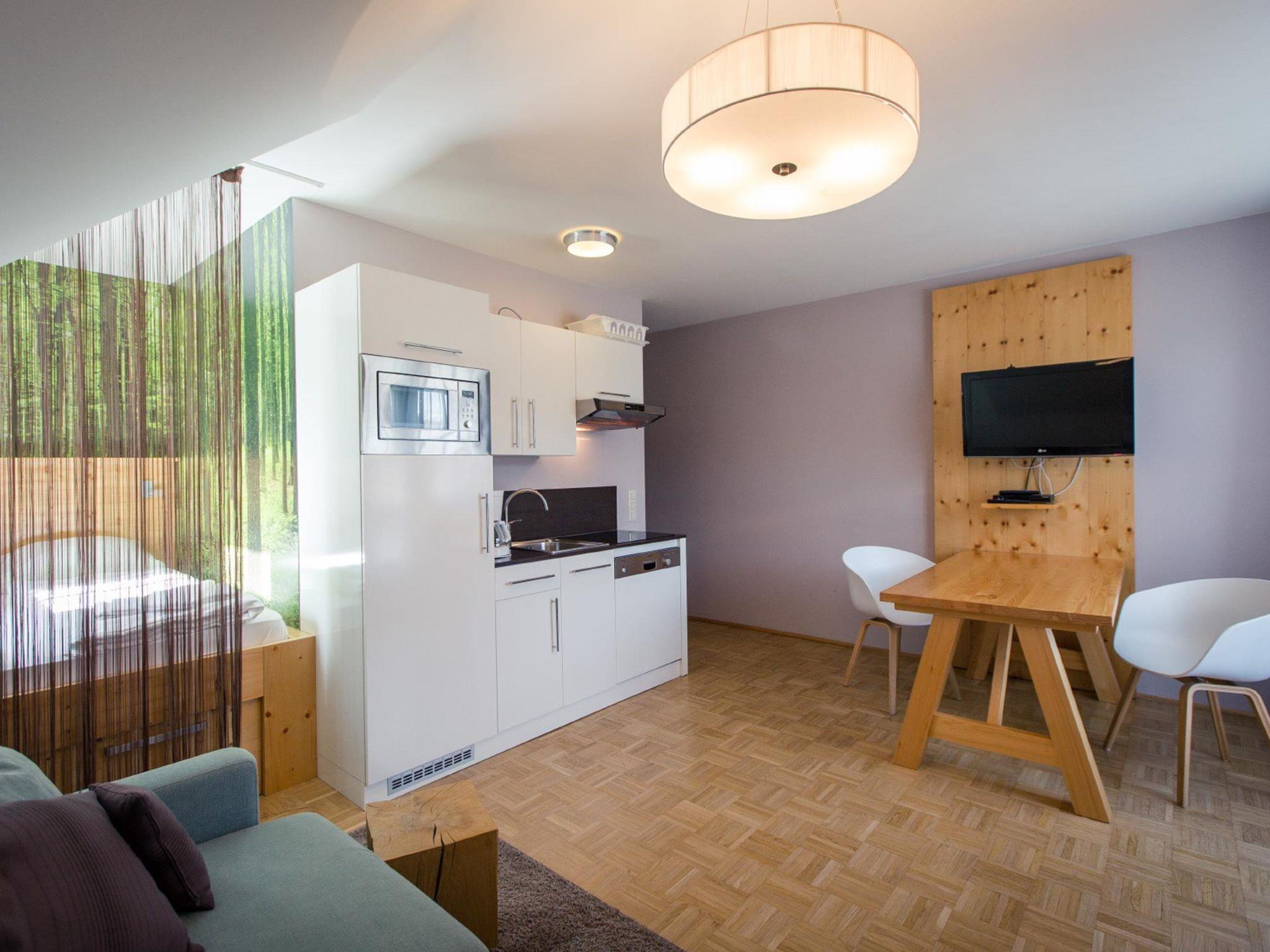 "Studio 13 mit Balkon", 1-room apartment 25 m2. Modern and cosy furnishings: living/sleeping room with 1 double bed, dining table and satellite TV (flat screen). Kitchenette (dishwasher, 4 ceramic glass hob hotplates, toaster, kettle, microwave, electric coffee machine). Shower/WC. Balcony. Balcony furniture. Beautiful view of the countryside and the resort. Facilities: Internet (WiFi, free). Please note: non-smokers only.