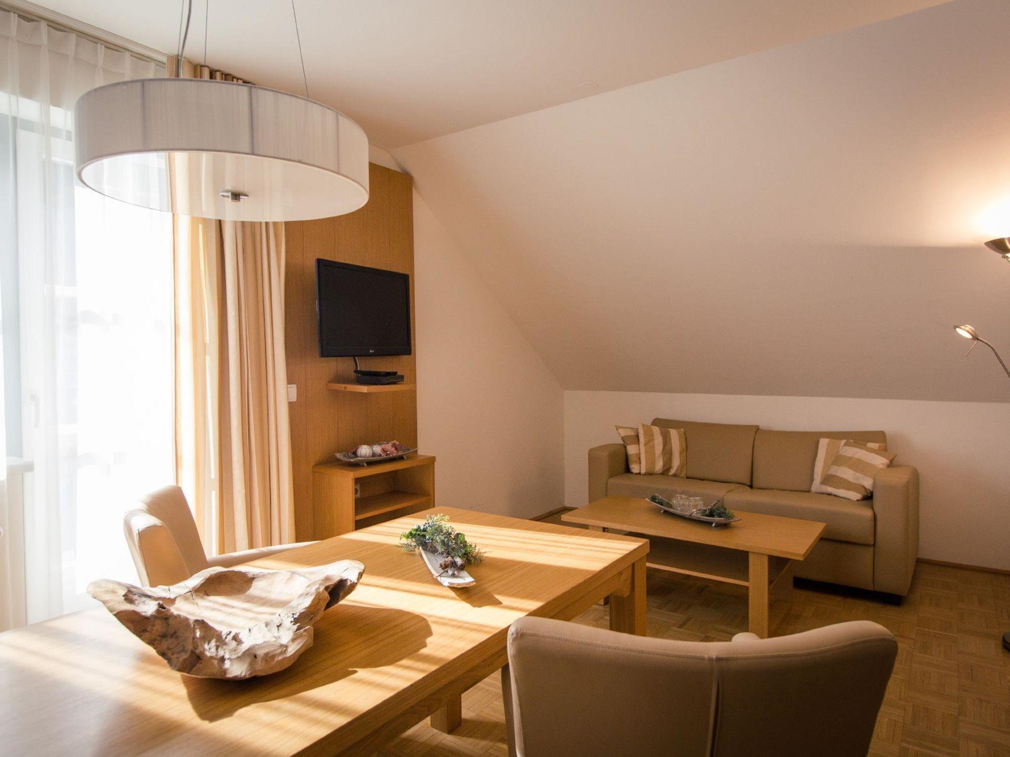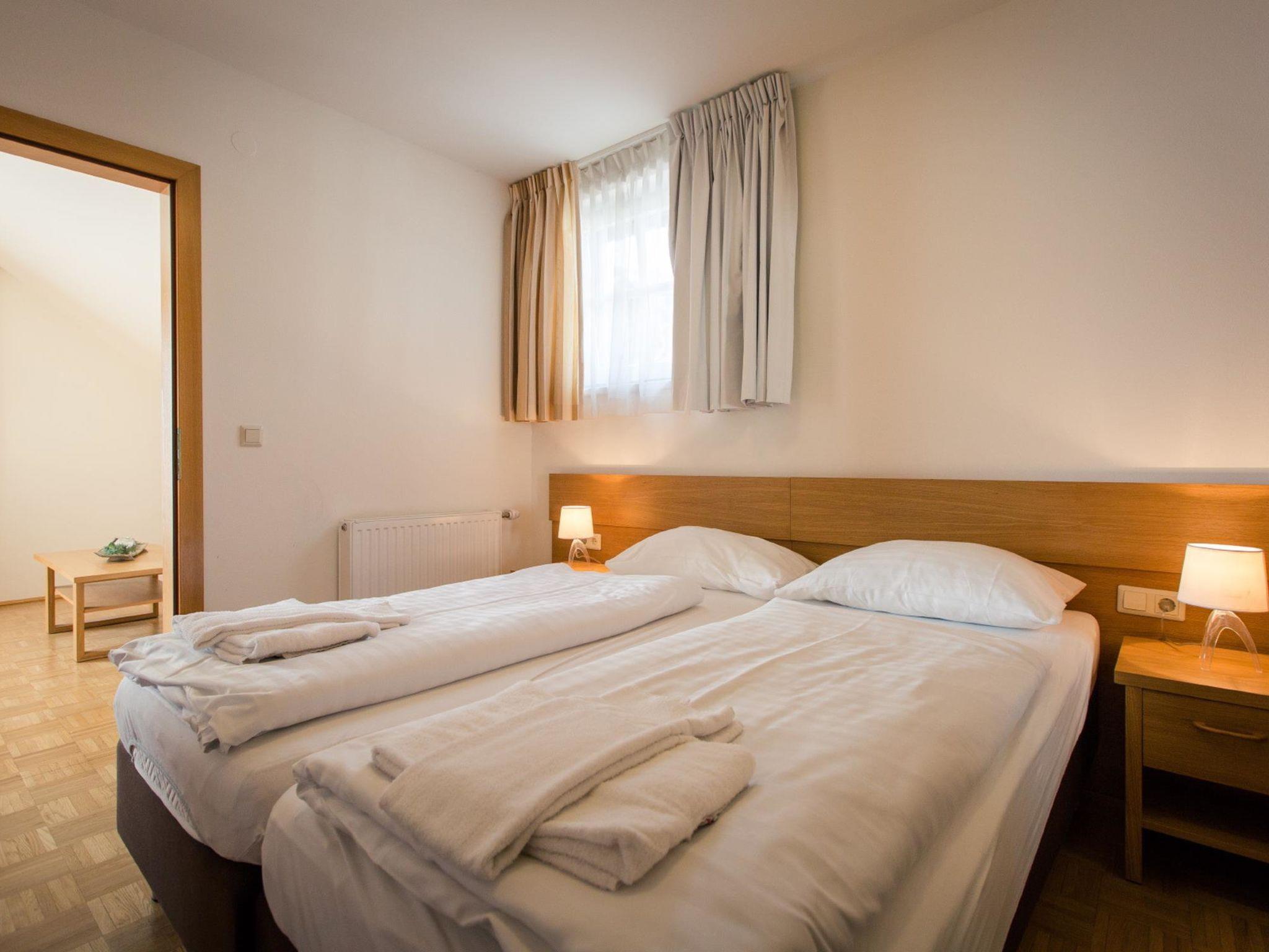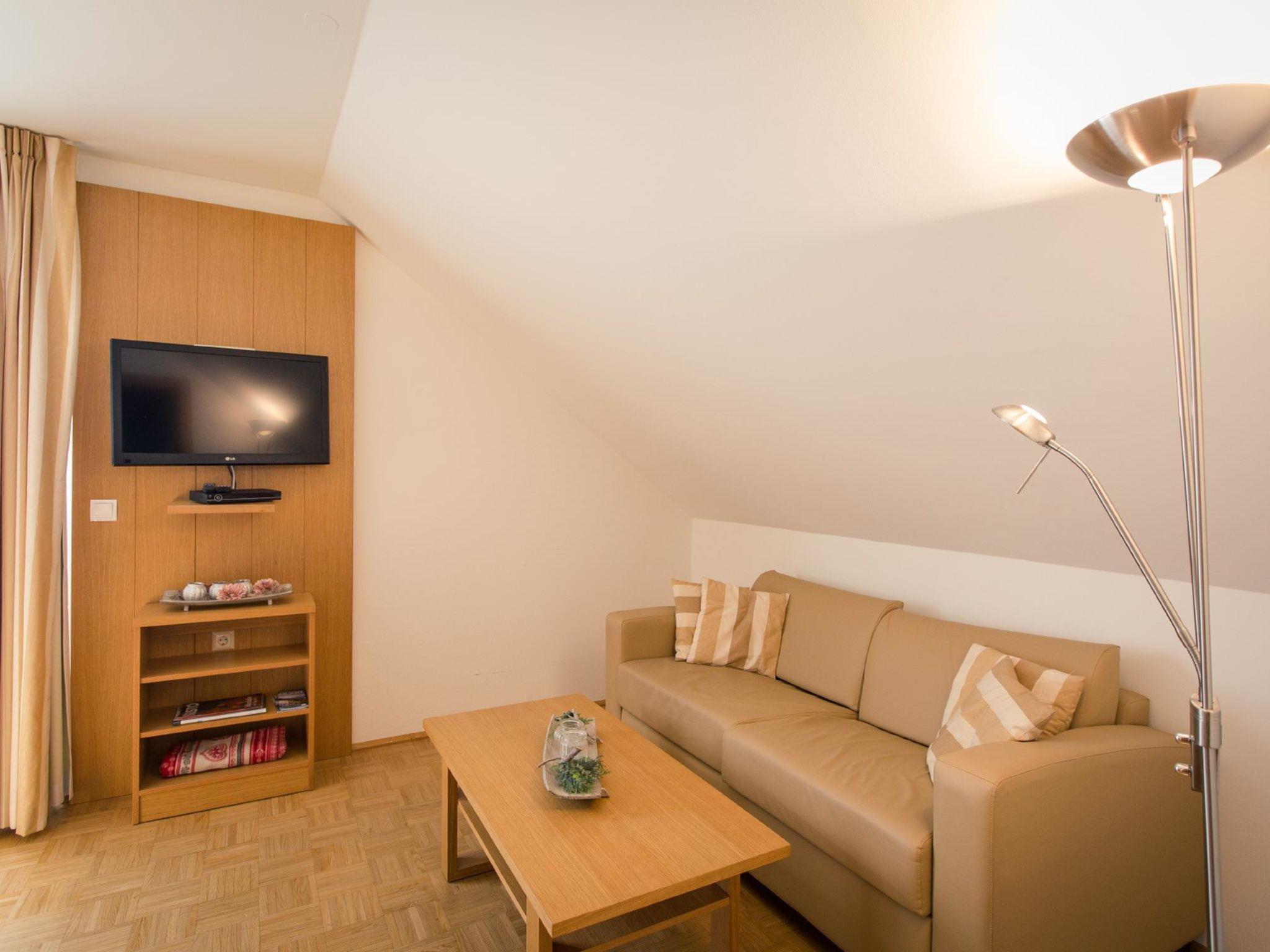 " 11 mit Balkon", 3-room apartment 50 m2. Modern and cosy furnishings: entrance hall with 1 x 2 bunk beds. Living/dining room with dining nook and satellite TV (flat screen). 1 double bedroom. Open kitchen (dishwasher, 4 ceramic glass hob hotplates, toaster, kettle, microwave, electric coffee machine). Shower/WC, Sauna. Balcony. Balcony furniture. Beautiful view of the mountains and the countryside. Facilities: Internet (WiFi, free). Please note: non-smokers only. The sauna is an infrared cabin.