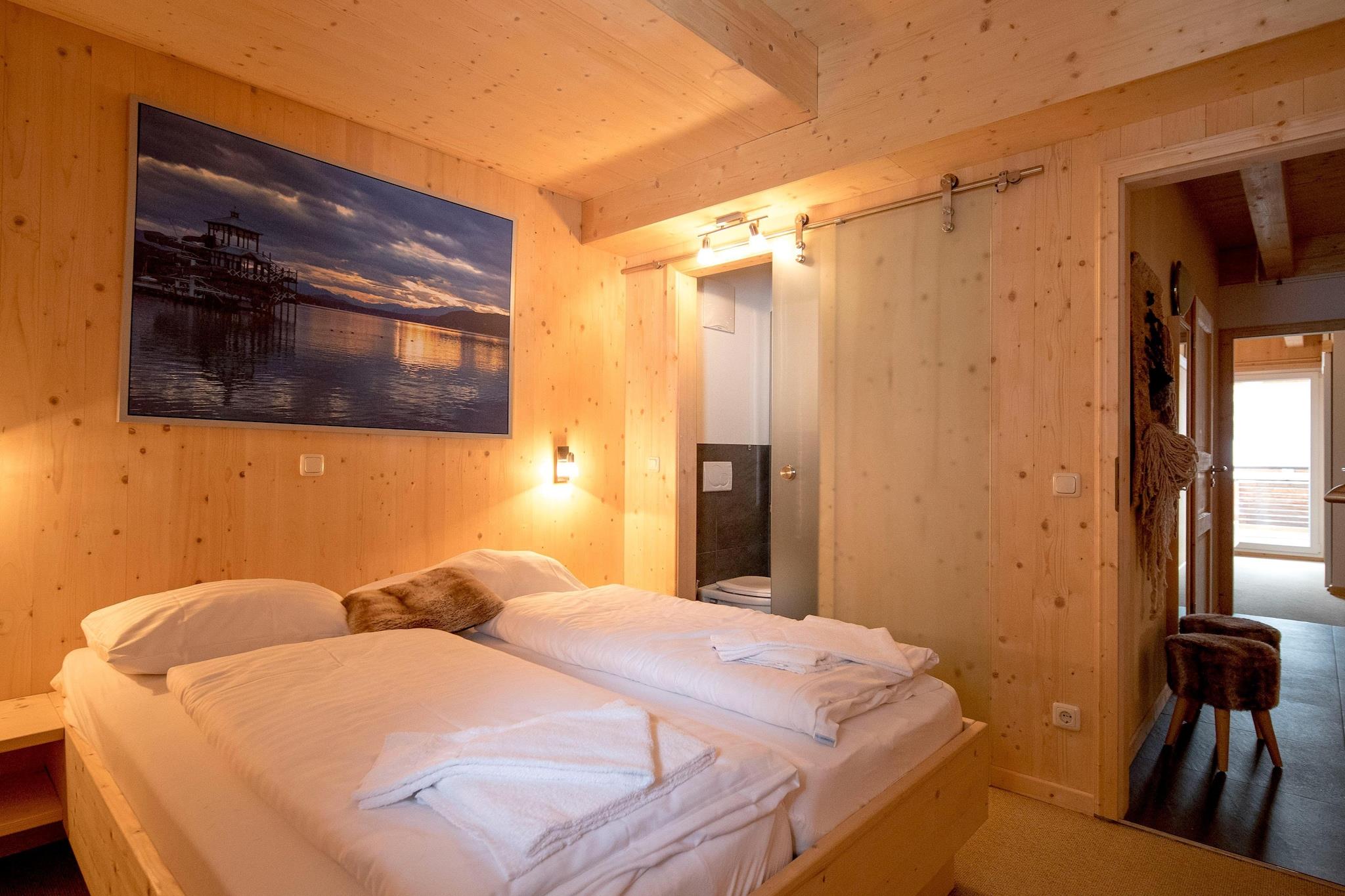 Velkommen til dit ideelle alpine tilbagetog! Denne fortryllende 130 m² massiv træhytte tilbyder et rummeligt og indbydende tilflugtssted for op til 10 gæster, komplet med en fantastisk udsigt over bjergene. Efter en dag med udforskning kan du slappe af i den finske sauna eller suge i spabadet for en beroligende og afslappende oplevelse. Beliggende i den fredfyldte fyrreskov på omkring 1.800 meter, er hytten perfekt placeret til ro og eventyr tæt på skisportsstedet, skoven, centrum og søen. Uanset om du ønsker at vandre, gå eller cykle, byder det omkringliggende område på et væld af udendørs aktiviteter. Hytten har fem smukt indrettede soveværelser: tre værelser med komfortable dobbeltsenge, et værelse med hyggelige køjesenge og et værelse med to enkeltsenge, der rummer en række forskellige sovearrangementer. Med fire moderne badeværelser, hver udstyret med bruser, er der rigelig plads og bekvemmelighed for alle gæster. Det åbne køkken er en kulinarisk entusiasts drøm, fuldt udstyret med en keramisk kogeplade, ovn, opvaskemaskine, køleskab med fryser, brødrister, kedel og kaffemaskine. Et startsæt med opvaskemaskiner, opvaskemiddel, en svamp, affaldsposer, en renseklud og et viskestykke vil blive leveret ved din ankomst. Yderligere faciliteter inkluderer gratis Wi-Fi og satellit-tv, der sikrer, at du forbliver forbundet og underholdt. Hytten har også en dejlig balkon, hvor du kan nyde det betagende bjerglandskab og friske skovluft. For ekstra bekvemmelighed og luksus er et Butler-kort eller Butler-program inkluderet i dit ophold. Denne hytte kombinerer komfort, en fantastisk udsigt og en førsteklasses beliggenhed for en mindeværdig alpine ferie.