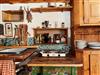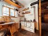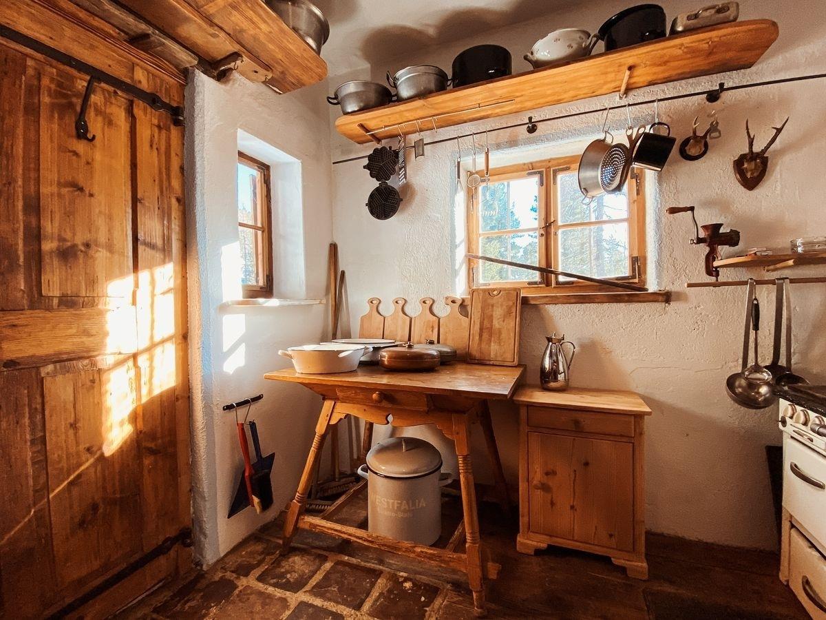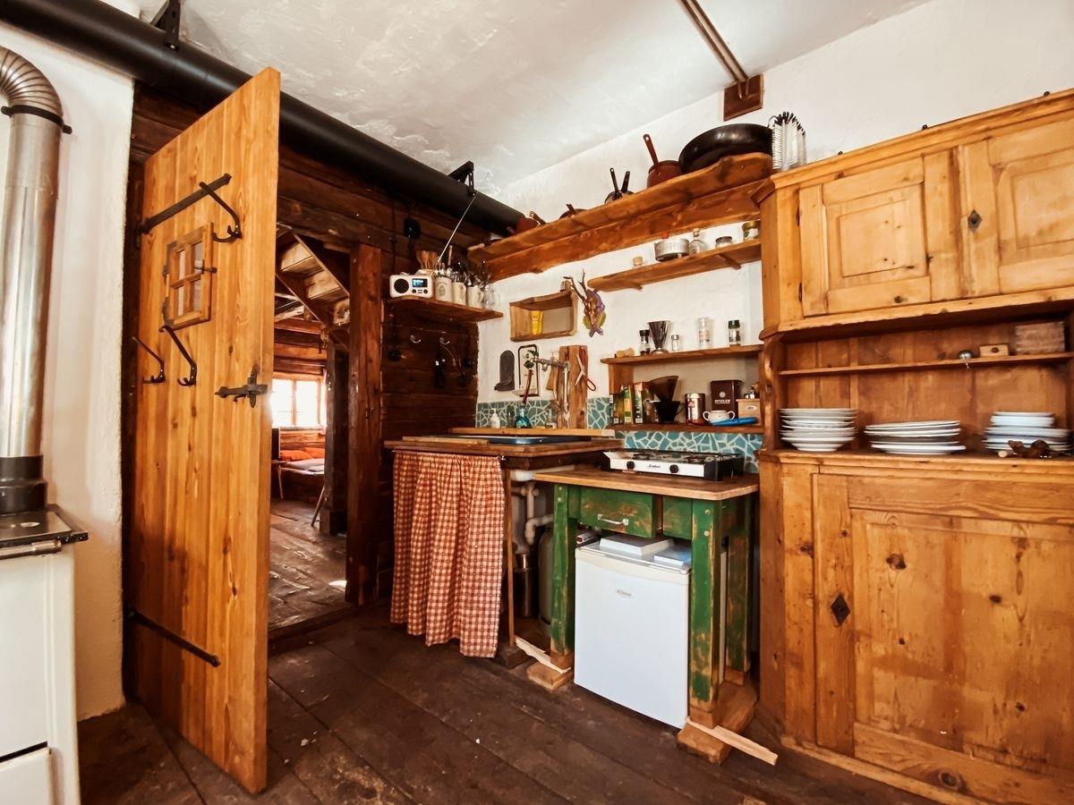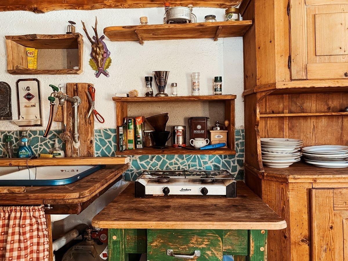 Die Küche bietet alles, was man für das einfache, aber behagliche Leben auf der Alm braucht: Holzherd, Gaskocher, Bauernschrank, Regale, Küchenutensilien und fließendes Wasser.