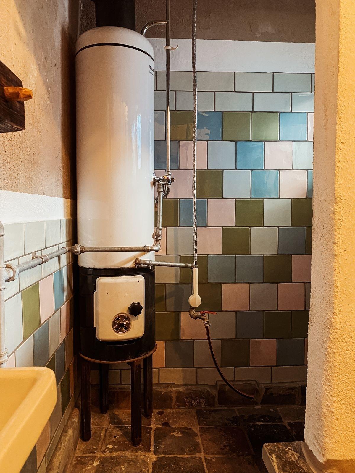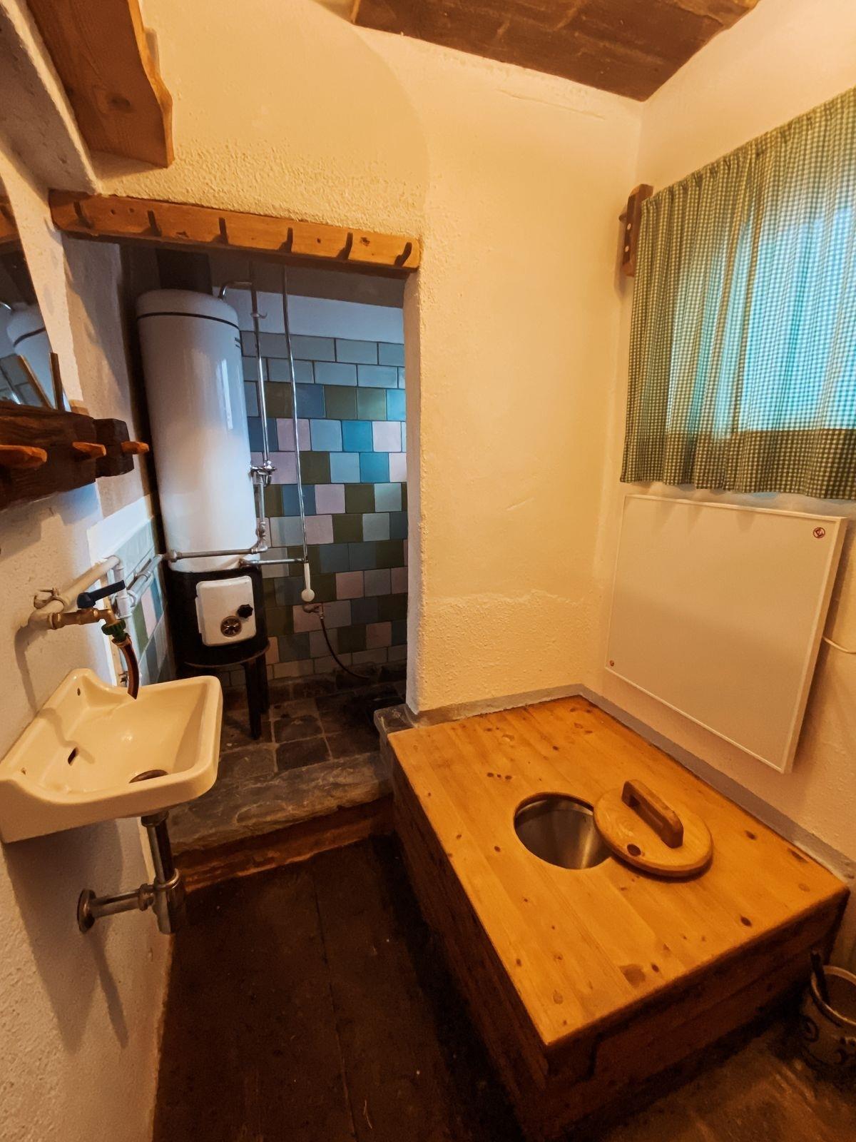 Das Badezimmer ist mit einem klassischen Badeofen ausgestattet, der für warme Bäder sorgt, während das traditionelle Plumpsklo mit Handspülung einen nostalgischen Charme bewahrt – selbstverständlich mit Kanalanschluss.