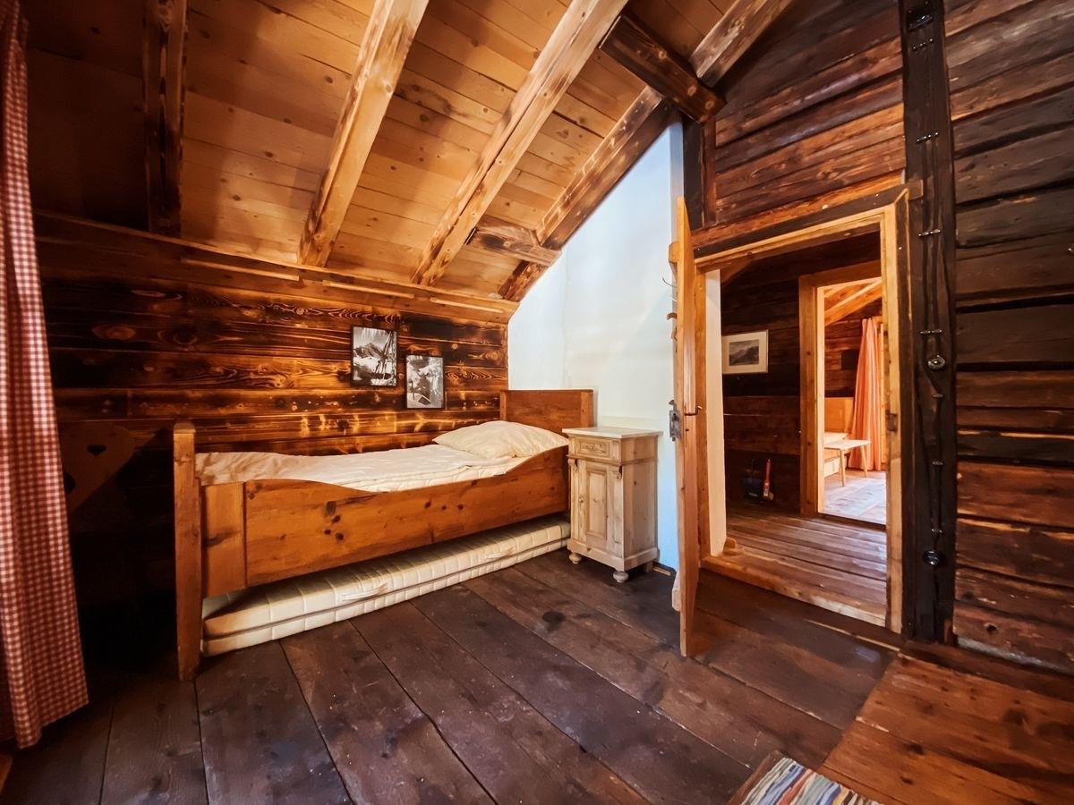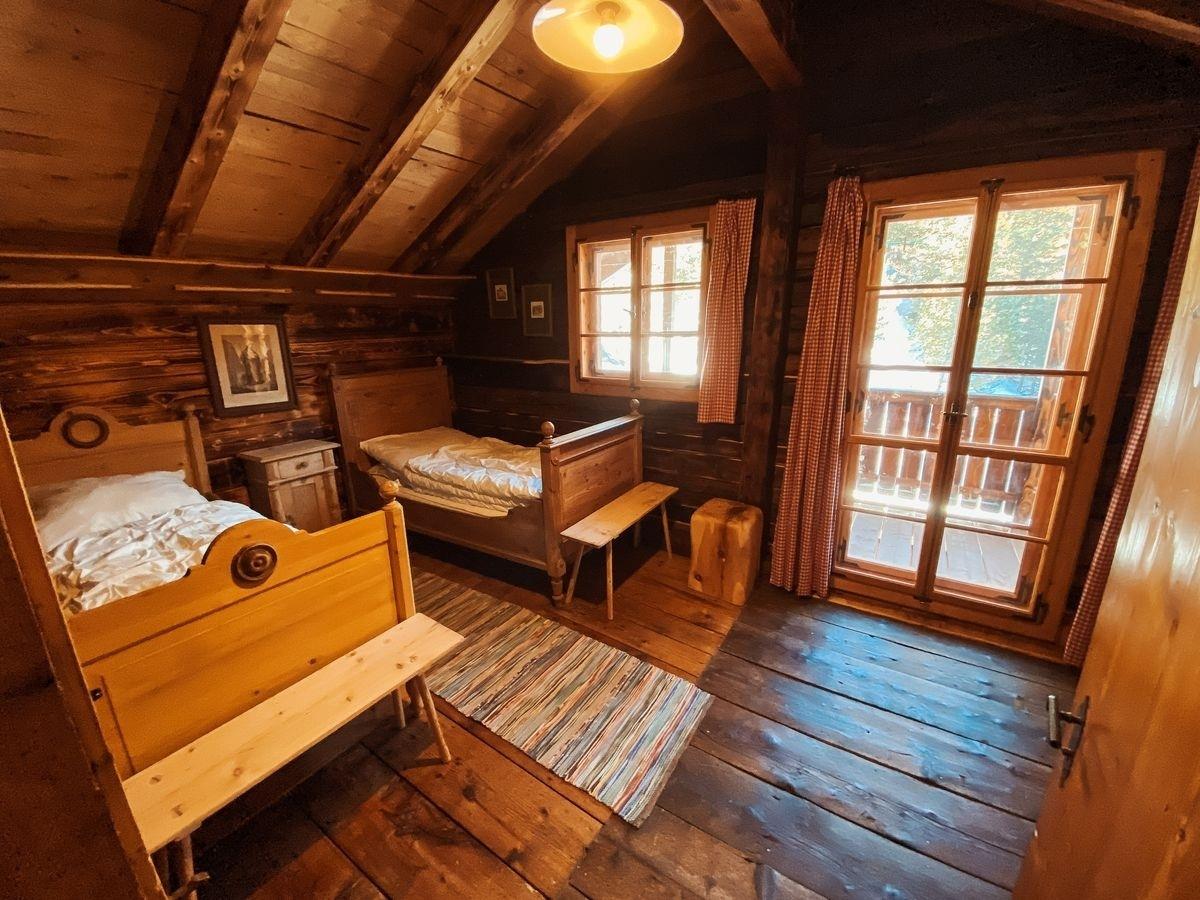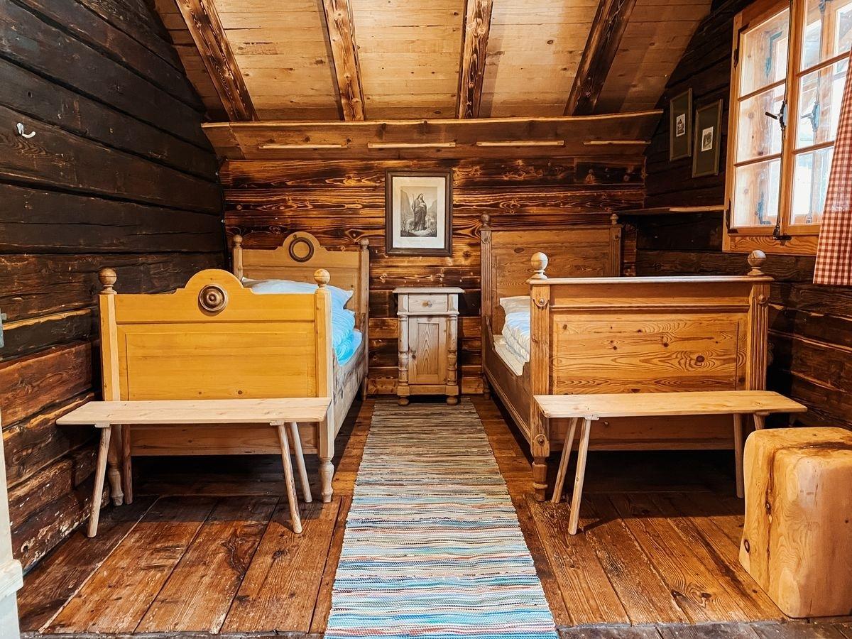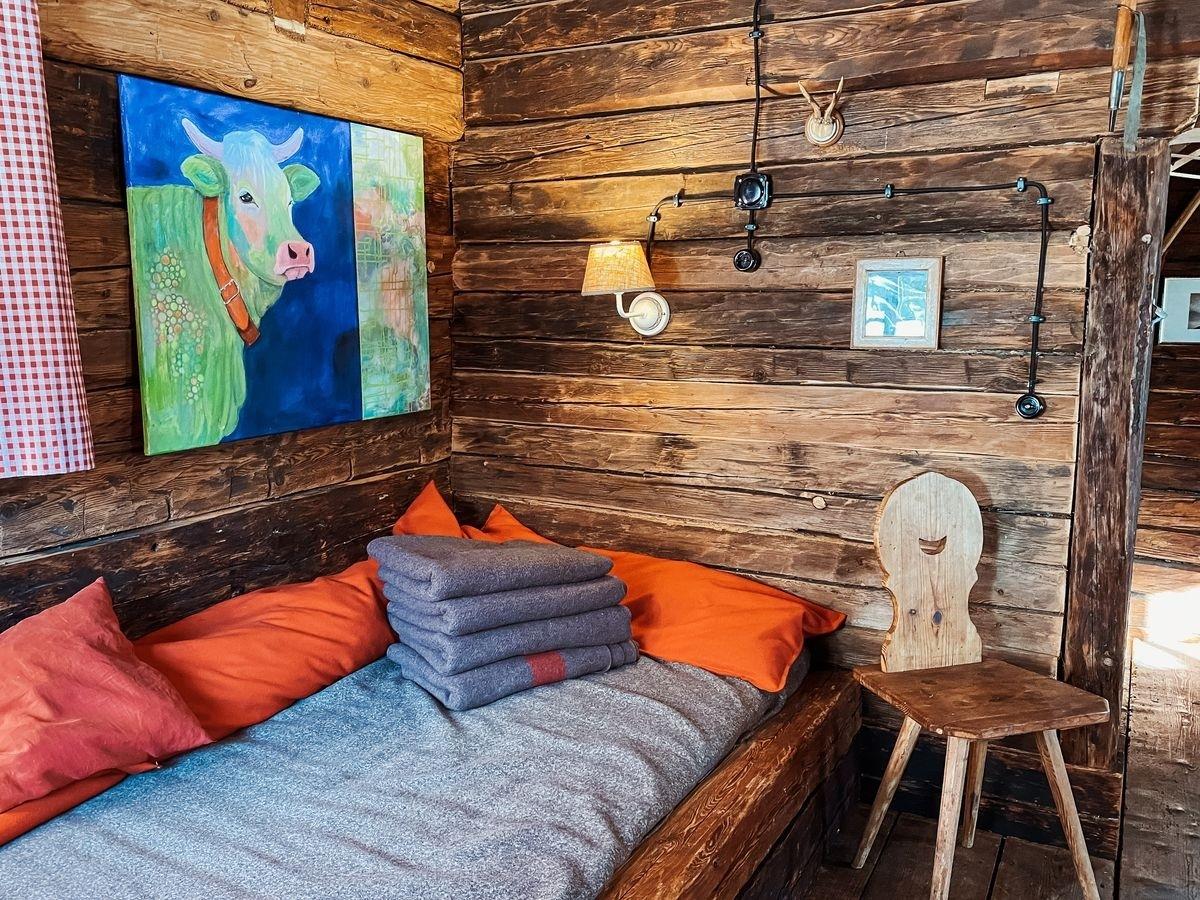 Im Obergeschoss befinden sich zwei Schlafzimmer mit je einem Doppelbett. In der großen Stube im Erdgeschoss steht ein gemütliches Heubett, das besonders bei Kindern für Begeisterung sorgt.