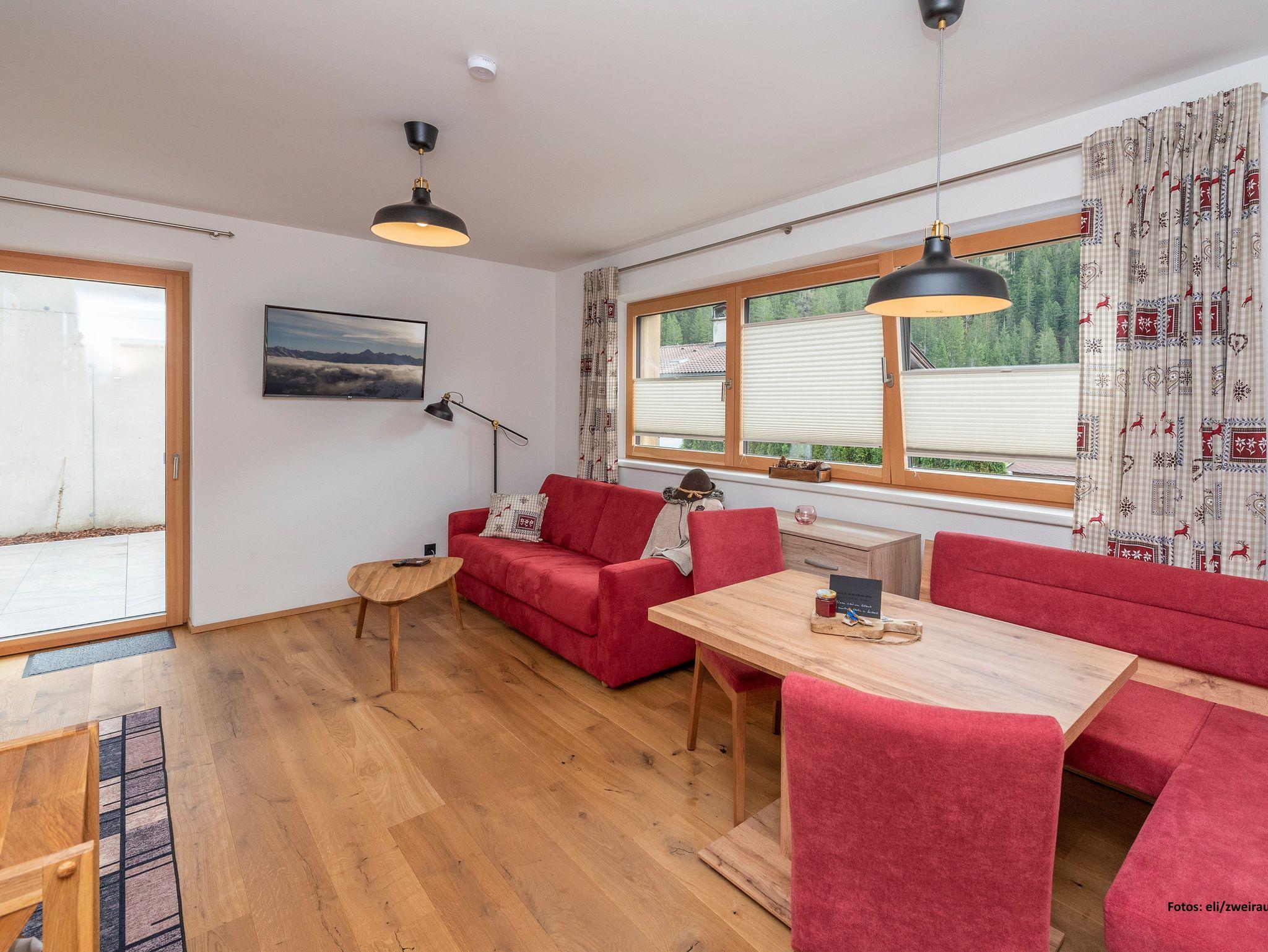 Gemütliches und helles Appartement in warmen Farben im alpenländischen Stil. Vom Wohnraum mit Holzboden und offener Küche haben Sie direkten Zugang zu einer kleinen Terasse. Hier genießen Sie beim Sonnenaufgang den ersten Kaffee.