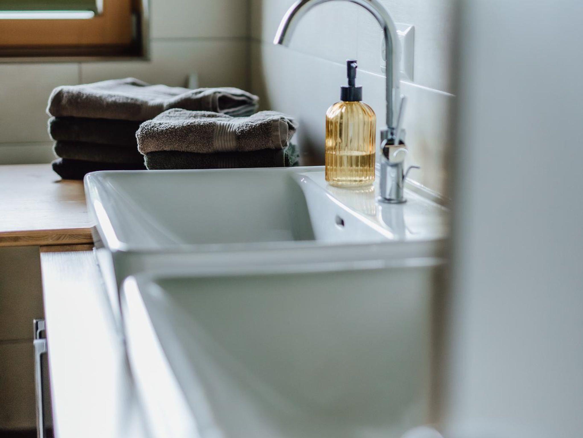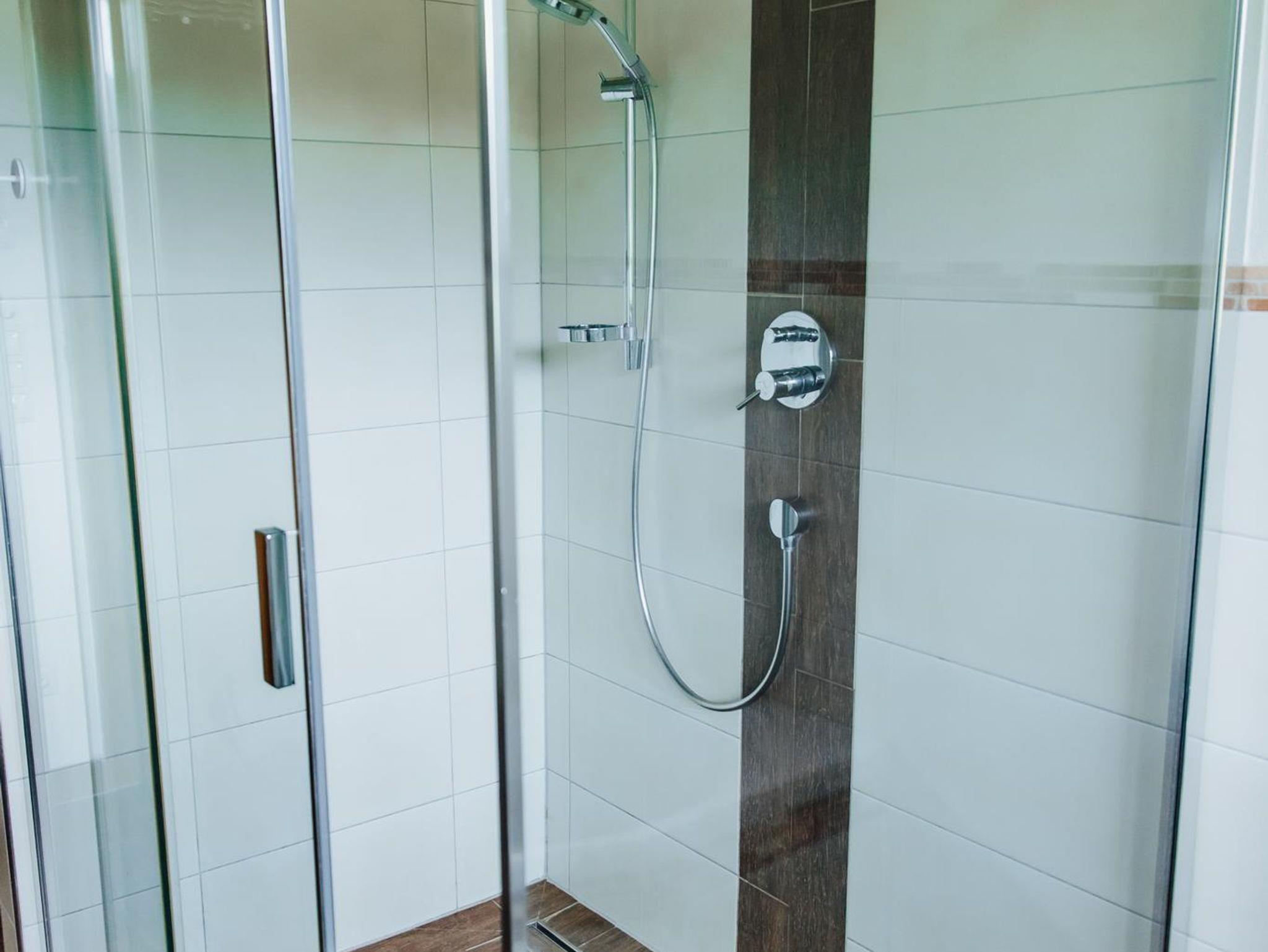 • Badezimmer mit großer Dusche, Badewanne & 2 Waschbecken, WC