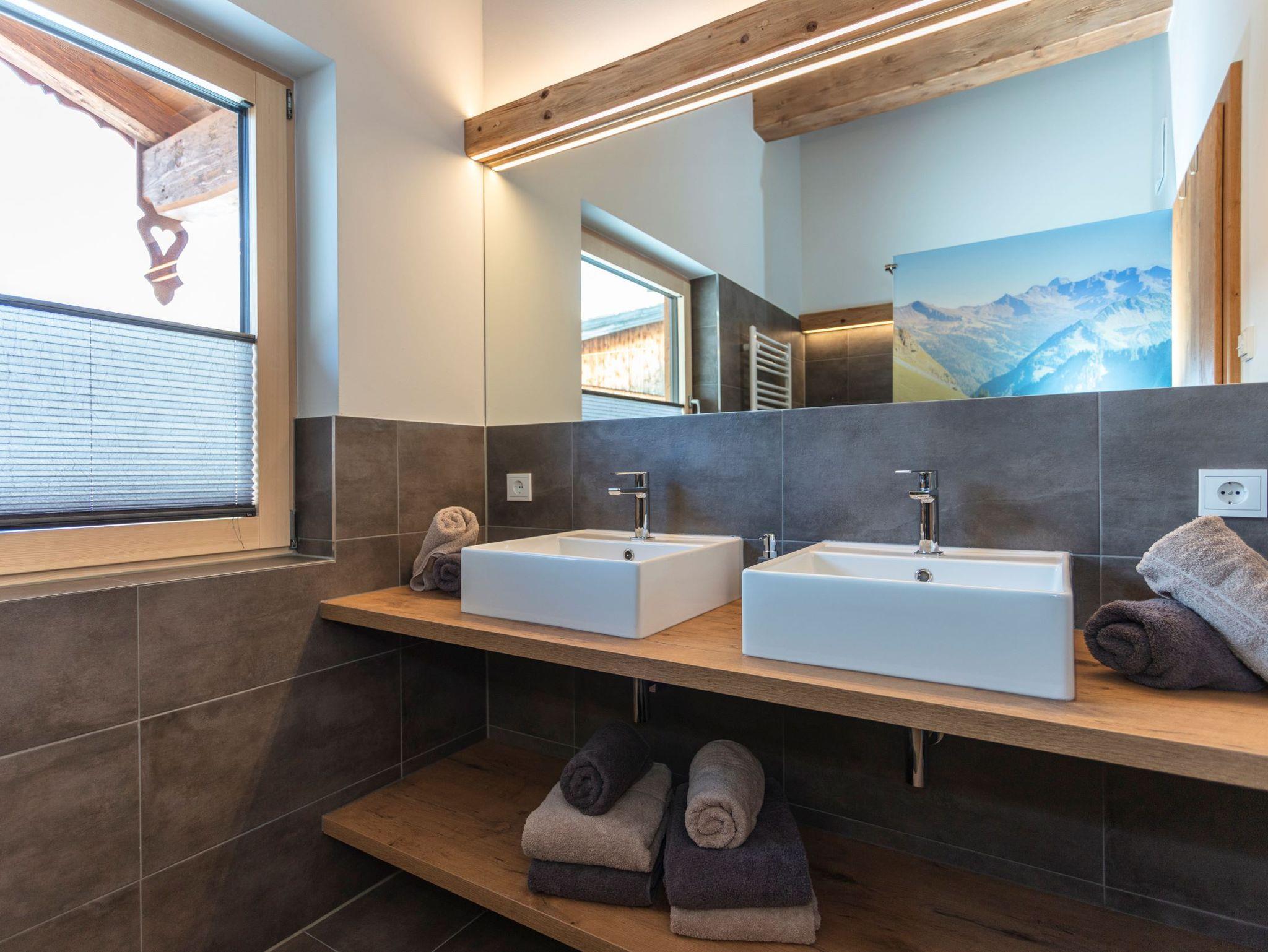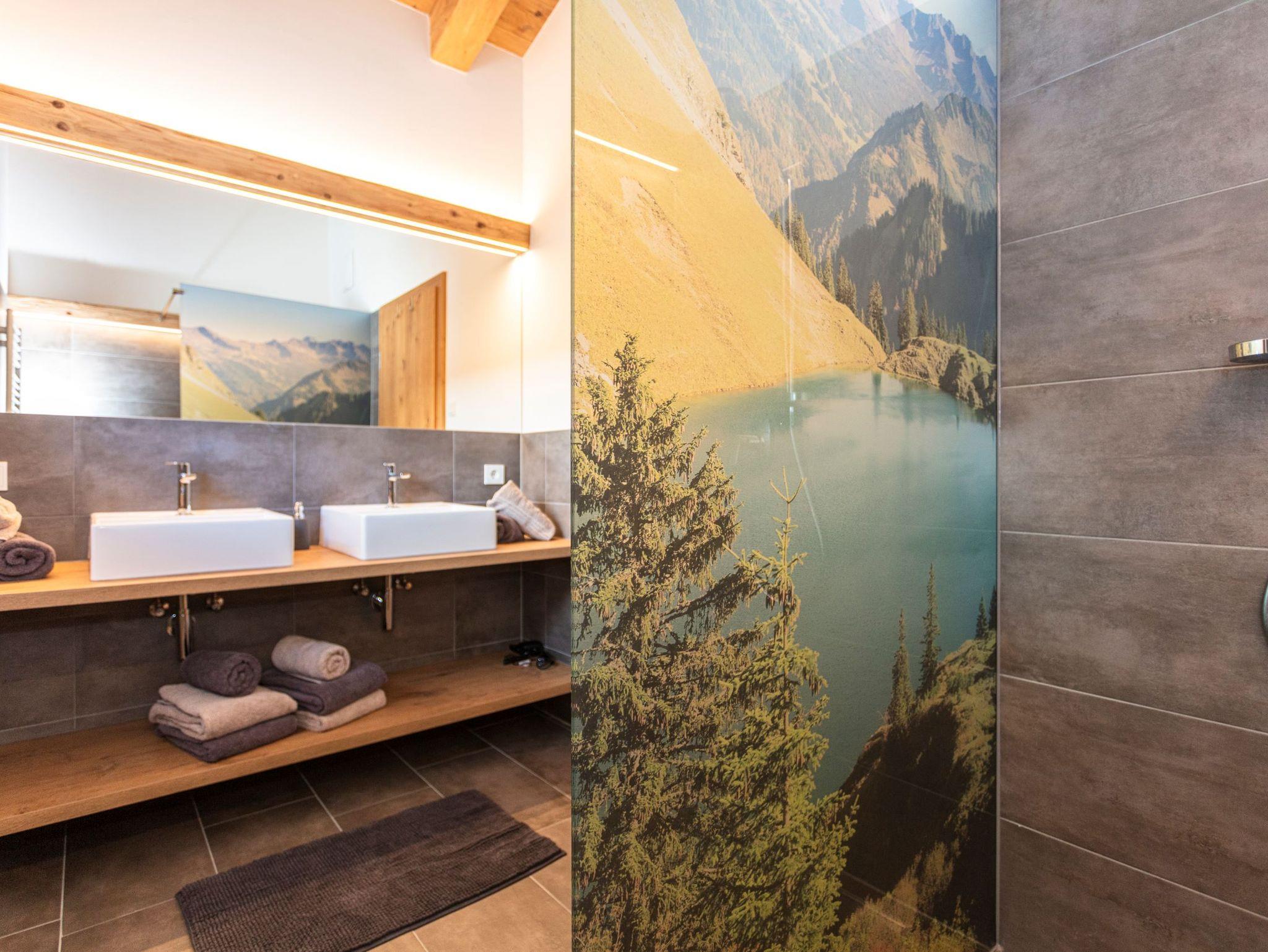 • Bad mit großzügiger Dusche, Handtuchtrockner, Doppelwaschbecken und Fön