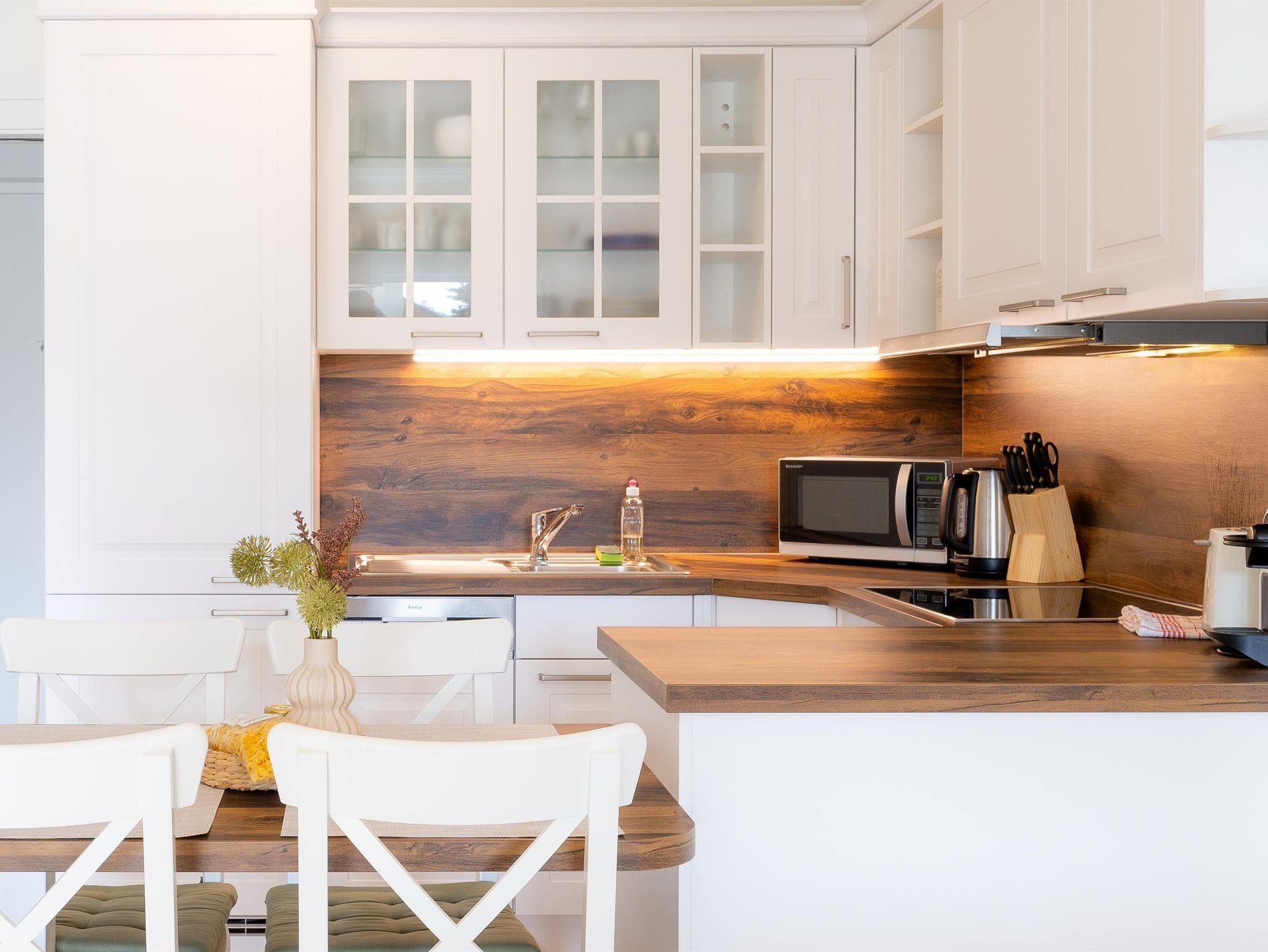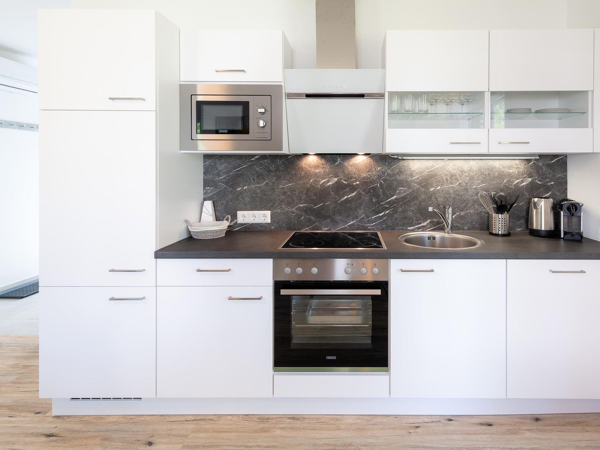 Voll ausgestattete, moderne Küche mit Cerankochfeld, Backofen, Dunstabzugshaube, Geschirrspüler, Kühlschrank mit Gefrierfach, Kaffeemaschine(Kapseln-Nespresso), Mikrowelle, Wasserkocher, Toaster, Geschirrtücher und selbstverständlich ausreichend Geschirr, Pfannen und Töpfe.