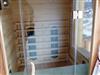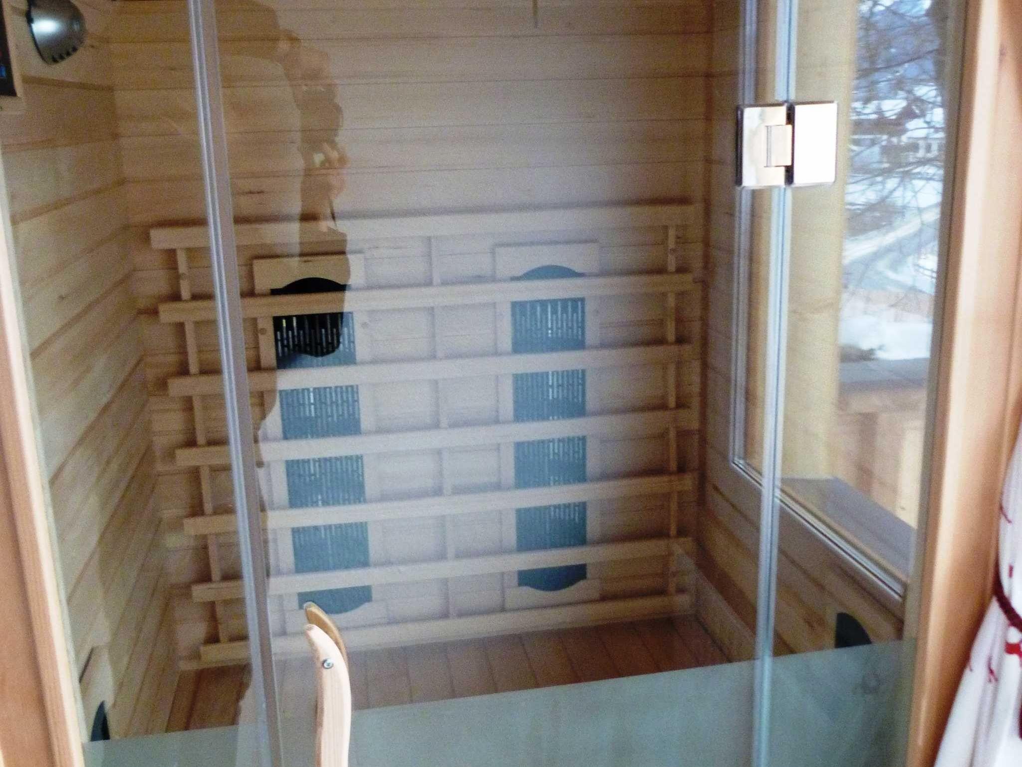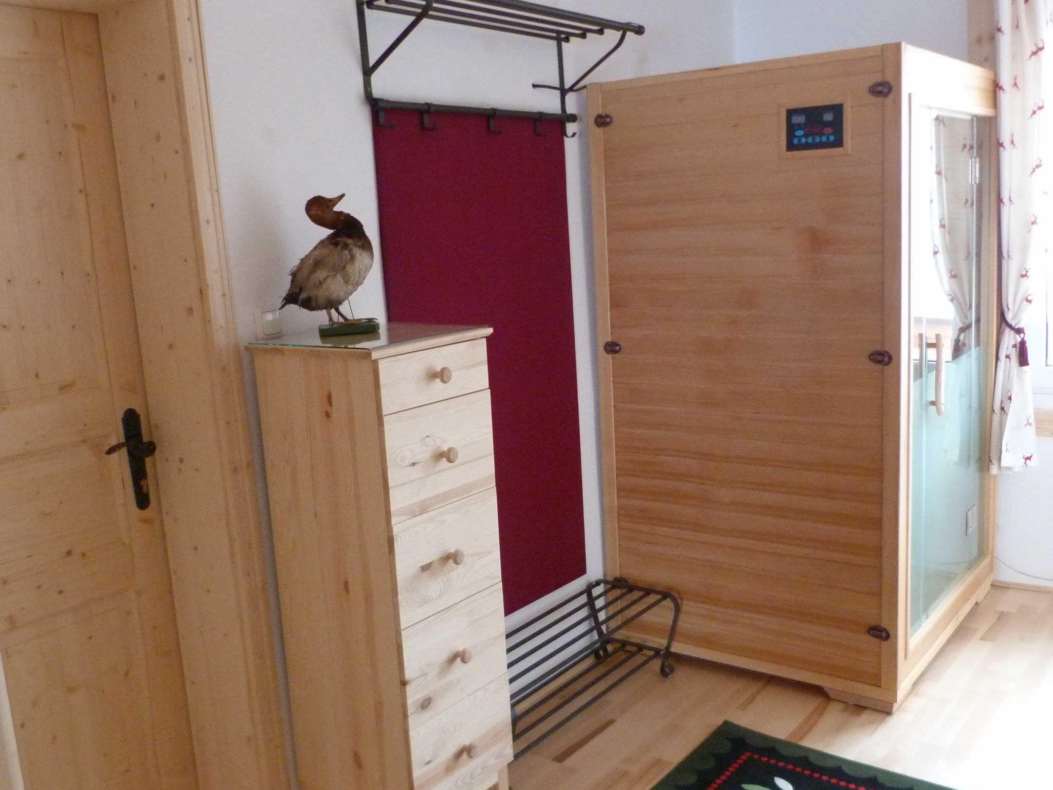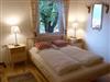 5-Zimmer-Chalet 85 m2 ebenerdig, romantisch und mit viel Holz eingerichtet: Eingang. 1 Doppelzimmer mit E-Heizung und SAT-TV, 1 Doppelzimmer mit E-Heizung und Pelletsofen.