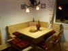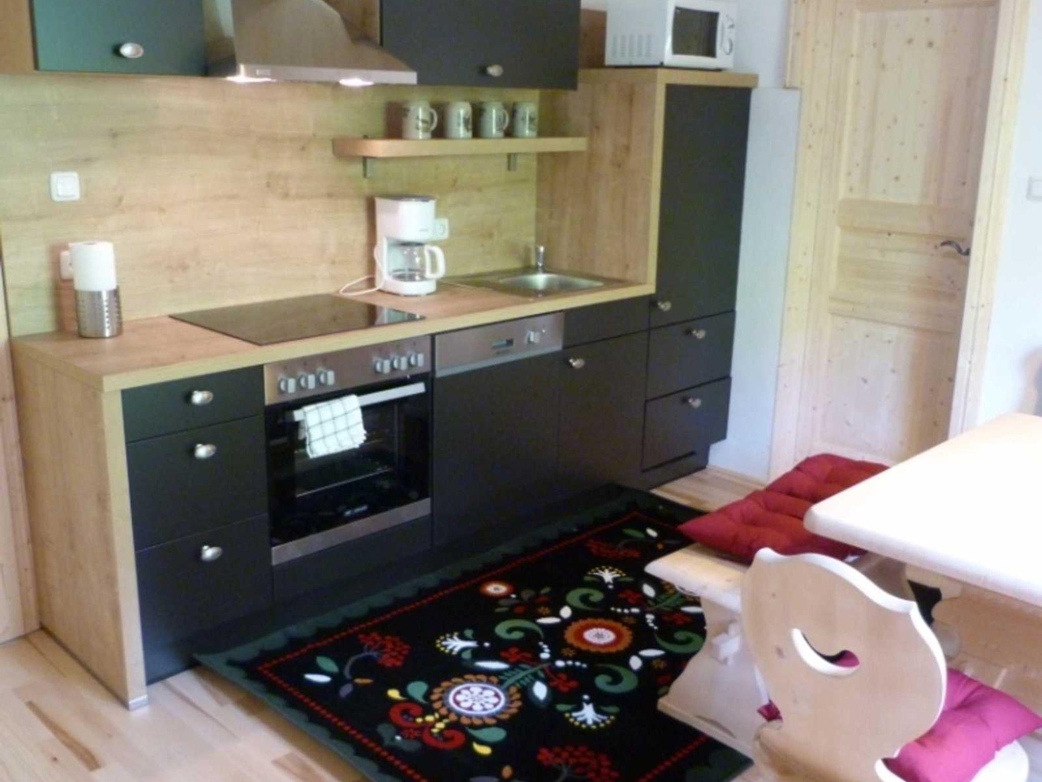 Pelletsofen. Wohnküche (4 Kochplatten, Backofen, Geschirrspüler, Glaskeramikherd, Mikrowelle, Tiefkühler, elektrische Kaffeemaschine) mit Essecke. Offenes Wohn-/Schlafzimmer mit Doppeldiwanbett (2 x