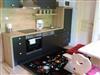 Wohnküche (4 Kochplatten, Backofen, Geschirrspüler, Glaskeramikherd, Mikrowelle, Tiefkühler, elektrische Kaffeemaschine) mit Essecke. Offenes Wohn-/Schlafzimmer mit Doppeldiwanbett (2 x 90cm, Länge