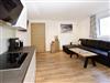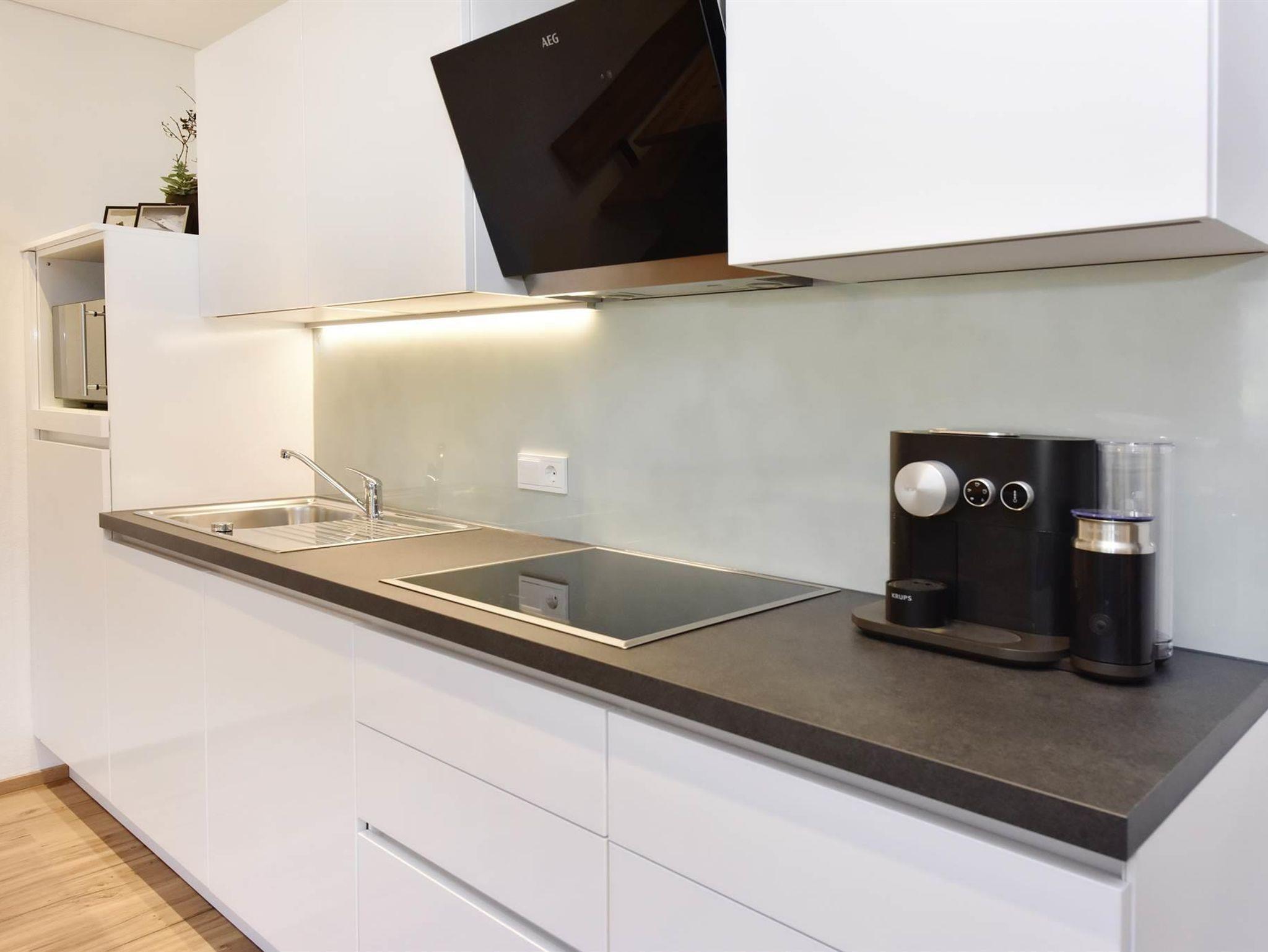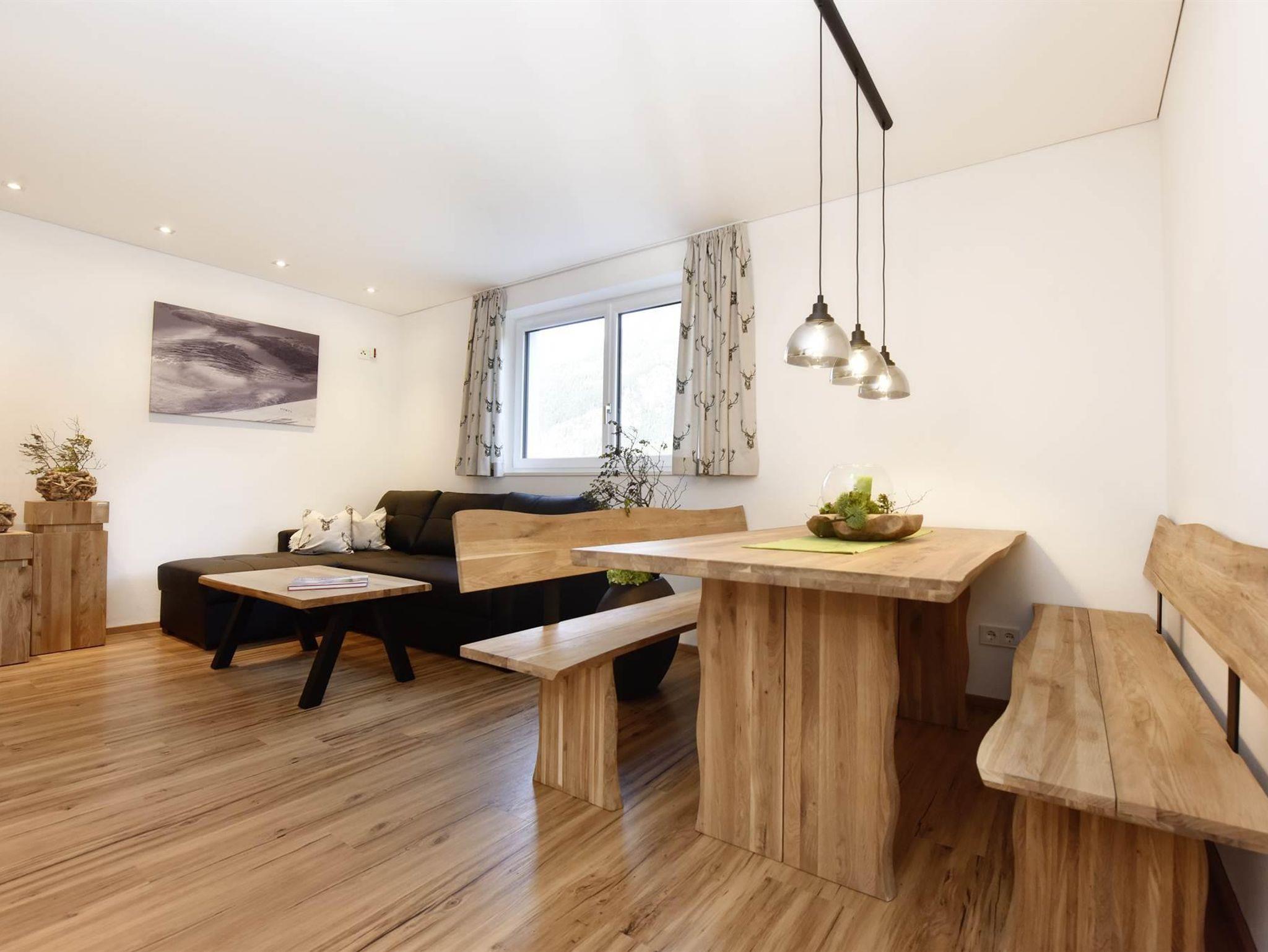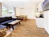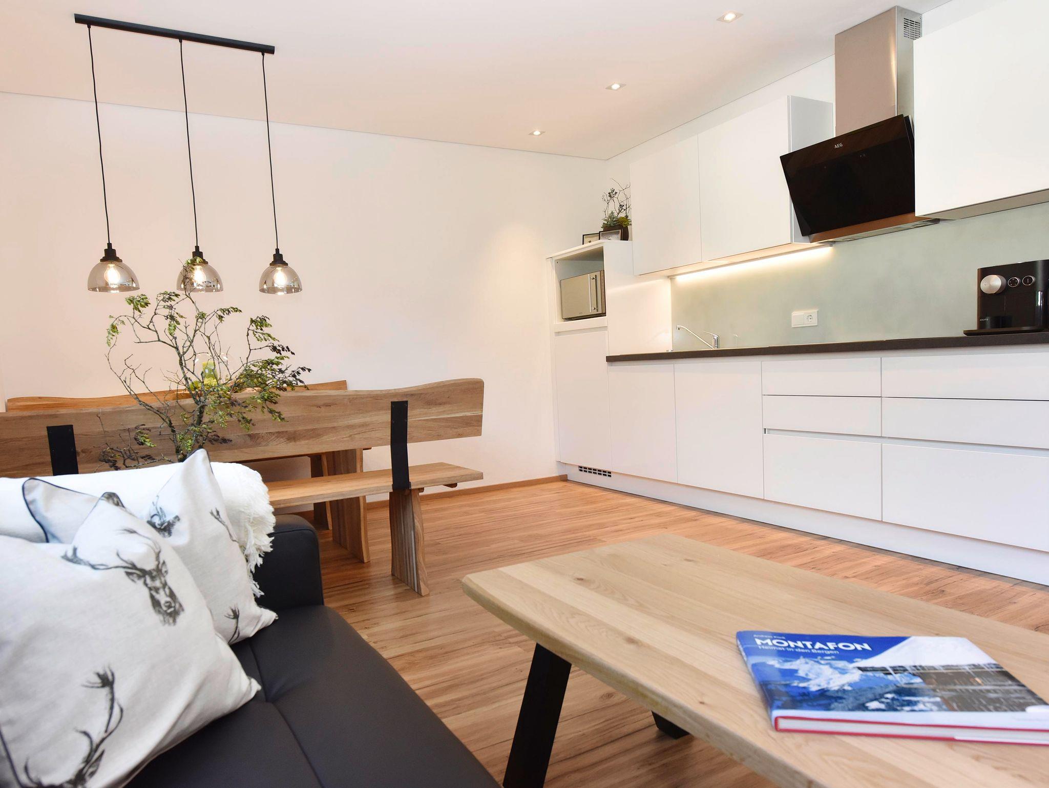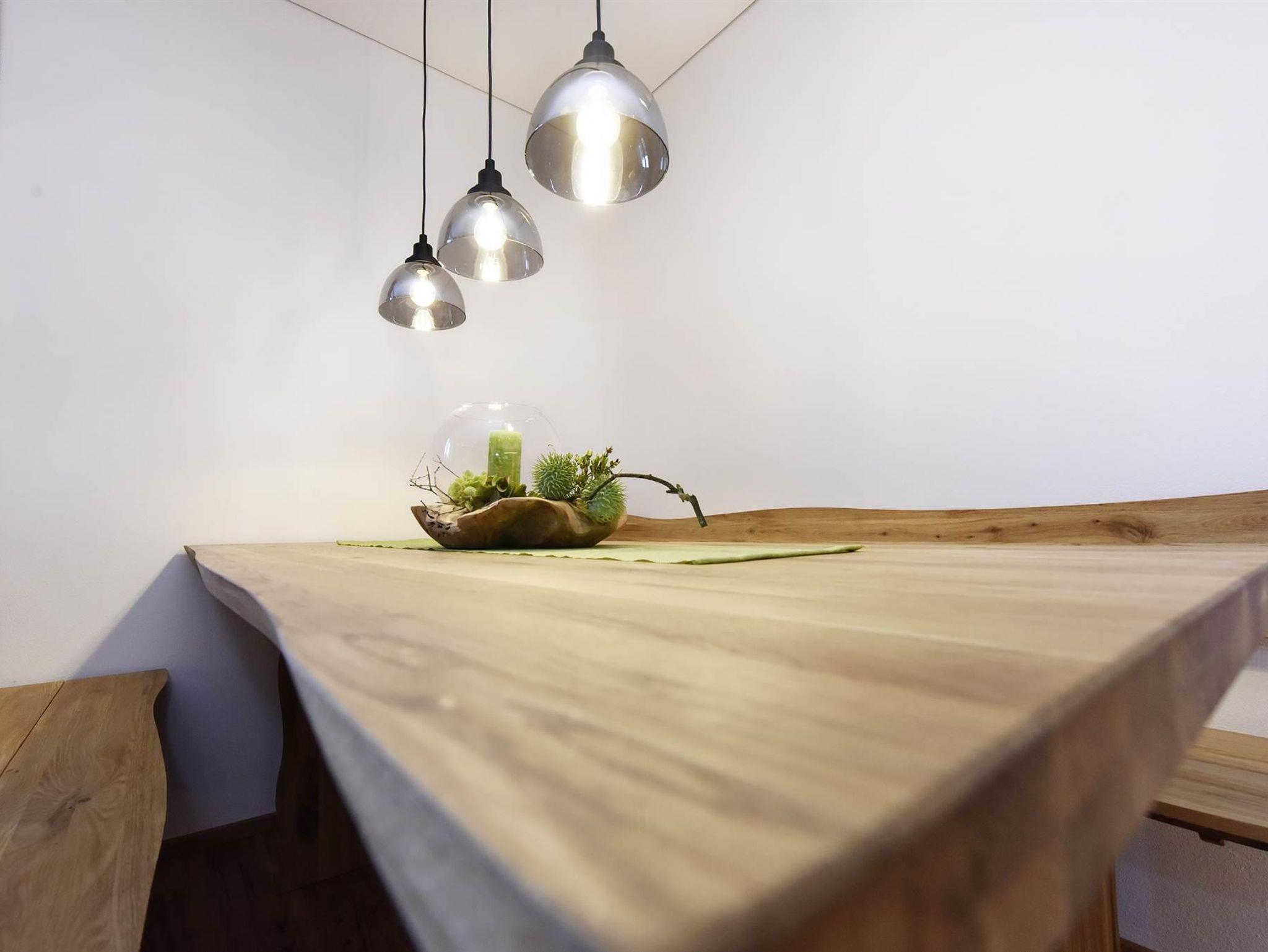1 Esswohnbereich mit großem Esstisch und Sofa sowie vollausgestattete Küche: Geschirrspüler, Ceranfeld, Kühlschrank mit Eisfach, Geschirrtücher, TV und gratis WLAN.