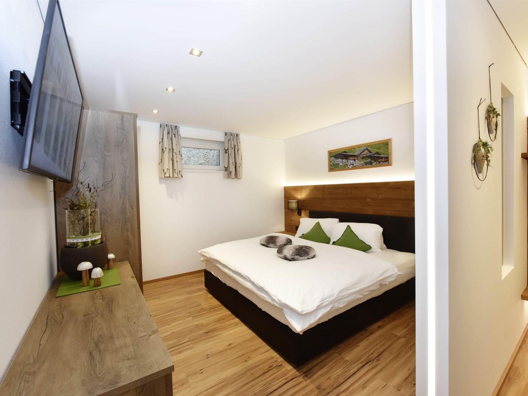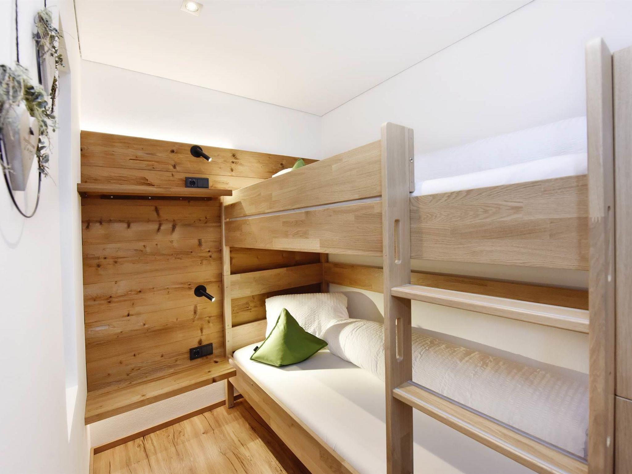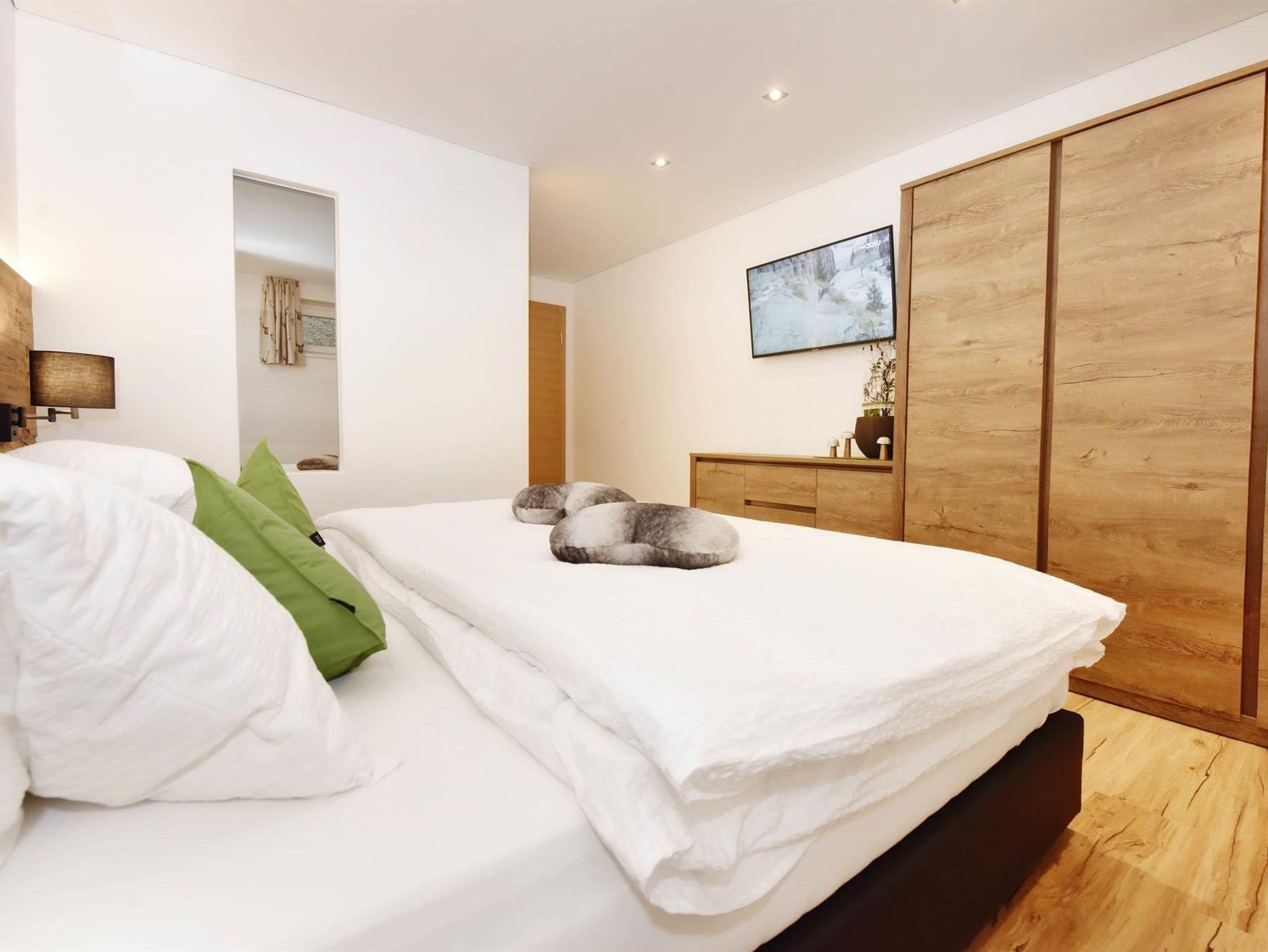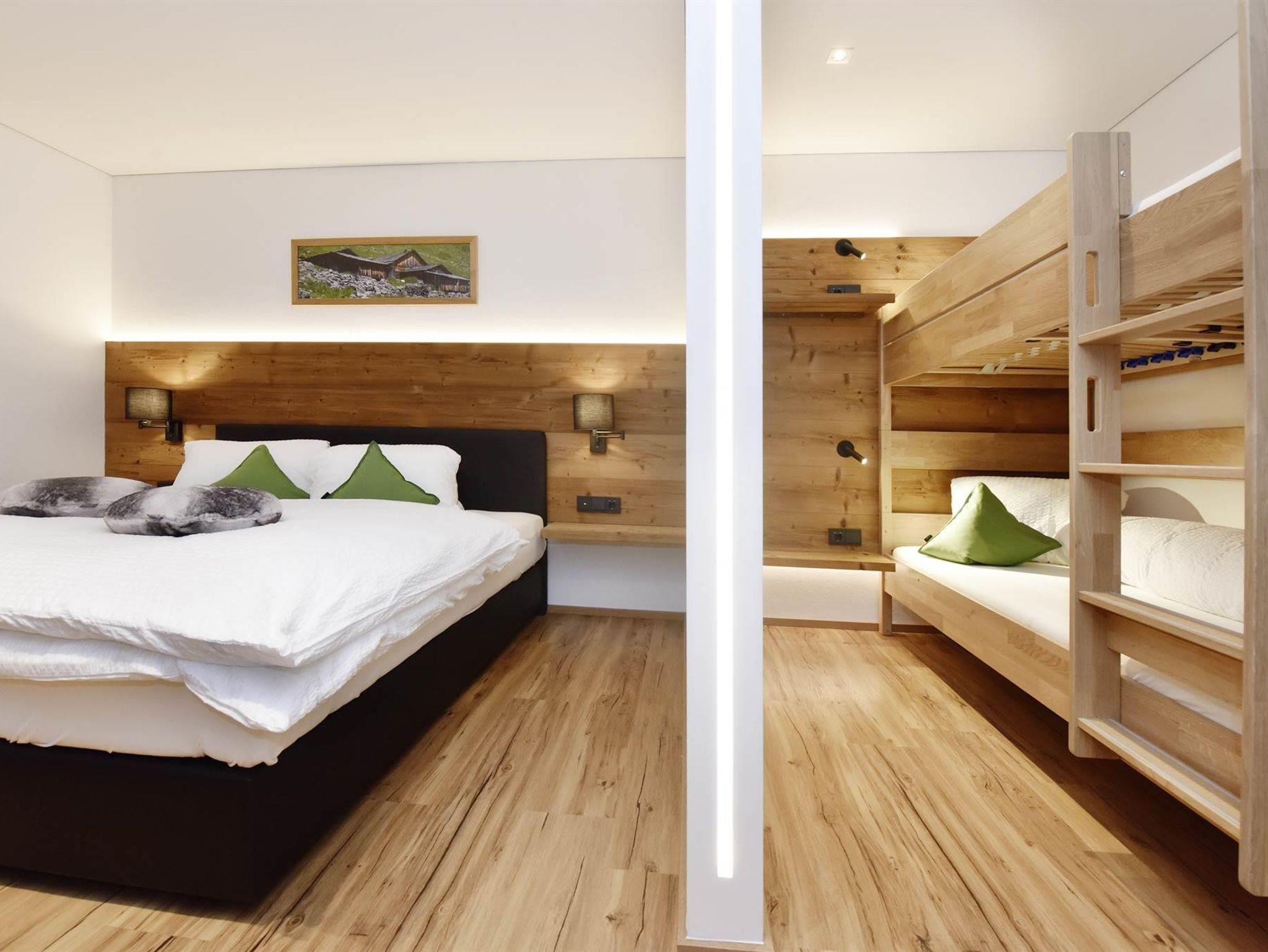 1 Schlafzimmer mit Doppelbett und Stockbett durch Trennwand geteilt incl. Bettwäsche und TV.