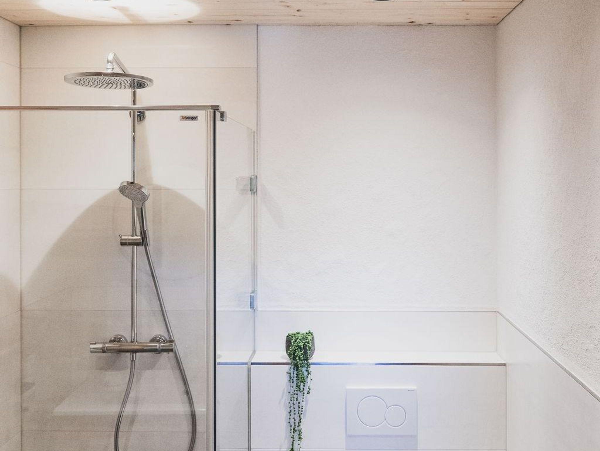 • Badezimmer mit bodenebener Dusche, WC und Fön