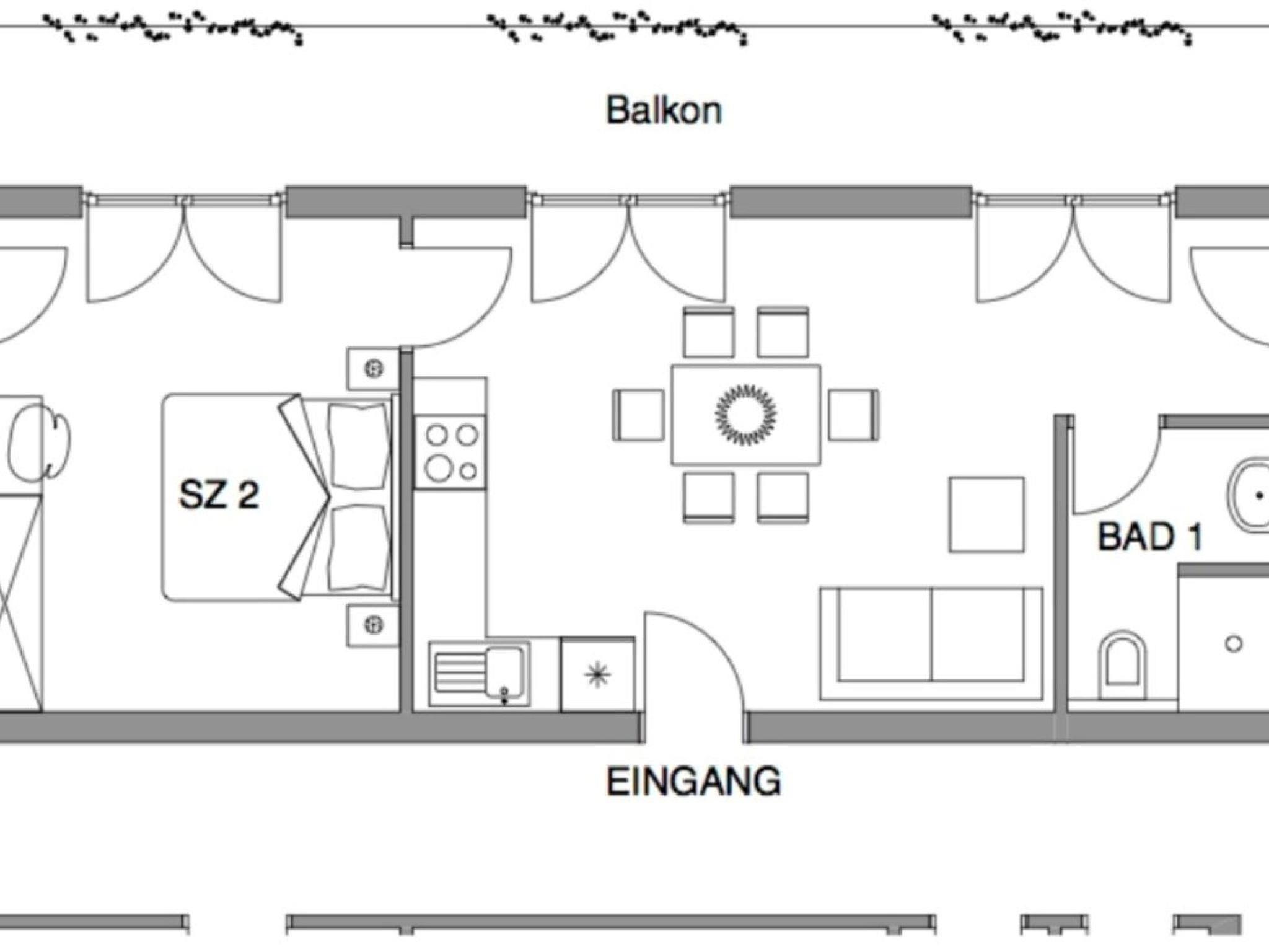 "Sonnenblume", 4-room apartment 75 m2, on the upper ground floor. Bright, cosy furnishings: living/dining room with dining table. Exit to the balcony. Walk-through room with 1 double bed and satellite TV (flat screen). Exit to the balcony. 1 double bedroom with shower/WC and satellite TV (flat screen). Exit to the balcony. 1 double bedroom with satellite TV (flat screen). Exit to the balcony. Open kitchen (oven, dishwasher, 4 ceramic glass hob hotplates, toaster, kettle, microwave, electric coffee machine). Shower/WC. Solar energy heating. Parquet floors. Large balcony. Balcony furniture. Facilities: Internet (WiFi, free).