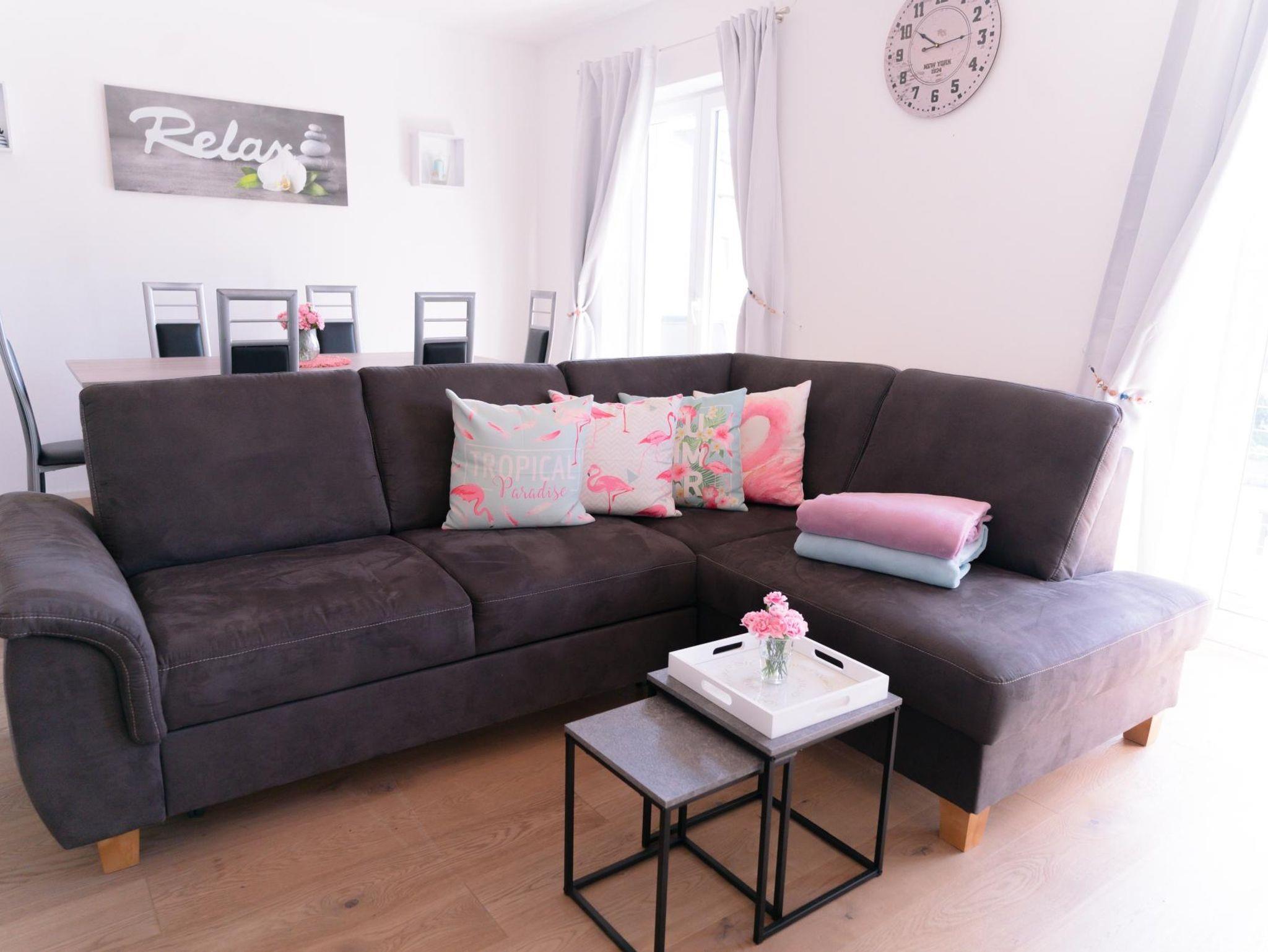 Das Apartment verfügt über 2 Schlafzimmer, eines mit einem gemütlichen Doppelbett und eines mit zwei Einzelbetten, die zu einem Doppelbett zusammengeschoben werden können. Die Lounge im Wohnbereich bietet eine gemütliche Sitz- und Schlafgelegenheit für weitere 2 Personen. In der hellen Wohnküche befindet sich ein (ausziehbarer) Essbereich, der Platz für 6 Personen bietet und eine voll ausgestattete Küche. Der schöne Sonnenbalkon ist vom Wohnzimmer, dem Essbereich und dem Schlafzimmer aus erreichbar. Das Badezimmer ist mit einer Badewanne, einer Dusche, einem WC, einem Waschtrockner und einem Handtuchtrockner ausgestattet. Zusätzlich gibt es noch ein separates WC. Ein Carport- Stellplatz vor dem Haus steht kostenlos zur Verfügung.