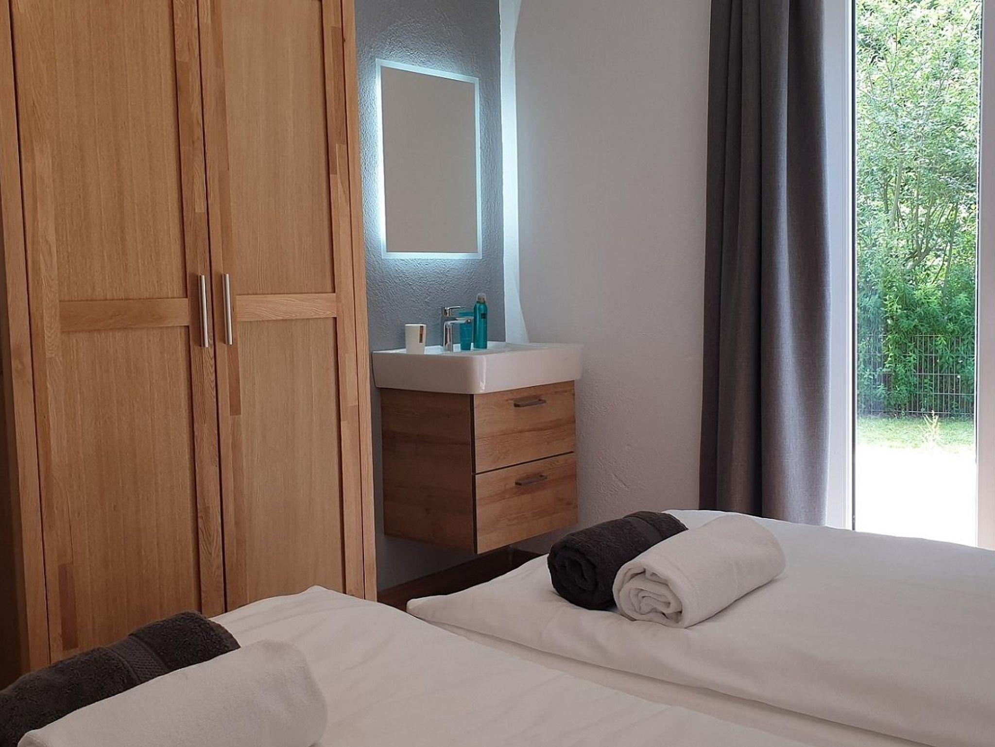 • 1 Doppelzimmer mit Boxspringbetten* & Flat-TV; Zugang zur Terrasse;