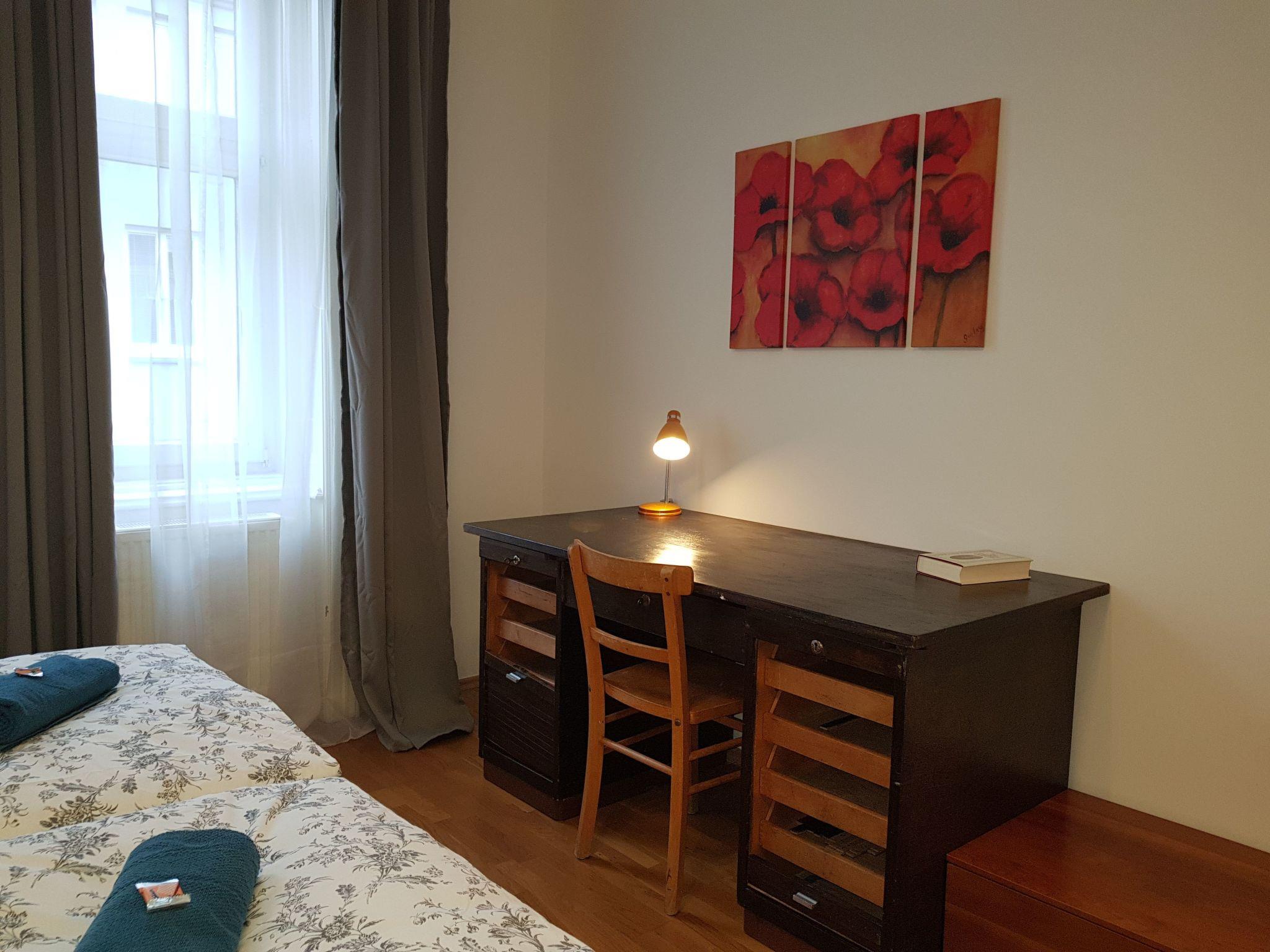 The accommodation has a fully equipped kitchen, 2 separate bedrooms and a living room/bedroom. All 3 rooms have a large wardrobe. As is usual in the old Viennese town houses, there is a bathroom with washbasin and bathtub. The WC is located in a separate room.