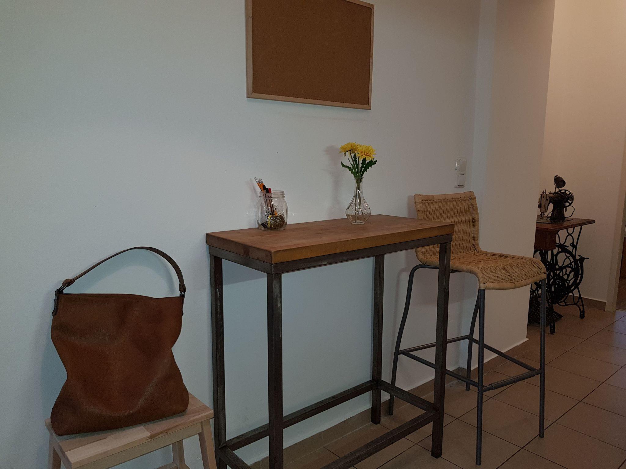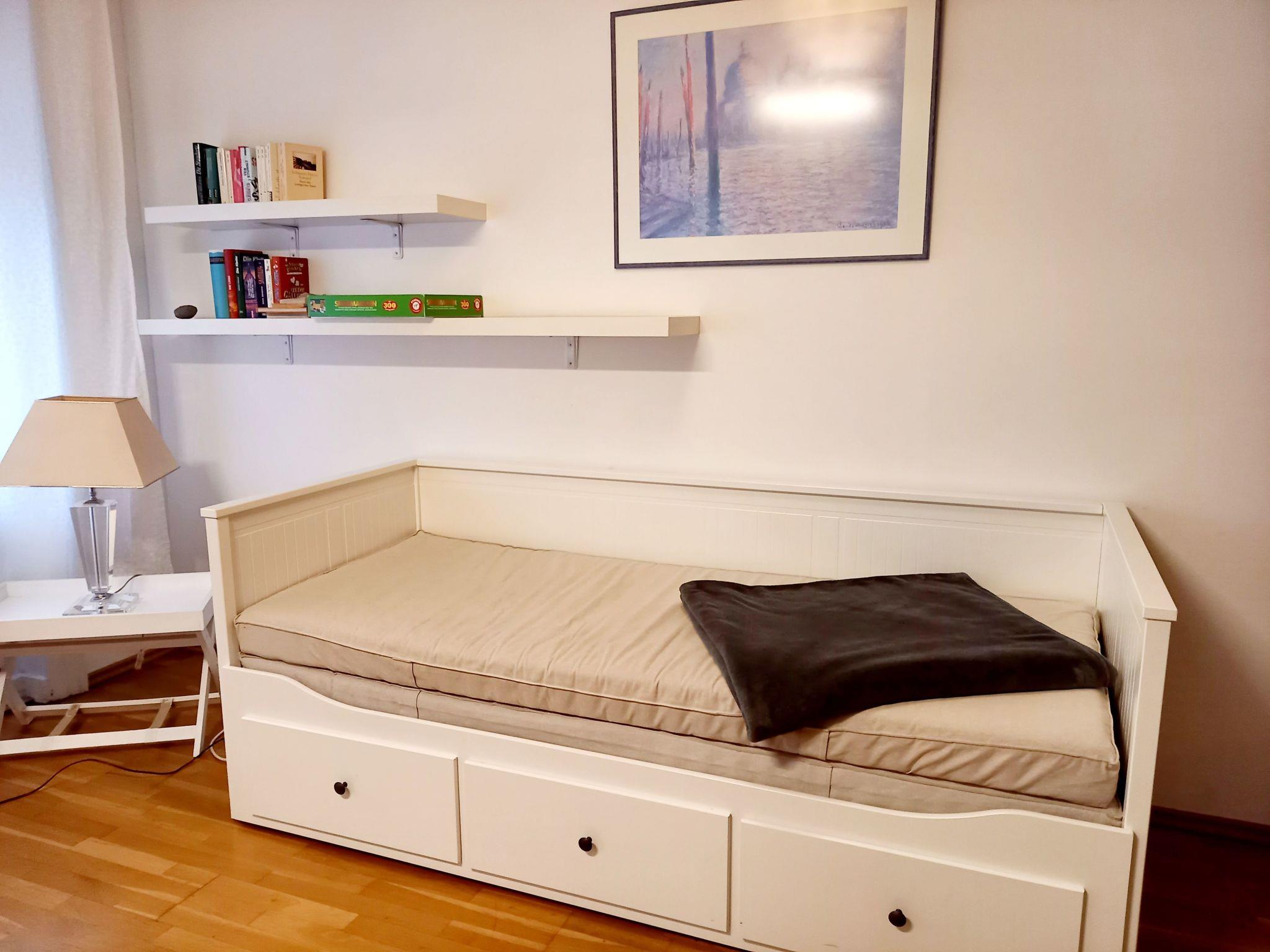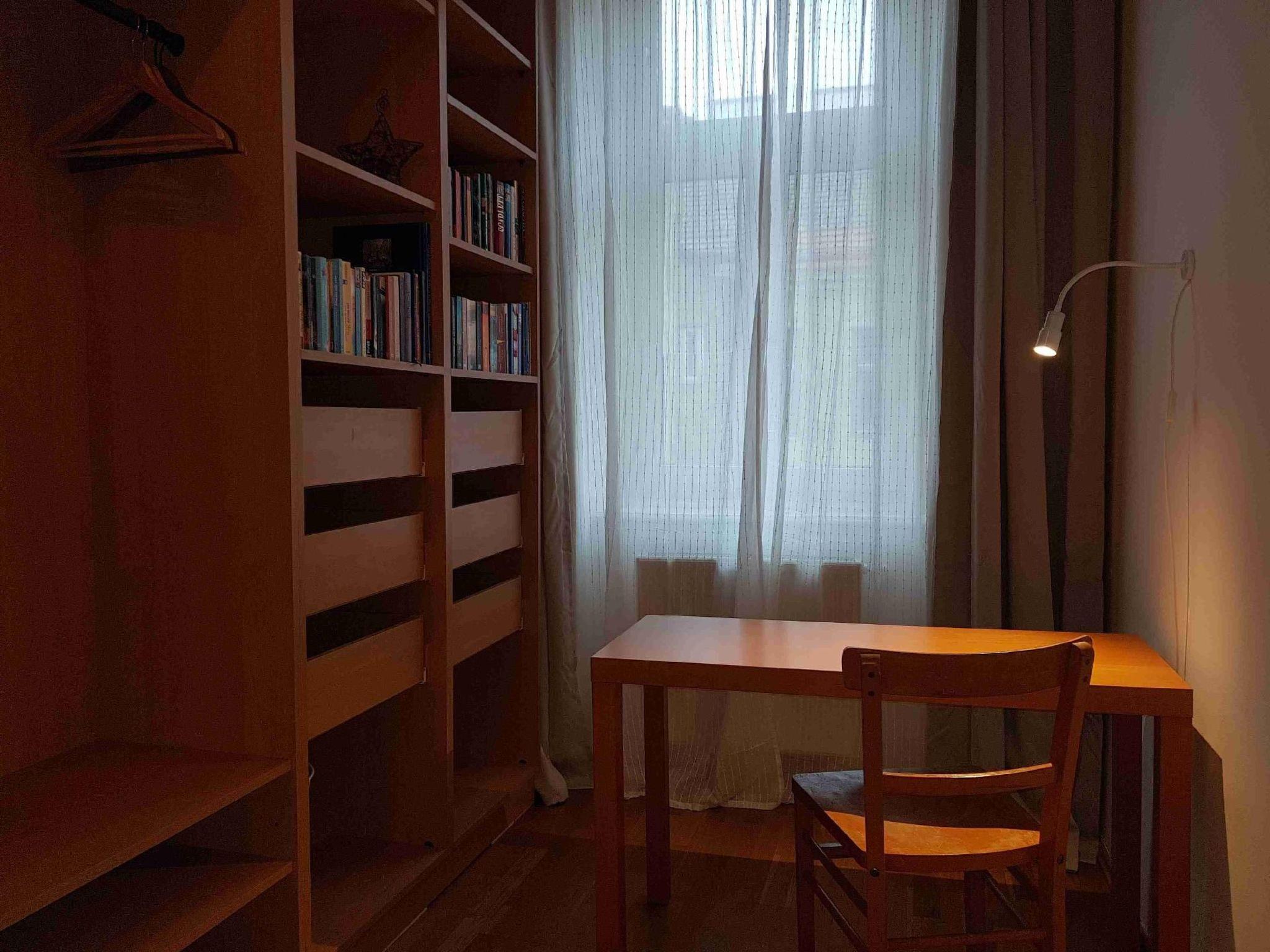 The living room has a dining table and a sofa bed, which can also serve as a sofa bed for two people with a width of 1.60 metres. The windows face a large, wide street, so it is very bright, but you can also hear the traffic noise.