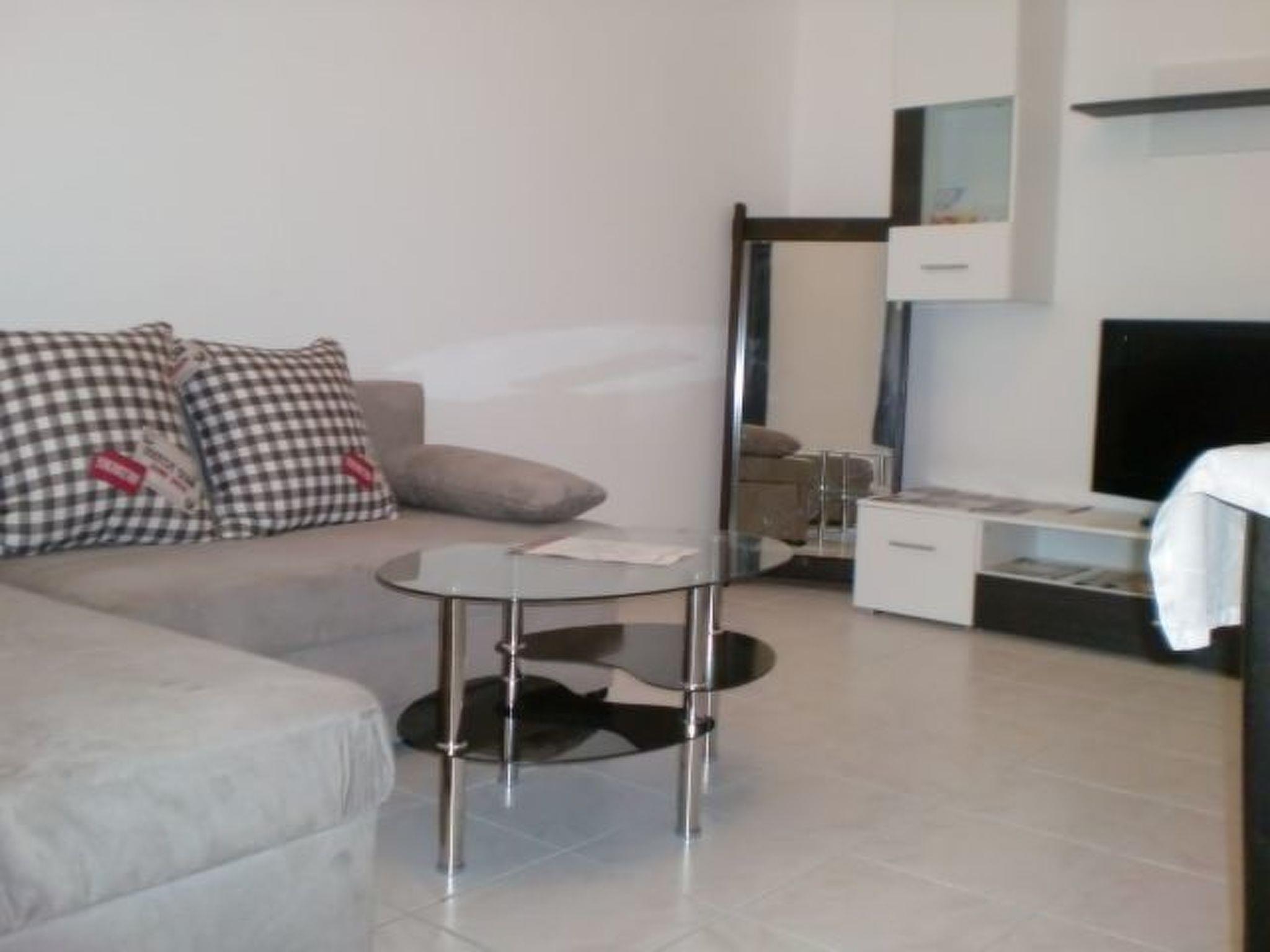 This flat is on the first floor and offers 45 m² of space for two people. The flat has a tiled floor and is divided into an entrance area, a bathroom with toilet, a living room with kitchen and a bedroom. The living room has a sofa, coffee table, a living room cupboard and a dining area with a table and two chairs. The kitchenette consists of a cooker, capsule coffee machine, microwave, fridge, sink and kettle. The bathroom has a shower, WC and washbasin. The bedroom has a 180 cm wide double bed with bedside table and a spacious wardrobe.