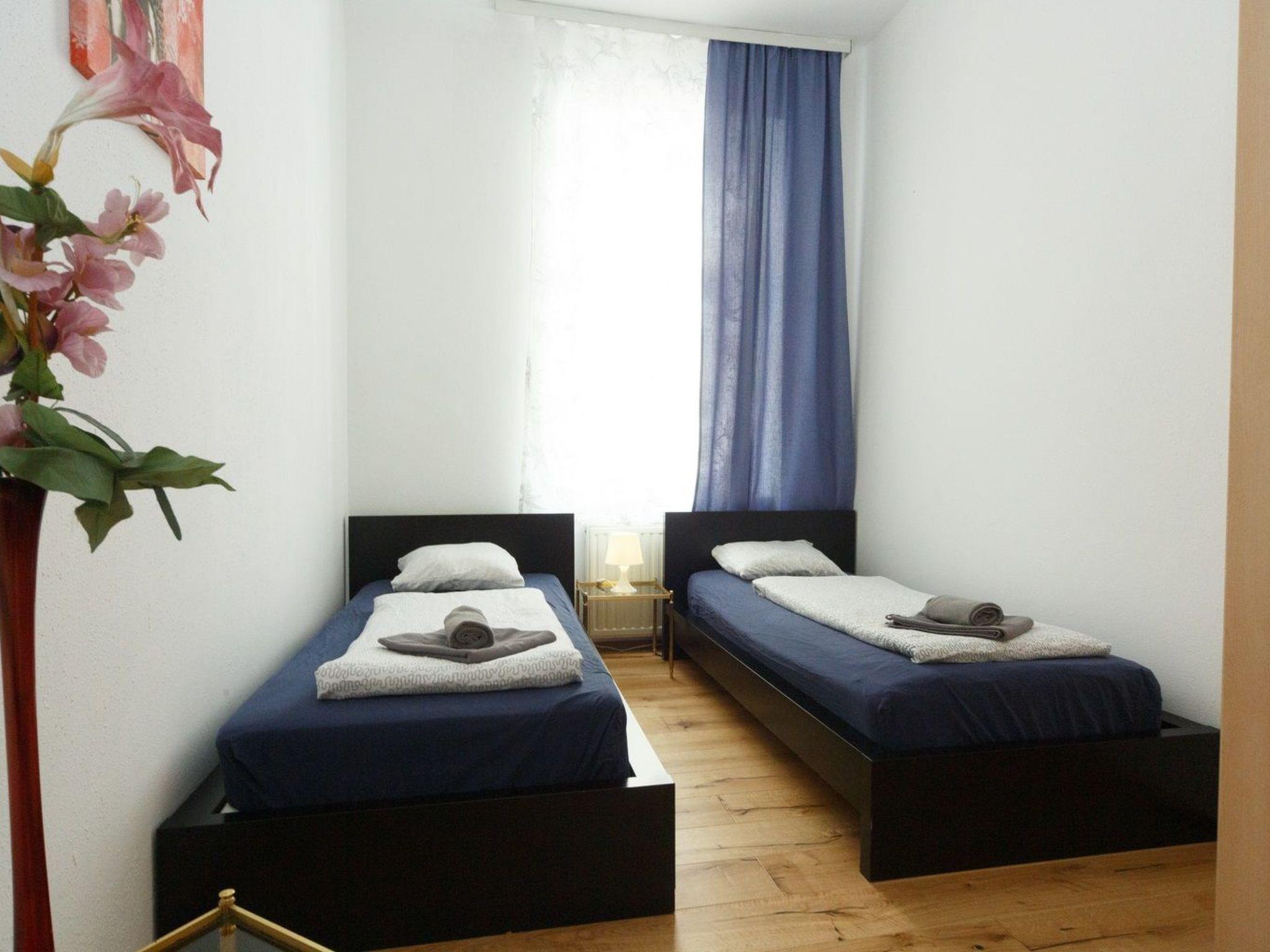 This flat is on the first floor facing the street and offers 70 m² of space for four people. The living area has parquet flooring, the sanitary area has a tiled floor. The 4 m² anteroom has a cloakroom with mirror and storage space. The 27 m² living room with integrated kitchen offers you a living area with table and four armchairs, a TV and a cosy reading corner with an armchair. The open-plan kitchenette is fully equipped with a ceramic hob, oven, capsule coffee machine, extractor bonnet, sink, dishwasher and fridge/freezer. The 8 m² bathroom has a shower and two washbasins, a hairdryer and bath and hand towels. The separate WC is approx. 3 m² in size. There are two bedrooms in the flat, with the master bedroom measuring around 15 m² and featuring a box-spring bed (180 x 200 cm), a wardrobe and storage space. The second bedroom is 12 m² in size and has two single beds (90 x 200 cm), a wardrobe and storage space.