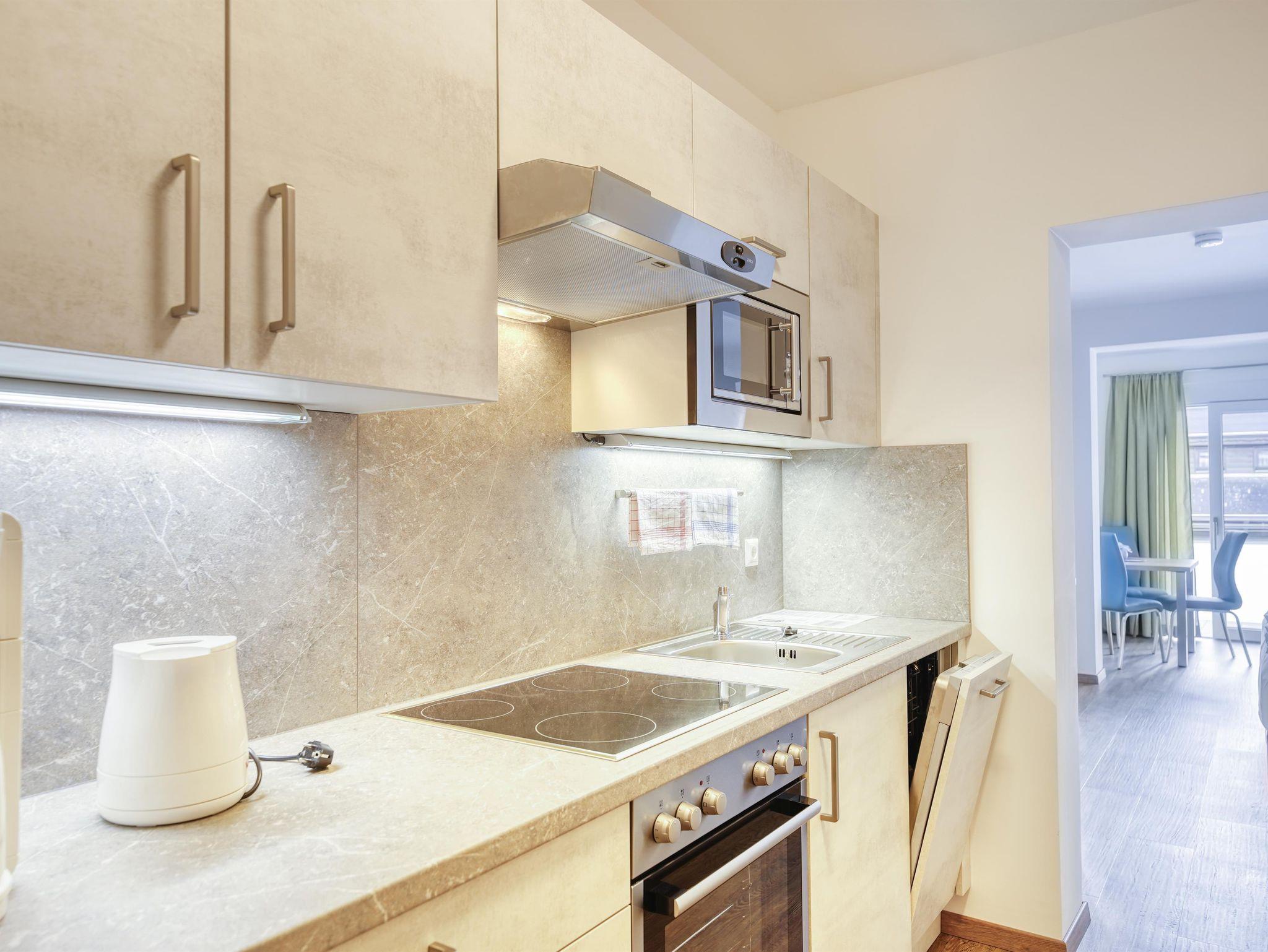 Unsere Ferienwohnung im Haus 1, ist mit 1 Wohnschlafraum, Küchenzeile - komplett eingerichtet mit Geschirrspüler Backrohr, Ceranfeld, Wasserkocher, Toaster und Kaffeefiltermaschine, Dusche, WC, Sat-TV, gratis WLAN und Balkon. Bade- und Handtücher, Bett und Tischwäsche sind vorhanden. Eigener Badestrand!