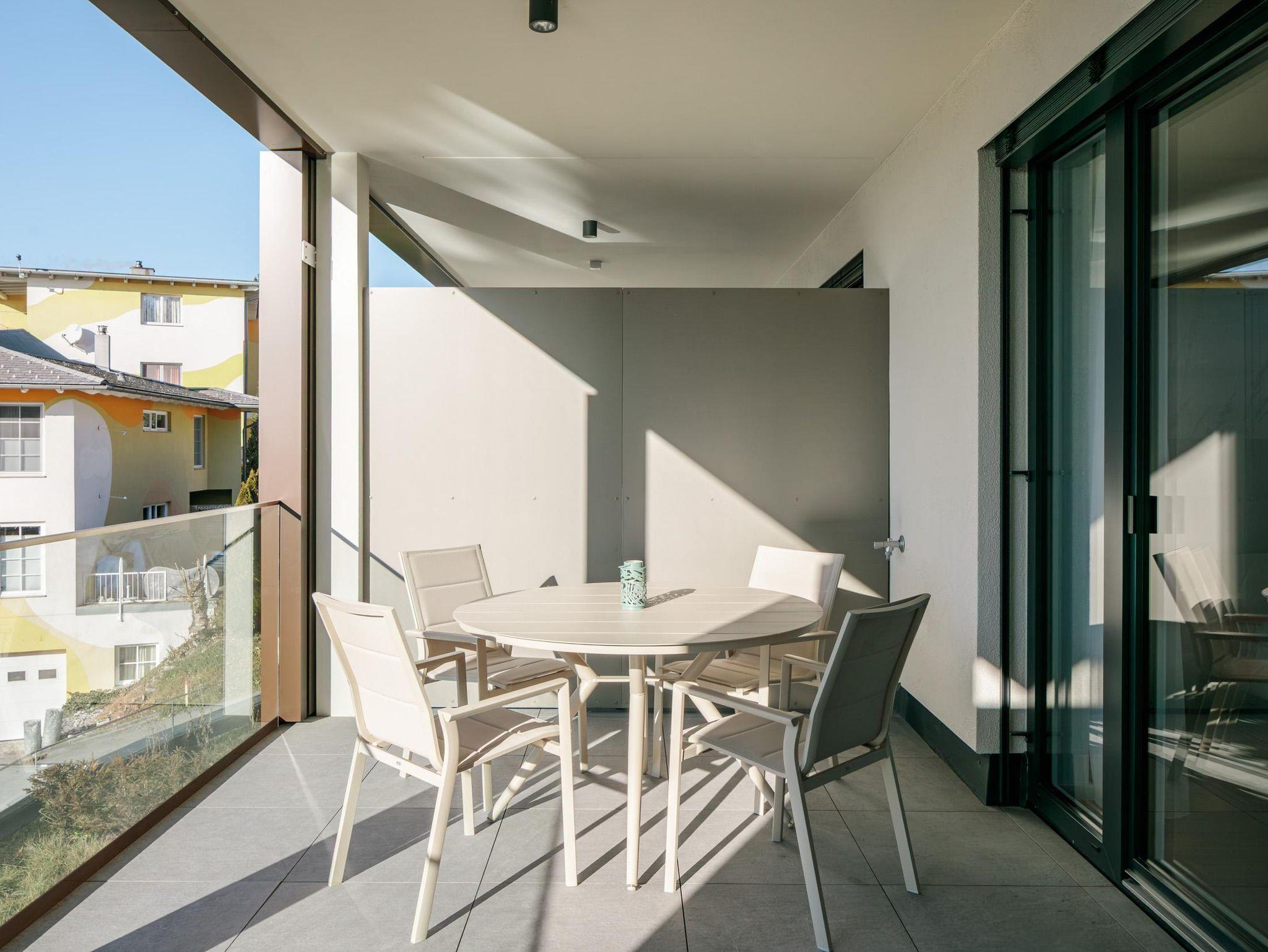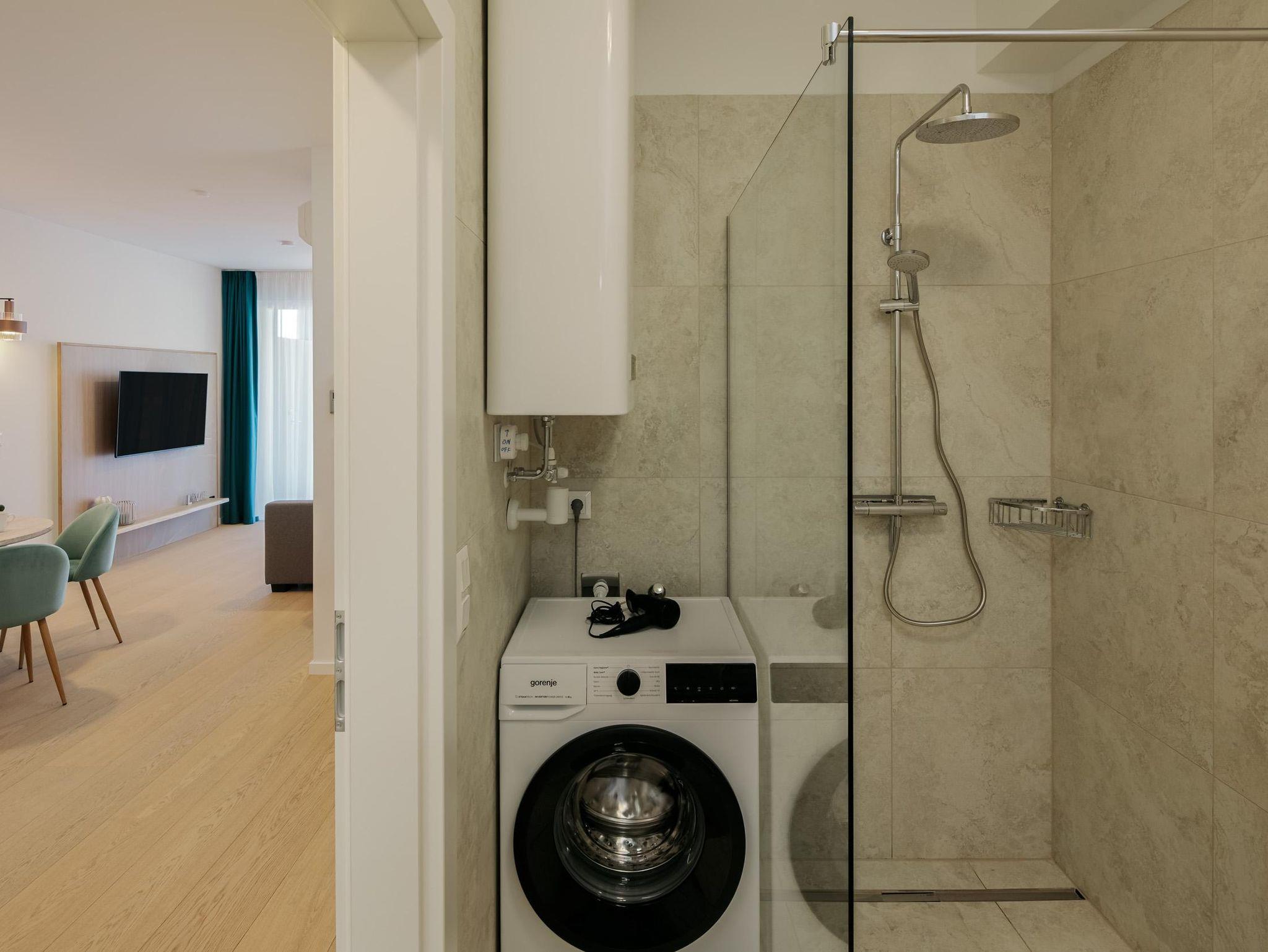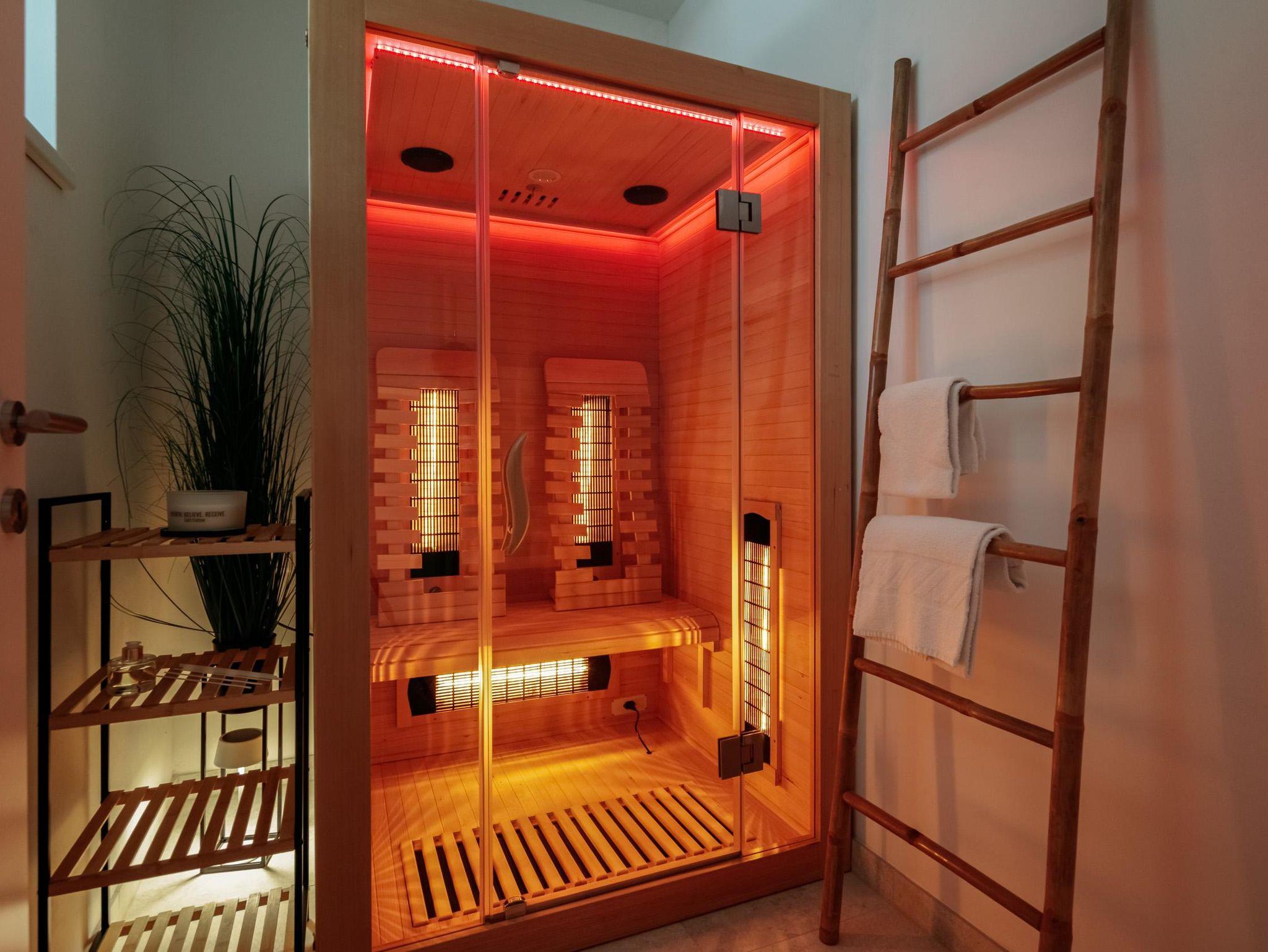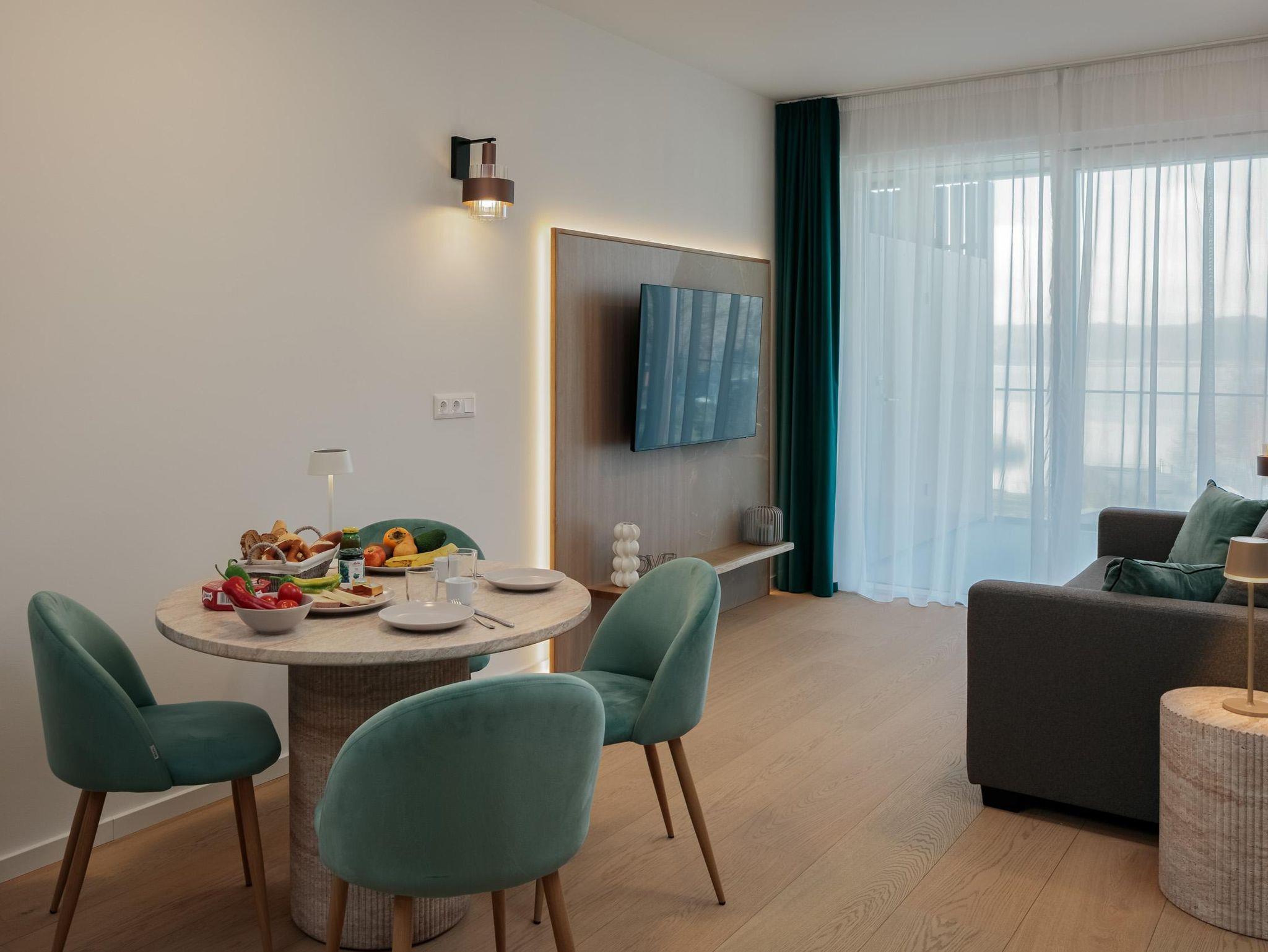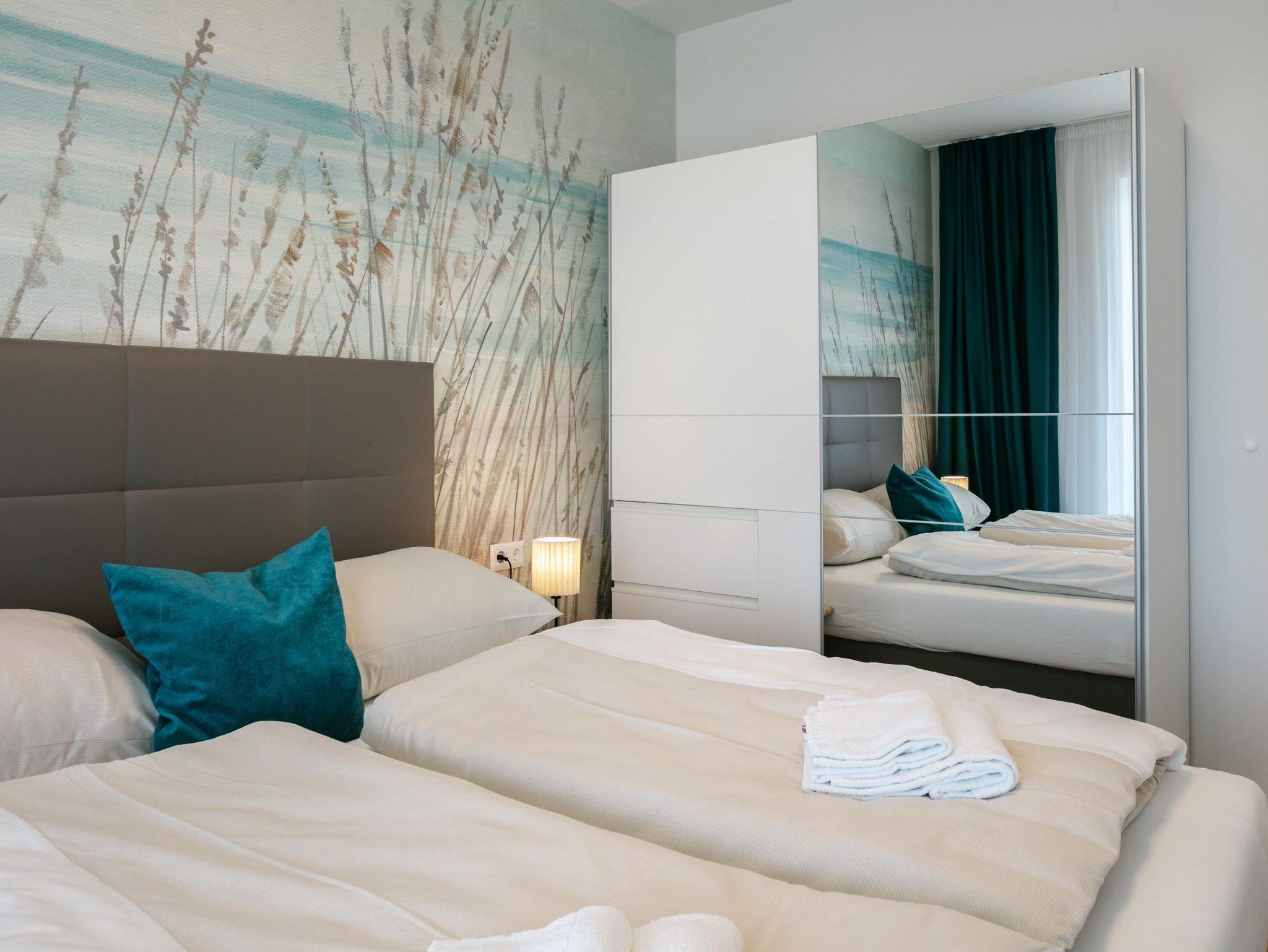 Die 46 m² große Ferienwohnung bietet Platz für 4 Personen. Die moderne Wohnung verfügt über ein Schlafzimmer sowie zwei weitere Schlafmöglichkeiten im Wohnzimmer auf dem Sofa, eine voll ausgestattete Küche und ein Badezimmer. Das Highlight der Wohnung ist eine Infrarotkabine für zwei Personen sowie der direkte Seezugang vor dem Gebäude. Zusätzlich steht ein Garagenplatz mit E-Ladestation (gegen Gebühr) zur Verfügung. Die Wohnung befindet sich im ersten Stock.