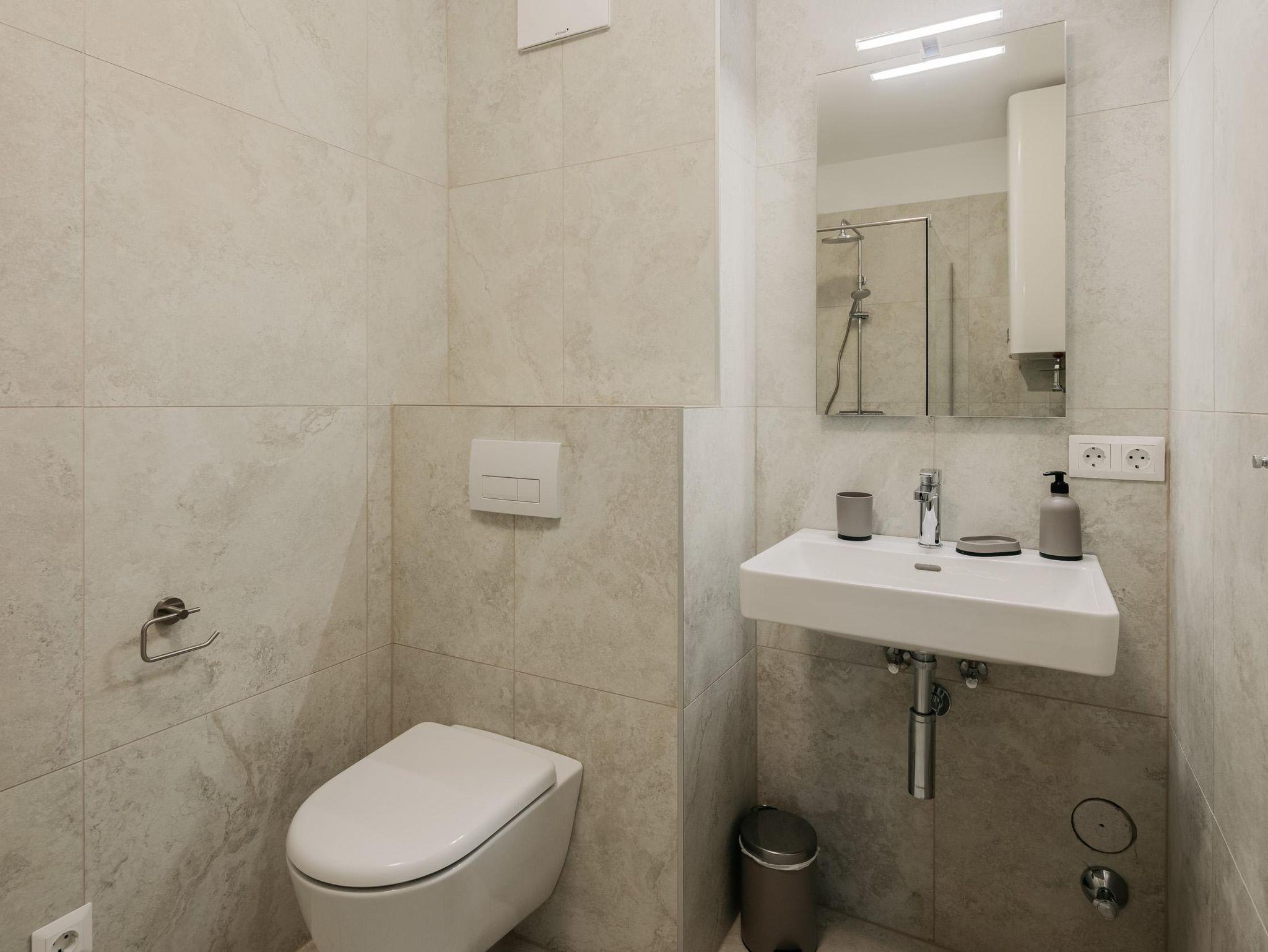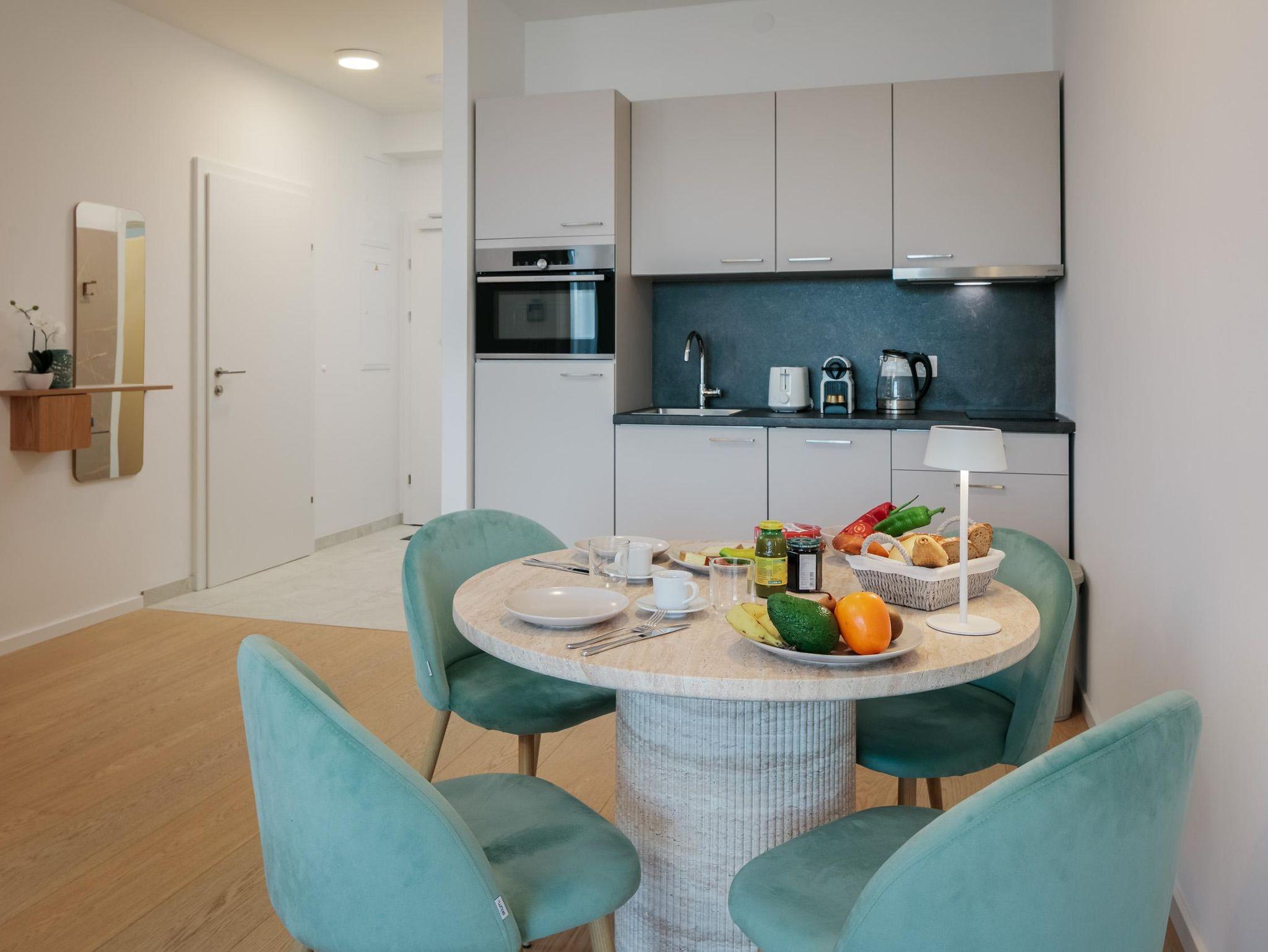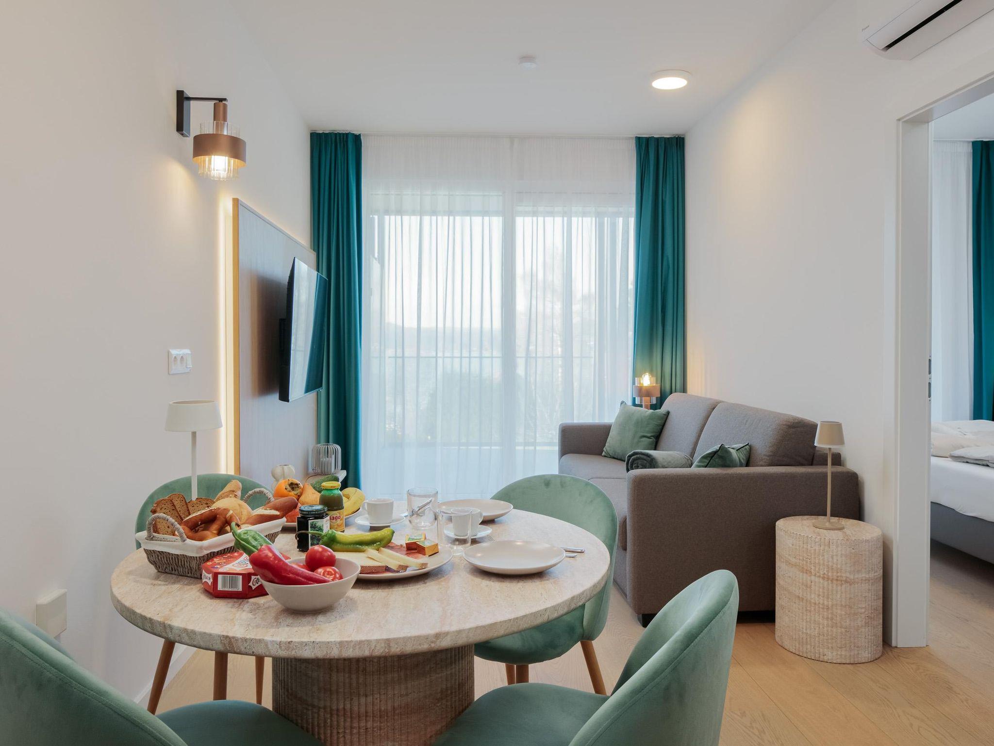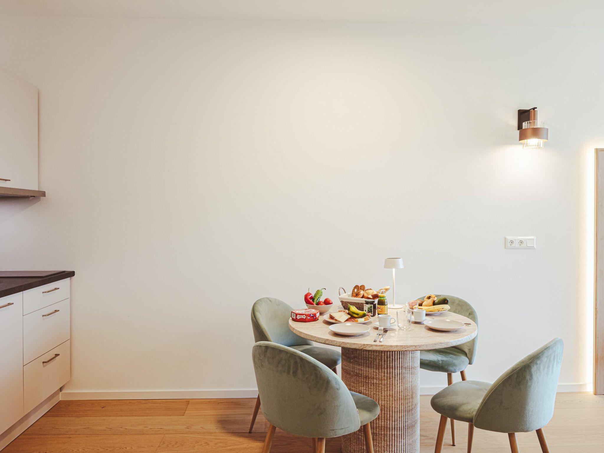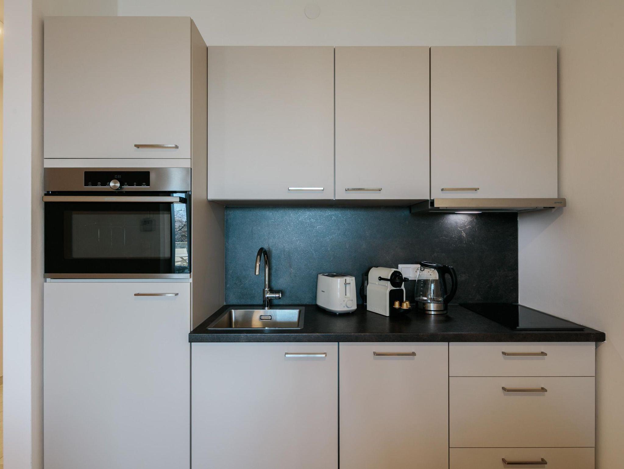 Die 46 m² große Ferienwohnung bietet Platz für 4 Personen. Die moderne Wohnung verfügt über ein Schlafzimmer sowie zwei weitere Schlafmöglichkeiten im Wohnzimmer auf dem Sofa, eine voll ausgestattete Küche und ein Badezimmer. Das Highlight der Wohnung ist eine Infrarotkabine für zwei Personen sowie der direkte Seezugang vor dem Gebäude. Zusätzlich steht ein Garagenplatz mit E-Ladestation (gegen Gebühr) zur Verfügung. Die Wohnung befindet sich im ersten Stock.