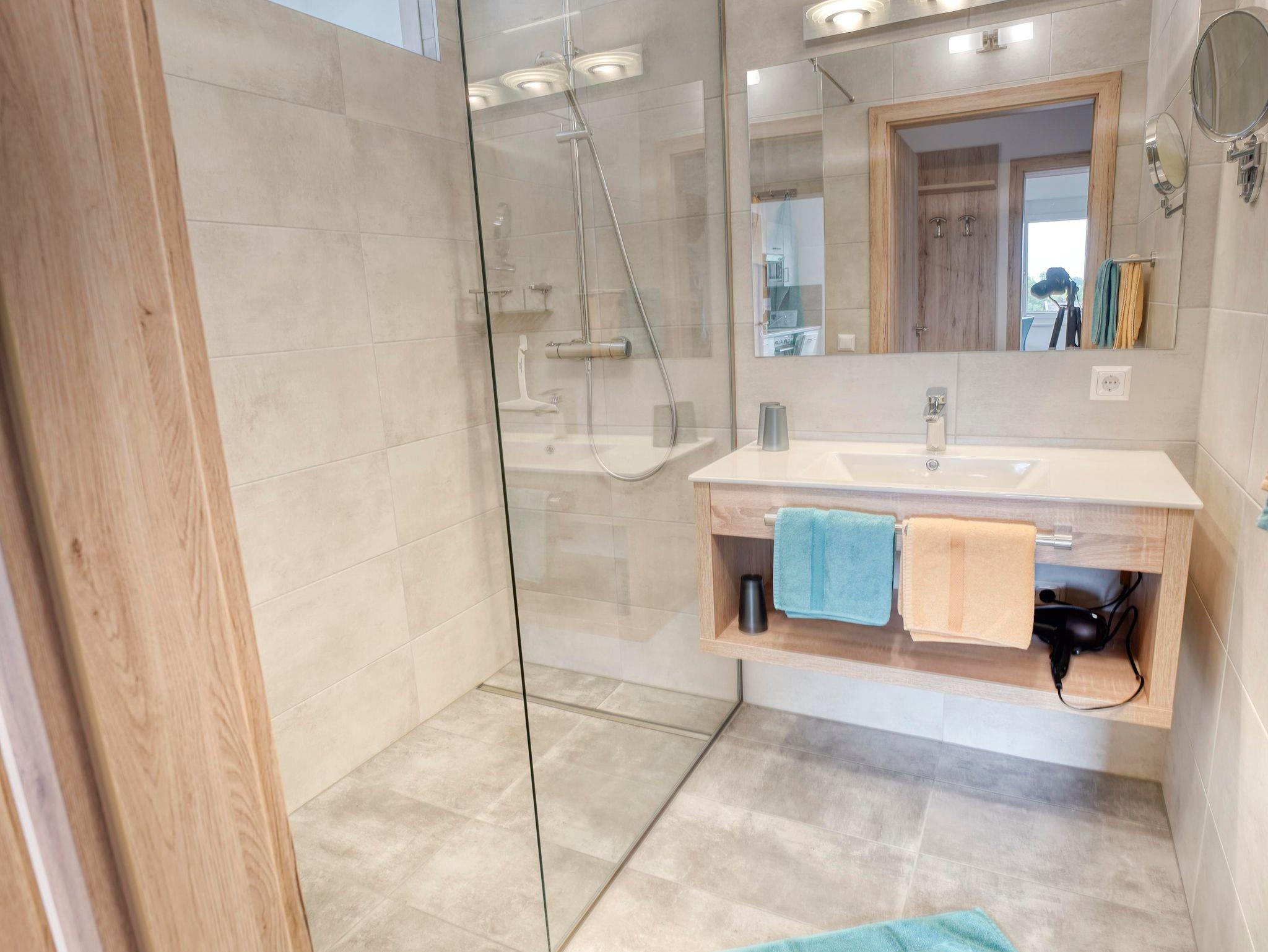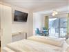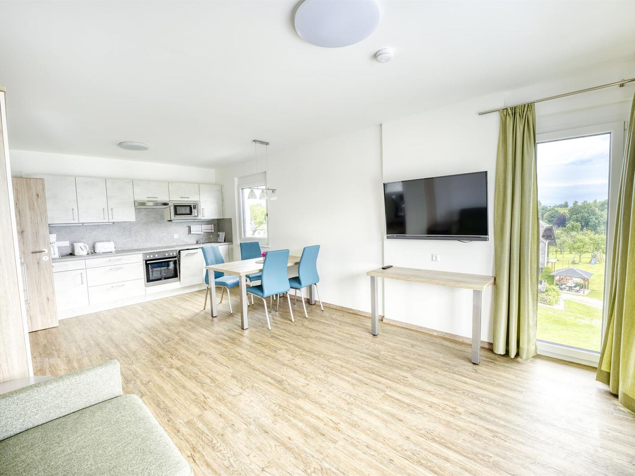 Unsere Ferienwohnung im Haus 1, ist mit 1 Wohnschlafraum, Küchenzeile - komplett eingerichtet mit Geschirrspüler Backrohr, Ceranfeld, Wasserkocher, Toaster und Kaffeefiltermaschine, Dusche, WC, Sat-TV, gratis WLAN und Balkon. Bade- und Handtücher, Bett und Tischwäsche sind vorhanden. Eigener Badestrand!