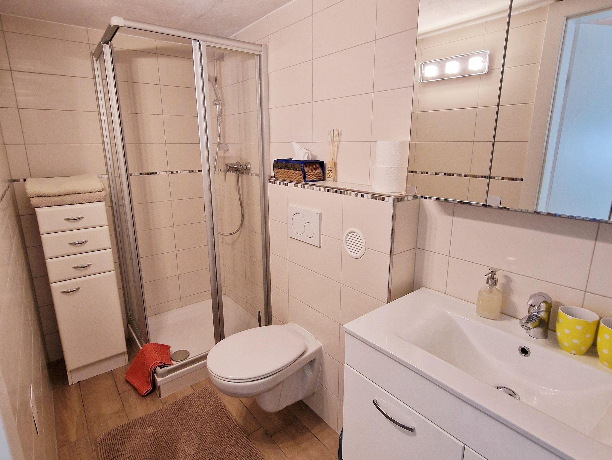 Vom Küchenbereich erreicht man das modern eingerichtete Bad/WC mit Dusche und Waschbecken.