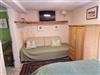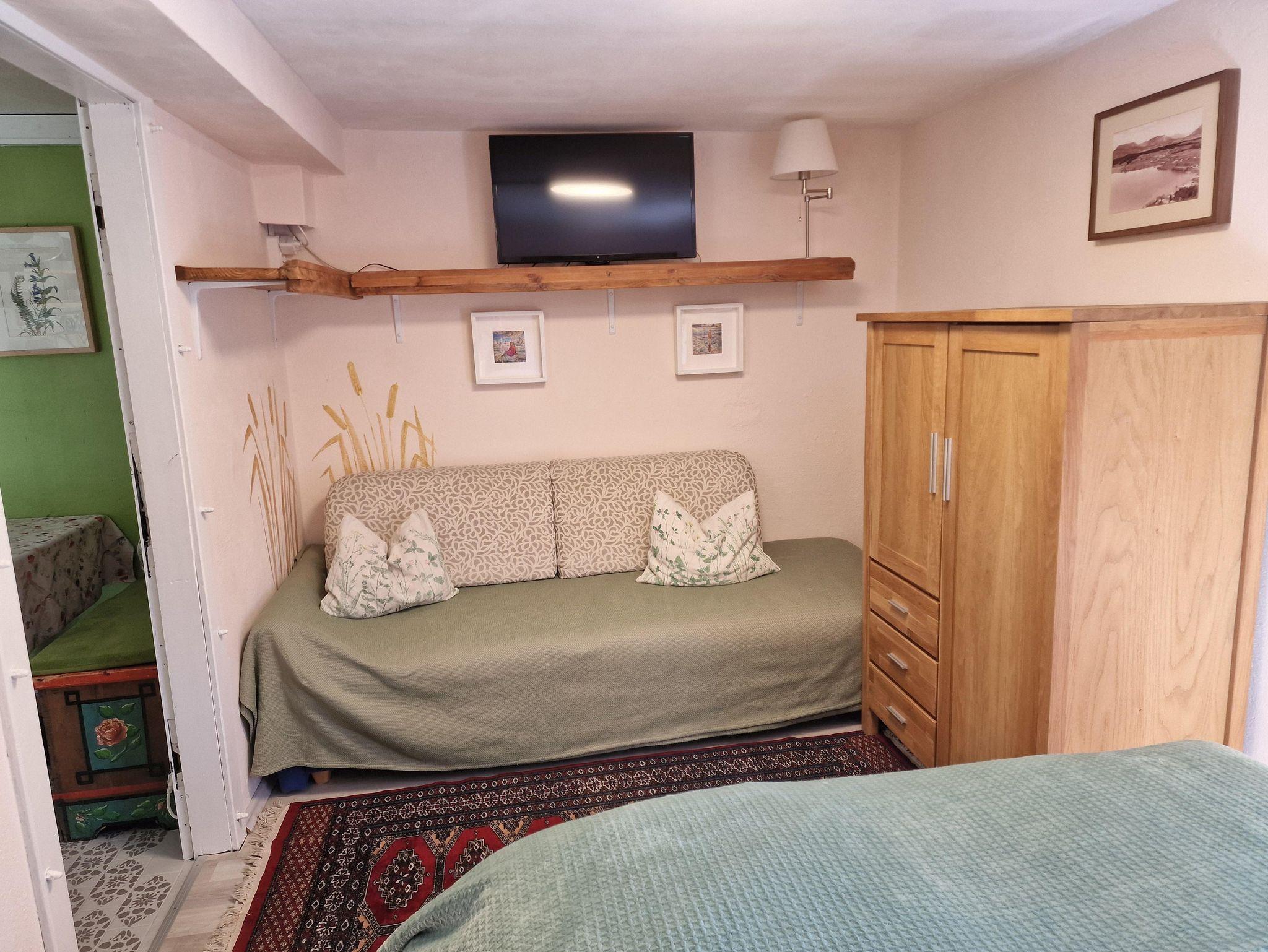 Durch eine Tür gelangt man in den Wohn-Schlafbereich. Die Einrichtung ist überschaubar und umfasst ein 140x200 cm Bett, eine ausziehbare Couch und einen Fernseher.