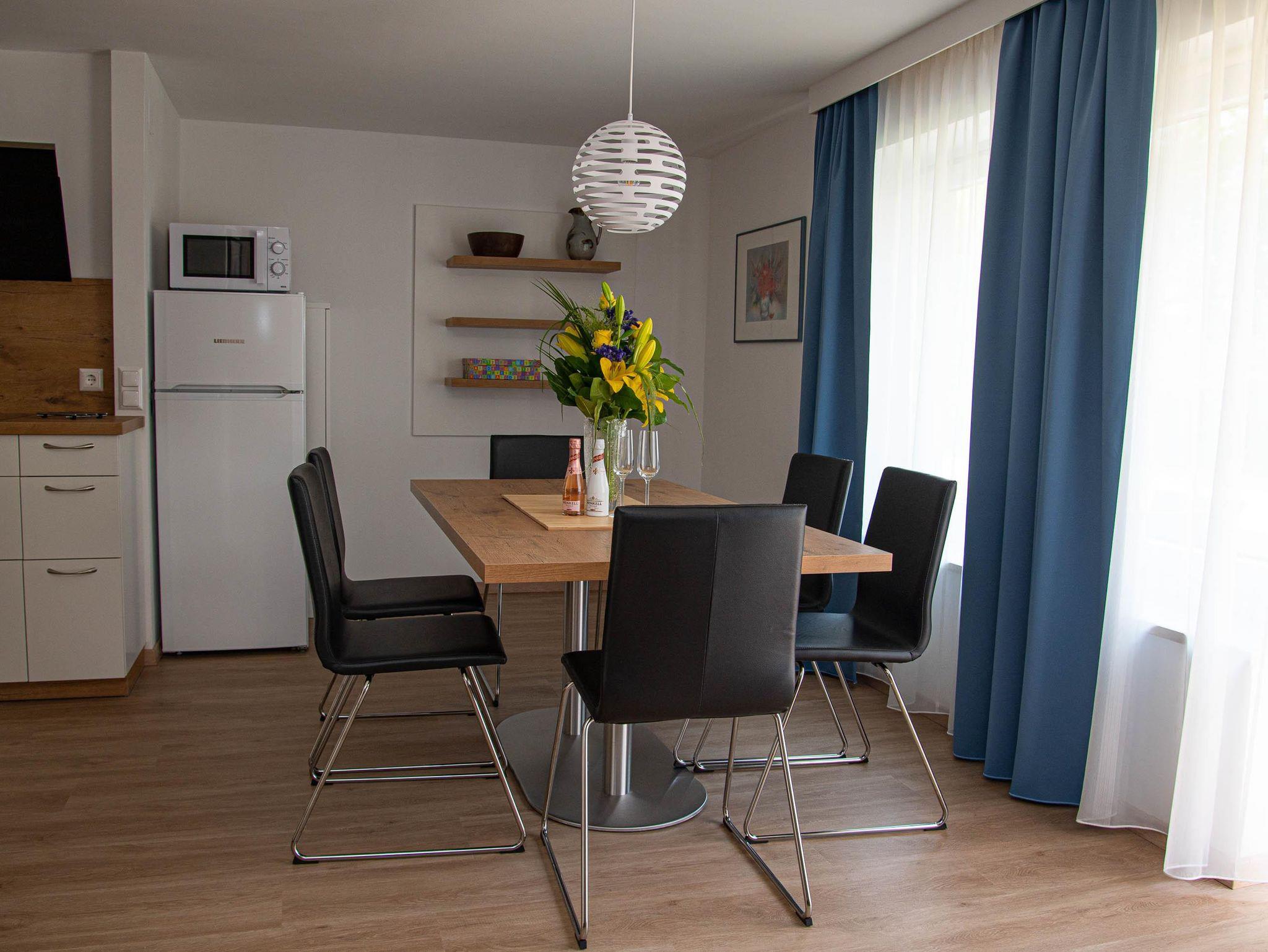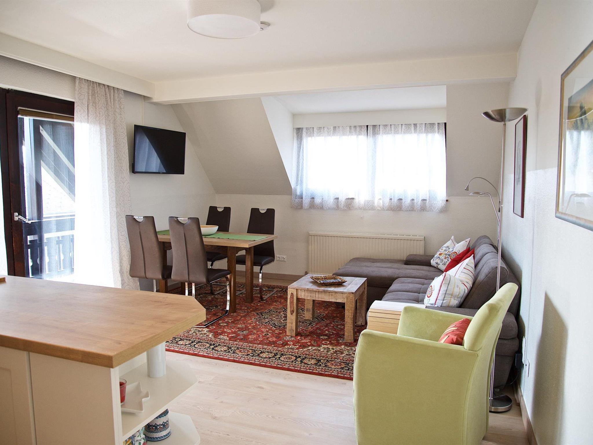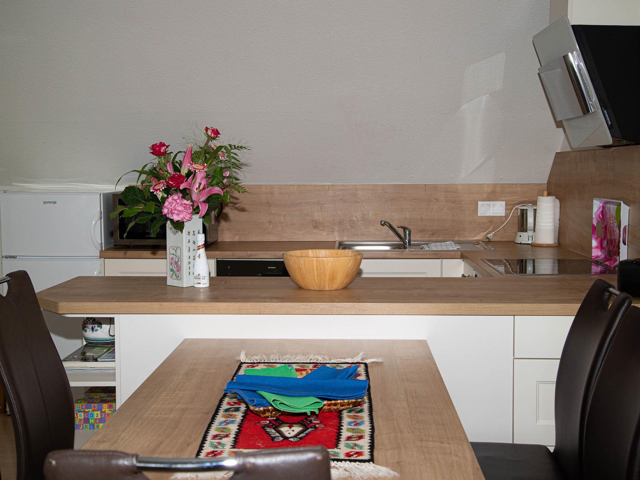 Eine großzügige Wohnküche mit Balkon, zwei Schlafzimmer, zwei Schlafcouchen im Wohnzimmer, zwei Duschen mit WC & ein Fernseher.
