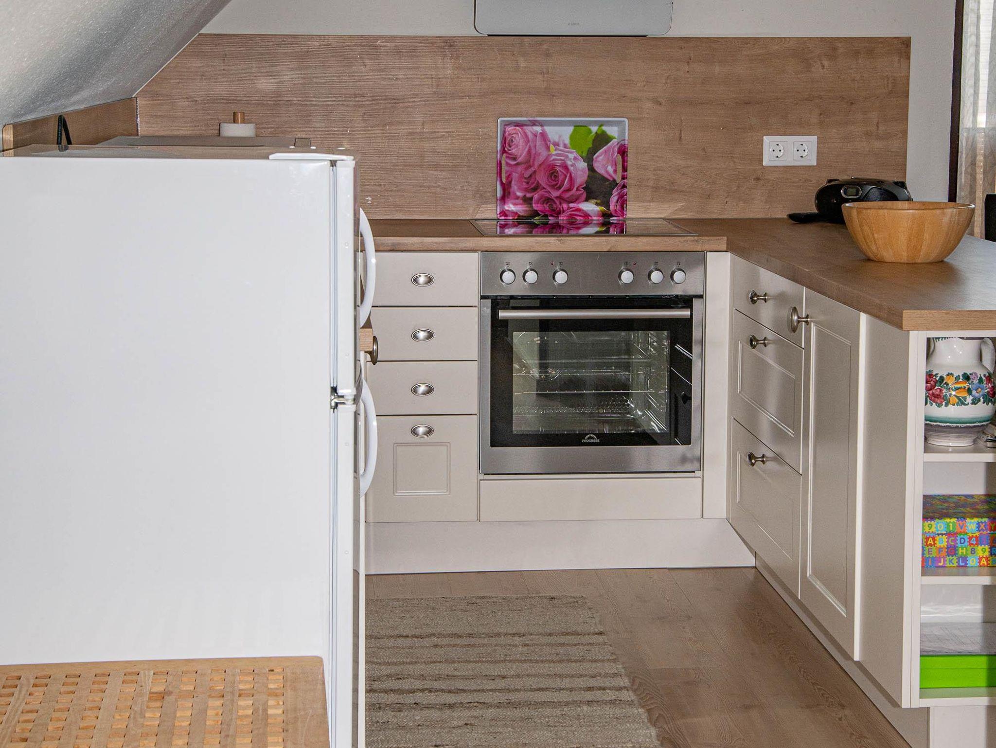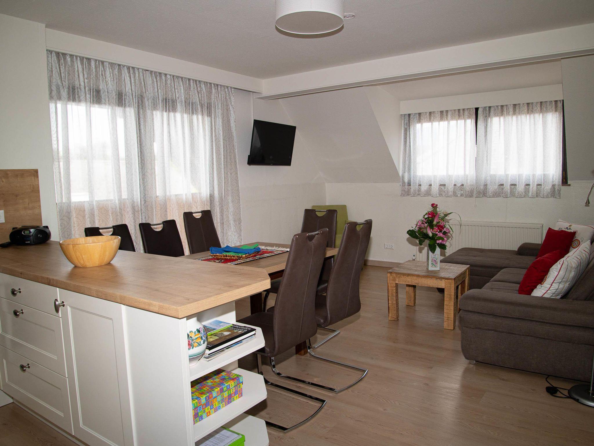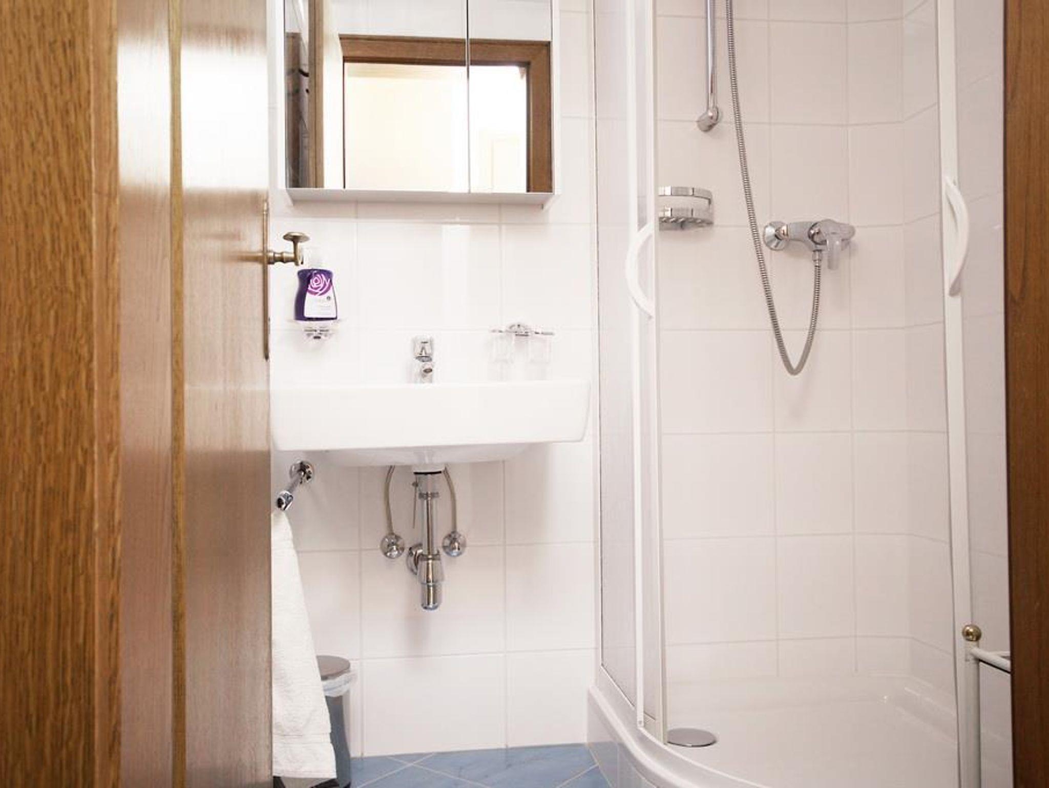 Eine großzügige Wohnküche mit Balkon, zwei Schlafzimmer, zwei Schlafcouchen im Wohnzimmer, zwei Duschen mit WC & ein Fernseher.