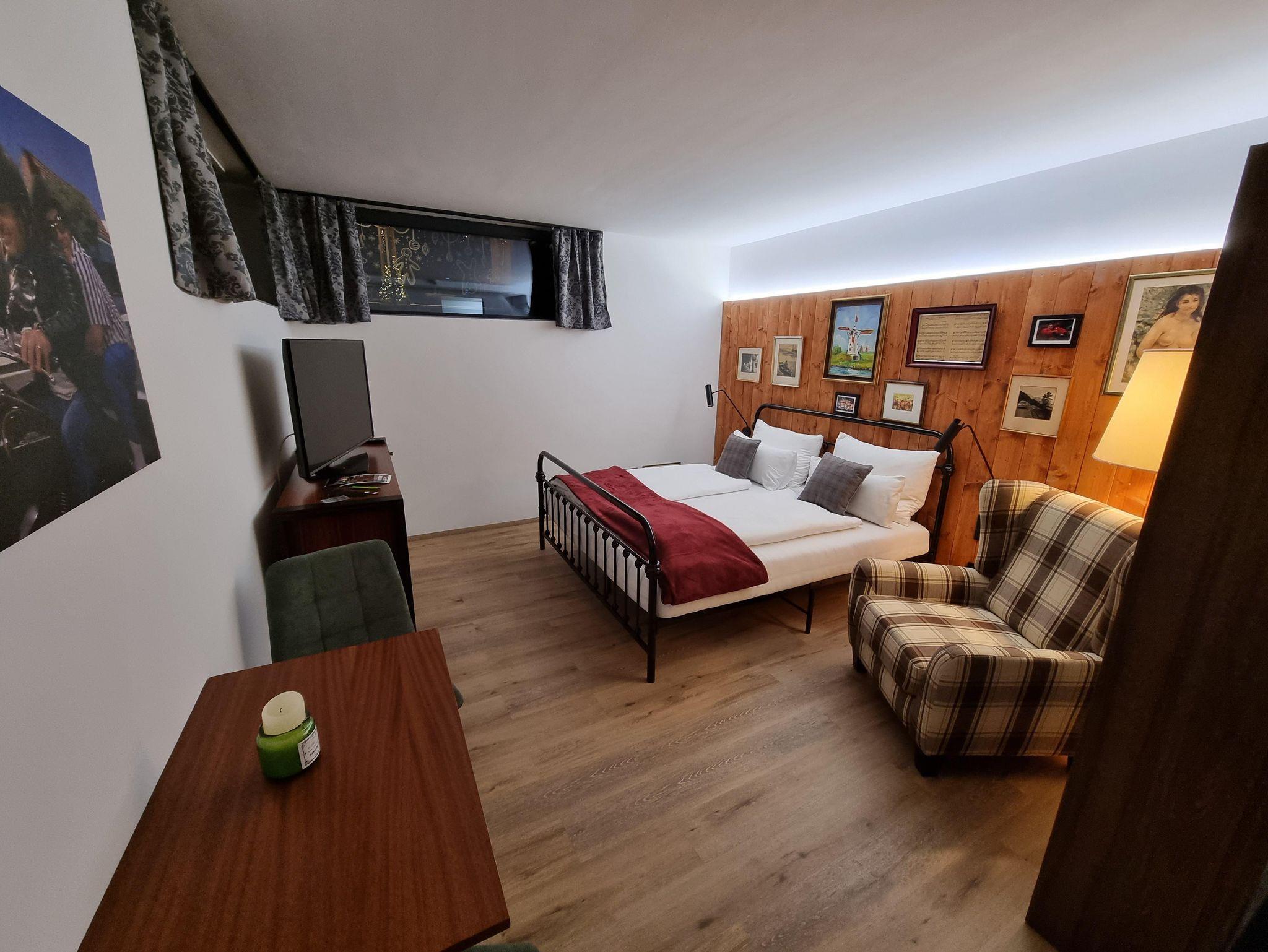 Studio Themenpppartement Spooner, das Appartement ist im Souterrain gelegen und verfügt über einen Vorraum, Bad mit Dusche / WC, 1 Schlafzimmer mit einem Doppelbett 180 x 200, Küche, Raumteilerschrank, Kellerraum für Ski- bzw. Fahrräder (Allgemeinfläche).