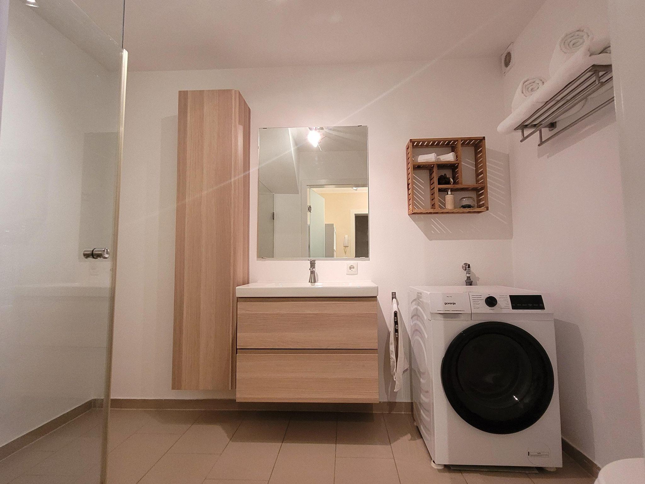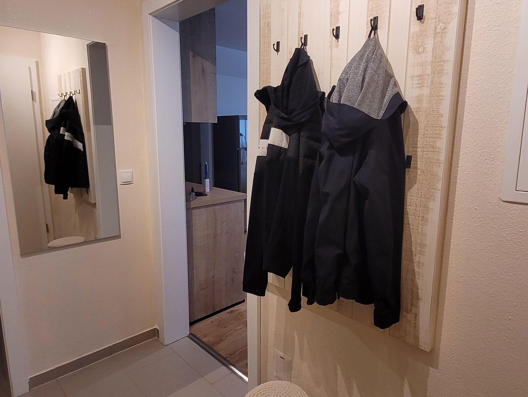 Das Bad verfügt über eine Dusche, ein WC, ein Waschbecken und einen Waschtrockner inkl. Waschmittel, Bügeleisen inkl. Bügelbrett. Im Eingangsbereich ist neben einer gemütlichen Garderobe auch ein kleiner Abstellraum für Koffer,... etc. zu finden.