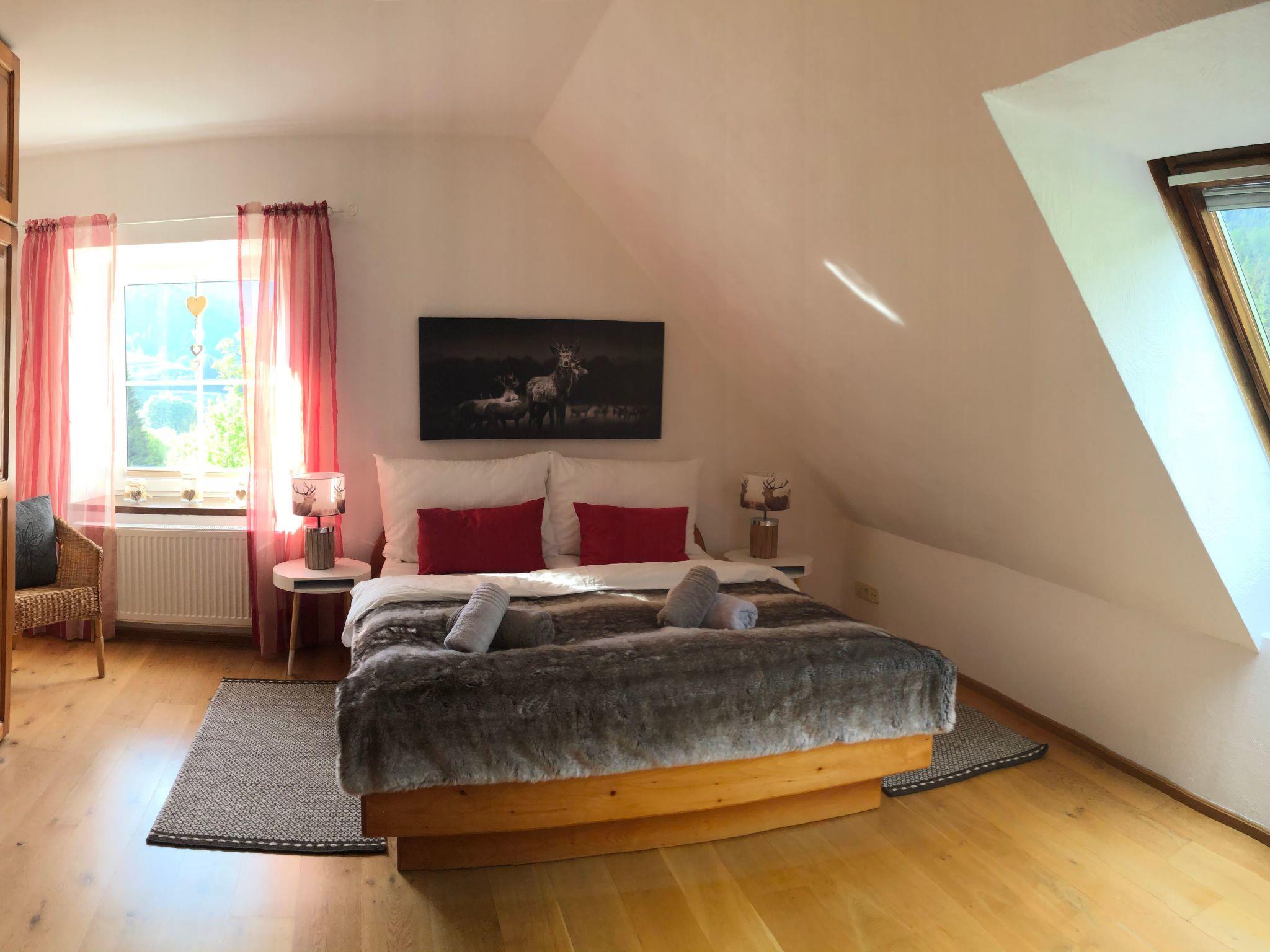 The approx. 200 m² accommodation is very cosily furnished and has a wonderful, comfortable atmosphere that invites you to enjoy yourself. When renovating the house, the landlord took great care to ensure that the charm of the old house was not lost and thus combined the old, rustic ambience with new, modern accents. On the ground floor is the fully equipped kitchen (dishwasher, oven with oven, fridge with freezer compartment, kettle, coffee machine and milk frother) with dining area and access to the terrace. The living room with satellite flat-screen TV, DVD player and record player has a pull-out sofa set. Some board games can be found in the rustic wall panelling with the landlord's trophies. A separate toilet, a room with washing machine and tumble dryer and a bathroom with bath, shower and washbasin with hairdryer are located on the ground floor. On the 1st floor there are 3 bedrooms, a bathroom with toilet and shower. Bedroom I "Morgenröte" with double bed (180 cm), bedroom II "Wildererkammerl" with double bed (160 cm) and pull-out sofa, bedroom III "Single-Sing-Sing" with single bed and pull-out sofa. A steep wooden staircase leads from bedroom "Morgenröte" to bedroom IV "Himmelstürmer" with a solid wood double bed. On the ground floor, in an elongated low building, is the "playroom" with billiards, table football and dartboard as well as the shoe dryer and cloakroom. Adjacent to the "playroom" is the "wellness" area with toilet, a bathroom with shower and washbasin, a kitchen and the combined area with double bed and sauna. The conservatory with coffee table and view of the pool is located in front of this area. The entire house can be heated with central heating. WLAN reception is available in all rooms and on the terrace.