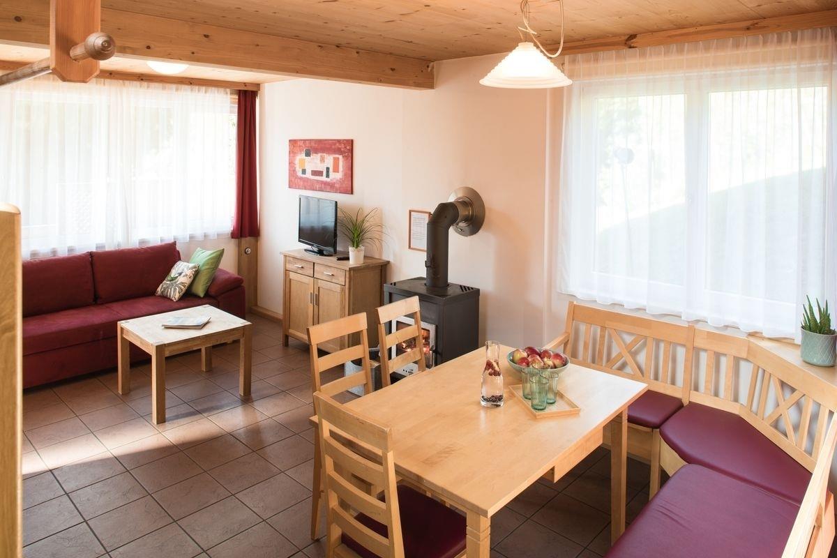Der Wohnbereich mit Schwedenofen, Esstisch und SAT-TV schafft eine warme Atmosphäre, während die voll ausgestattete Küche alles bietet, was du für gemeinsame Mahlzeiten brauchst. Nach einem aktiven Tag auf der Piste lädt die hauseigene Sauna zum Entspannen ein.