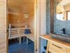 Stueetage: (Stue(Fjernsyn, sofahjørne), Køkken(komfur(Komfur med fire kogeplader, glaskeramisk), kaffemaskine(kopper), ovn, opvaskemaskine , køle-fryseskab, håndvask), soveværelse(dobbeltseng), soveværelse(dobbeltseng), soveværelse(dobbeltseng), badeværelse(bruser, håndvask), badeværelse(håndvask, toilet), badeværelse(håndvask, toilet), badeværelse(bruser, håndvask), badeværelse(badekar, håndvask)) sauna, terrasse, have, grill, parkering, swimmingpool(naturlig svømmedam)